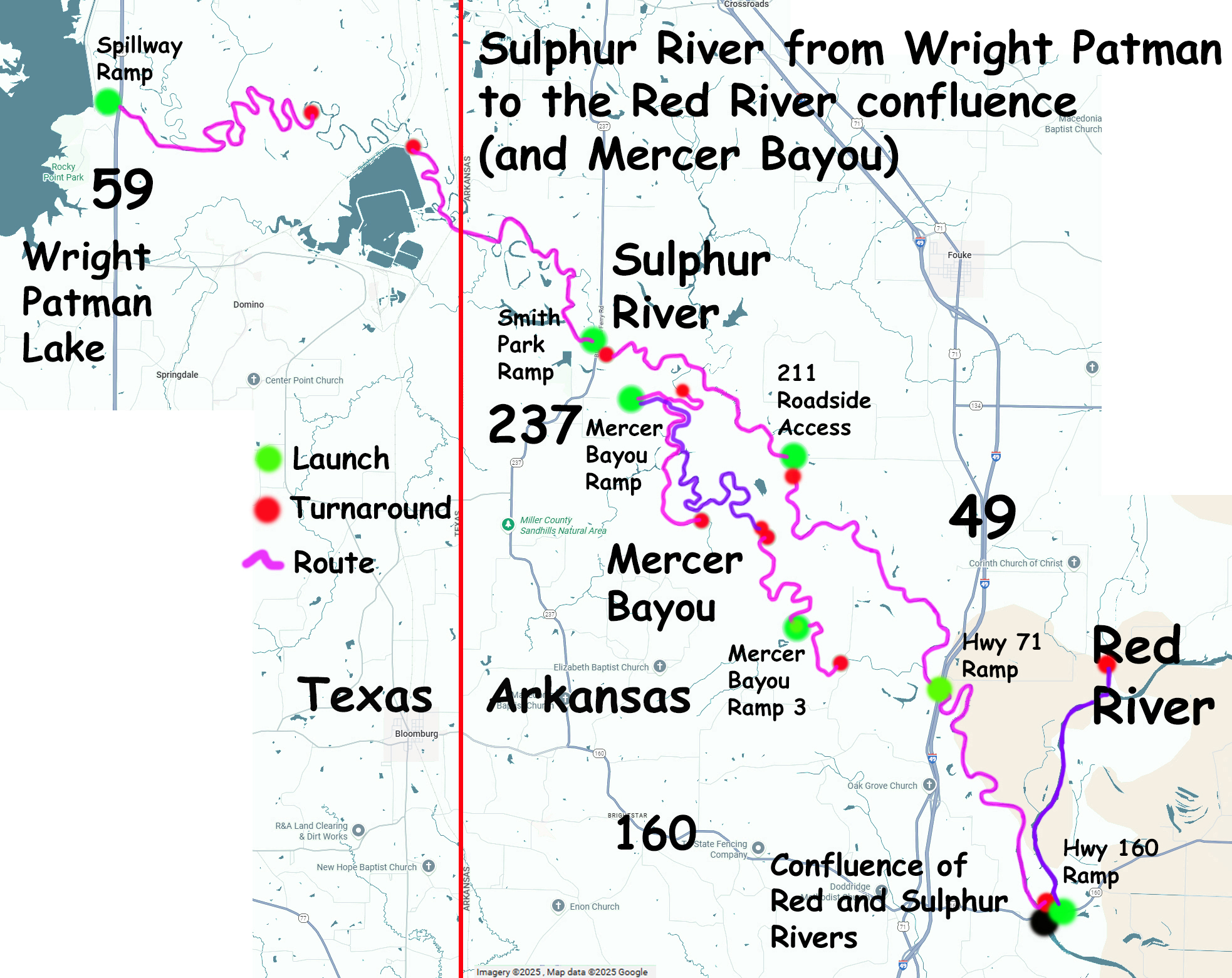 Above: Section by section kayak paddle trail route map on the Sulphur River between the Wright Patman spillway and the Red River (the trip just below the spillway is in Texas but included here). Also some trips in Mercer Bayou. All trips are out and backs. Click to expand map.