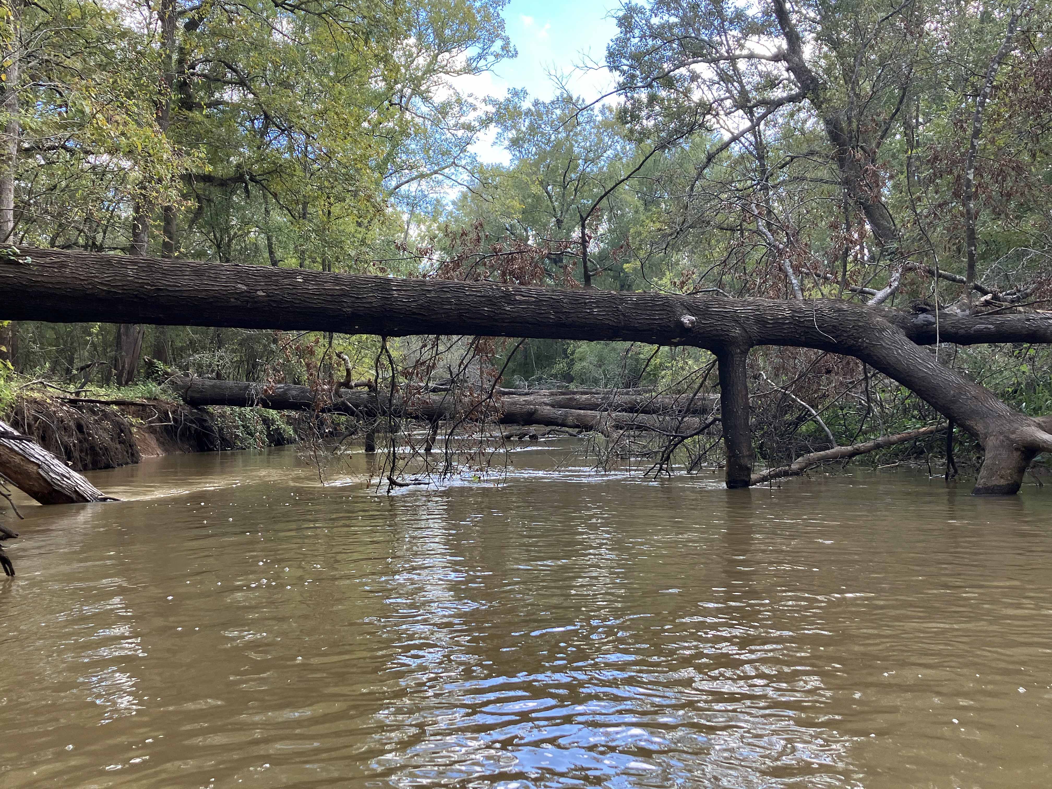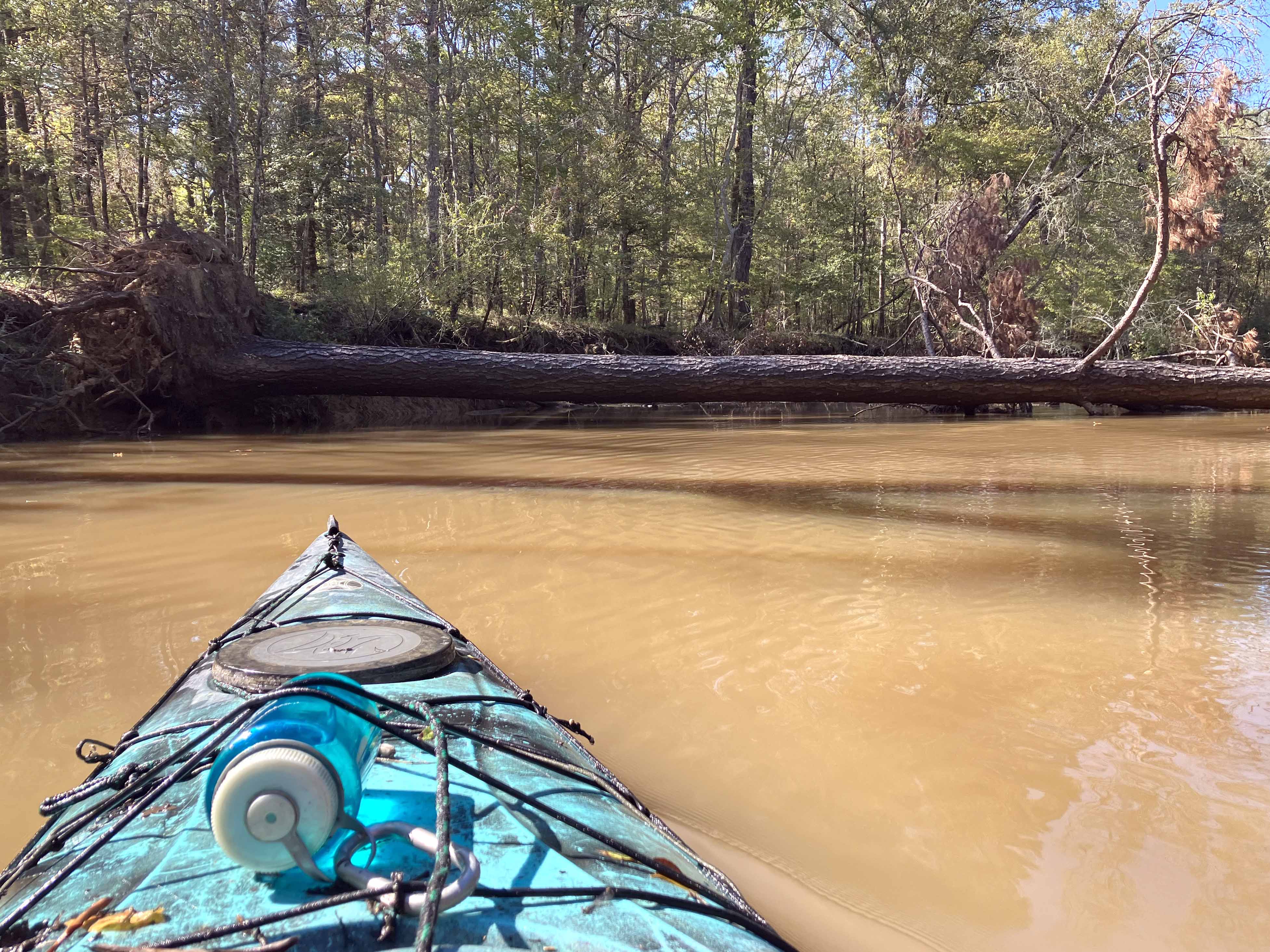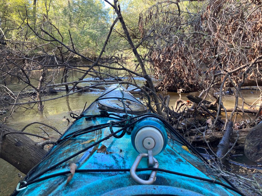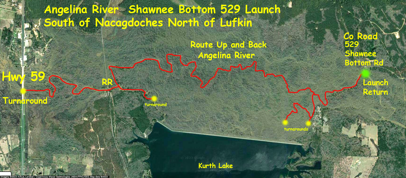 The kayak route map above starts at a launch site along Co Rd 529 Shawnee Bottom Road south of Nacogdoches Texas. It was actually the turnaround point for another route that launched downstream at Co Rd 539. It takes a while to get to the 529 launch as its rather out of the way. The route is an out and back that goes west, picking its way along the Angelina to the Highway 59 turnaround. This was a challenging paddle, quite a few portages and go-arounds and up-and-overs, as the pictures below demonstrate. The map shows a few side channel ventures and turn around points. Around one turn of the river I encountered a camouflaged bowhunter in the woods. The exchange went like this, I said, “Hi”, he said “Hi”.