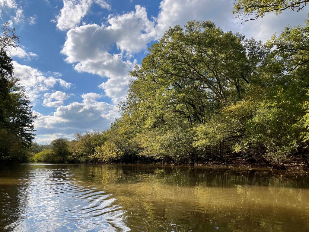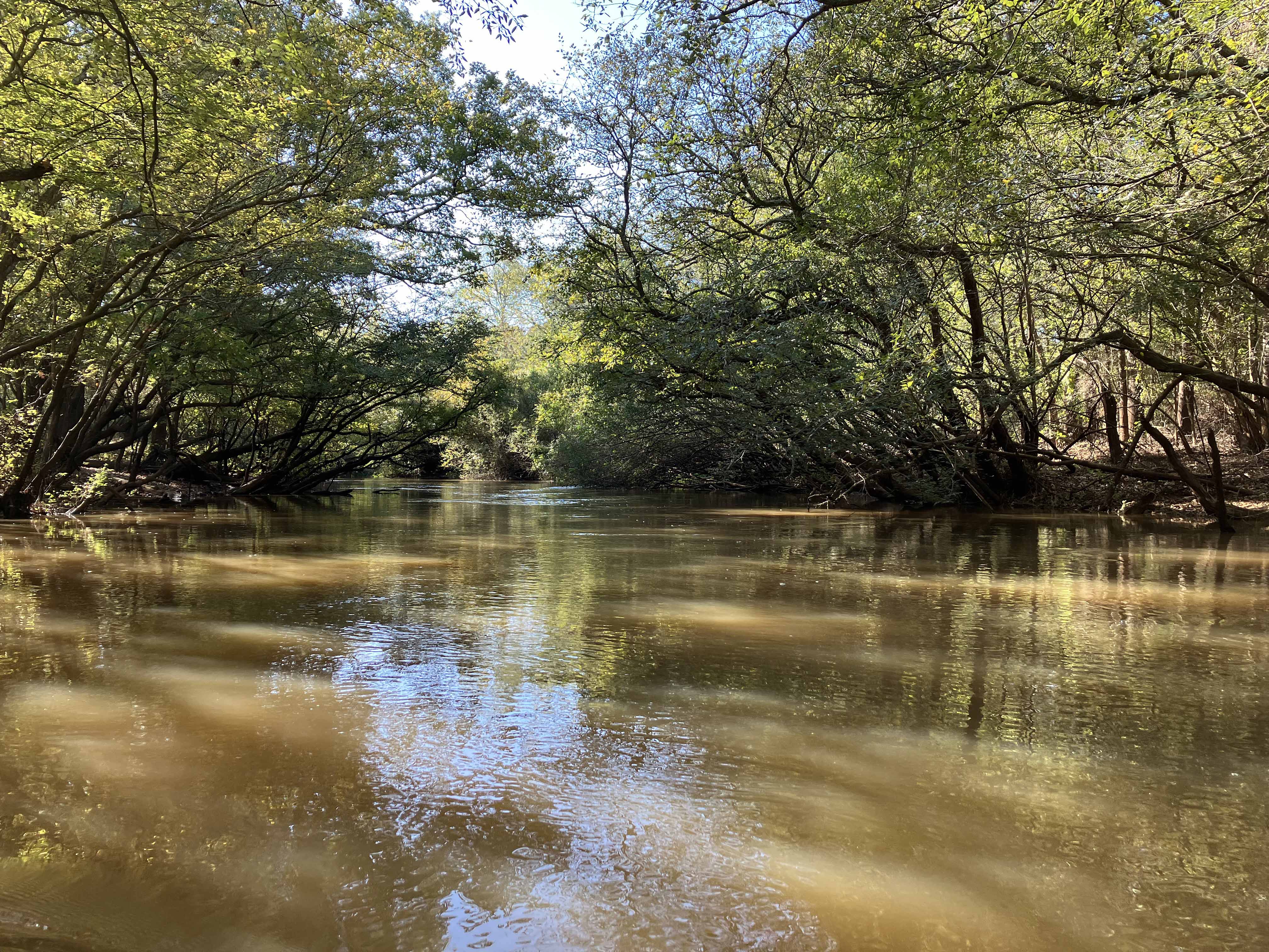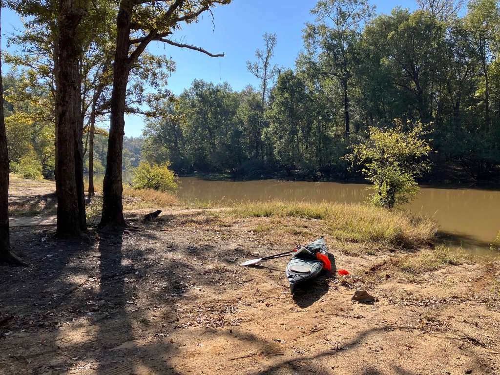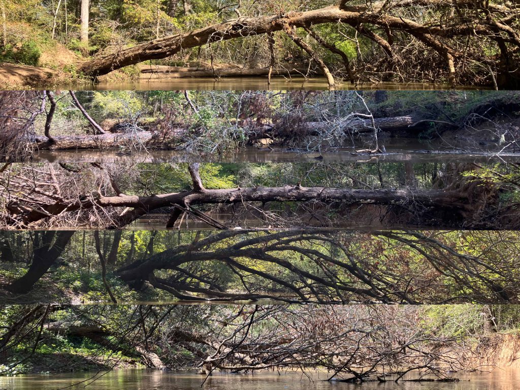 The kayak route map above starts at a launch site along Co Rd 529 Shawnee Bottom Road south of Nacogdoches Texas. It was actually the turnaround point for another route that launched downstream at Co Rd 539. It takes a while to get to the 529 launch as its rather out of the way. The route is an out and back that goes west, picking its way along the Angelina to the Highway 59 turnaround. This was a challenging paddle, quite a few portages and go-arounds and up-and-overs, as the pictures below demonstrate. The map shows a few side channel ventures and turn around points. Around one turn of the river I encountered a camouflaged bowhunter in the woods. The exchange went like this, I said, “Hi”, he said “Hi”.