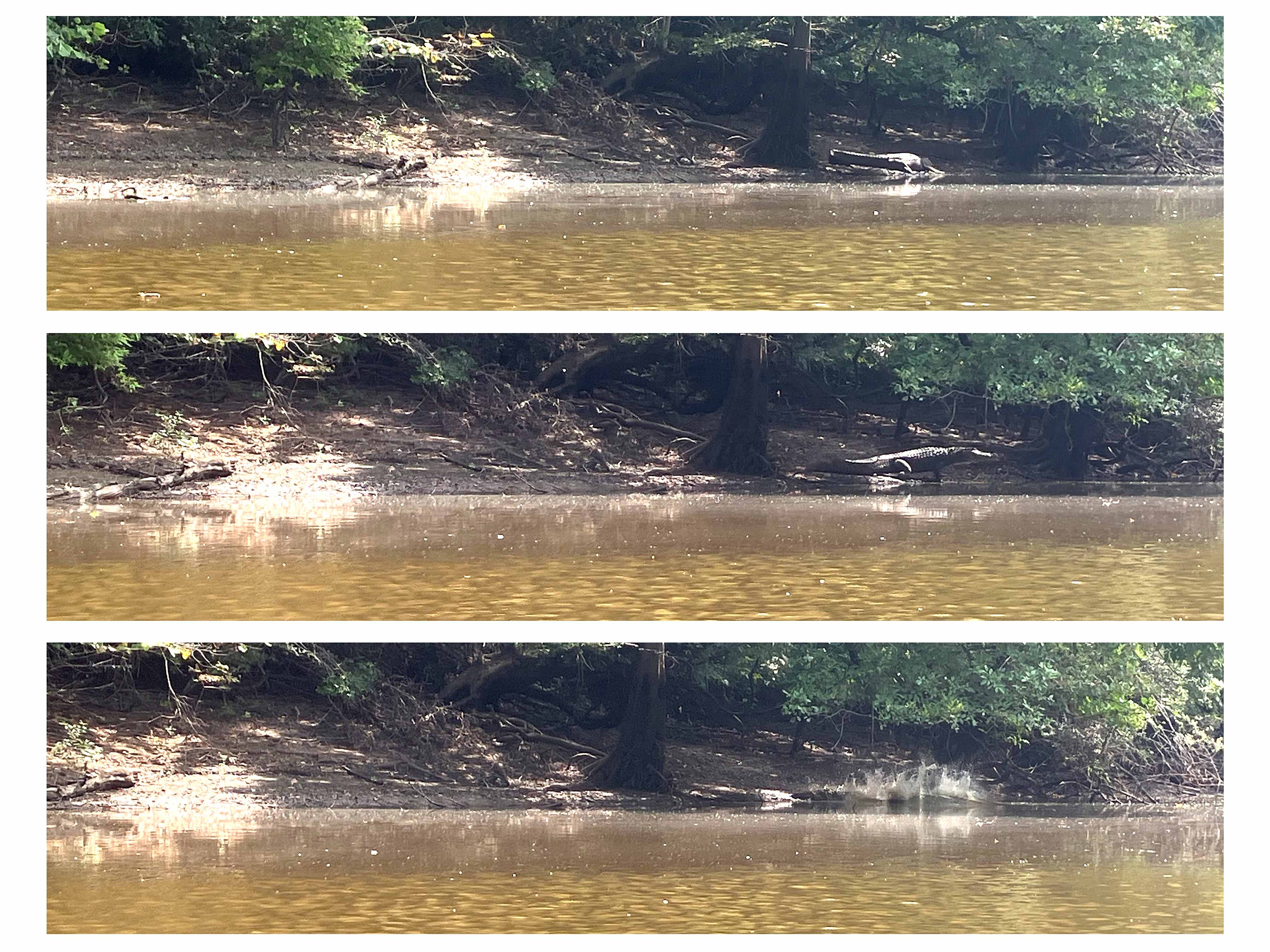 Above: Fairly large alligator resting in the shade launches itself into the water when I paddle by.
