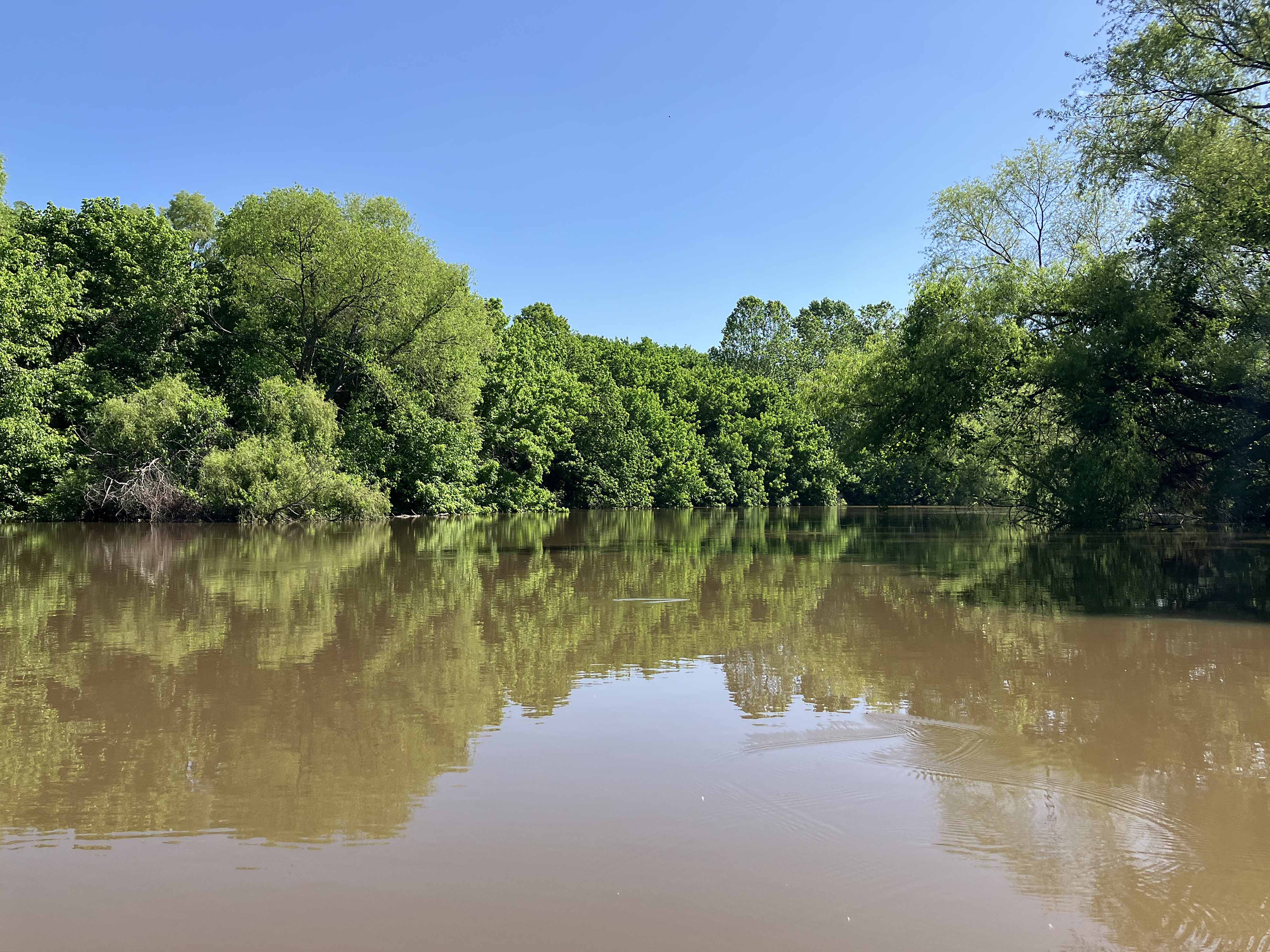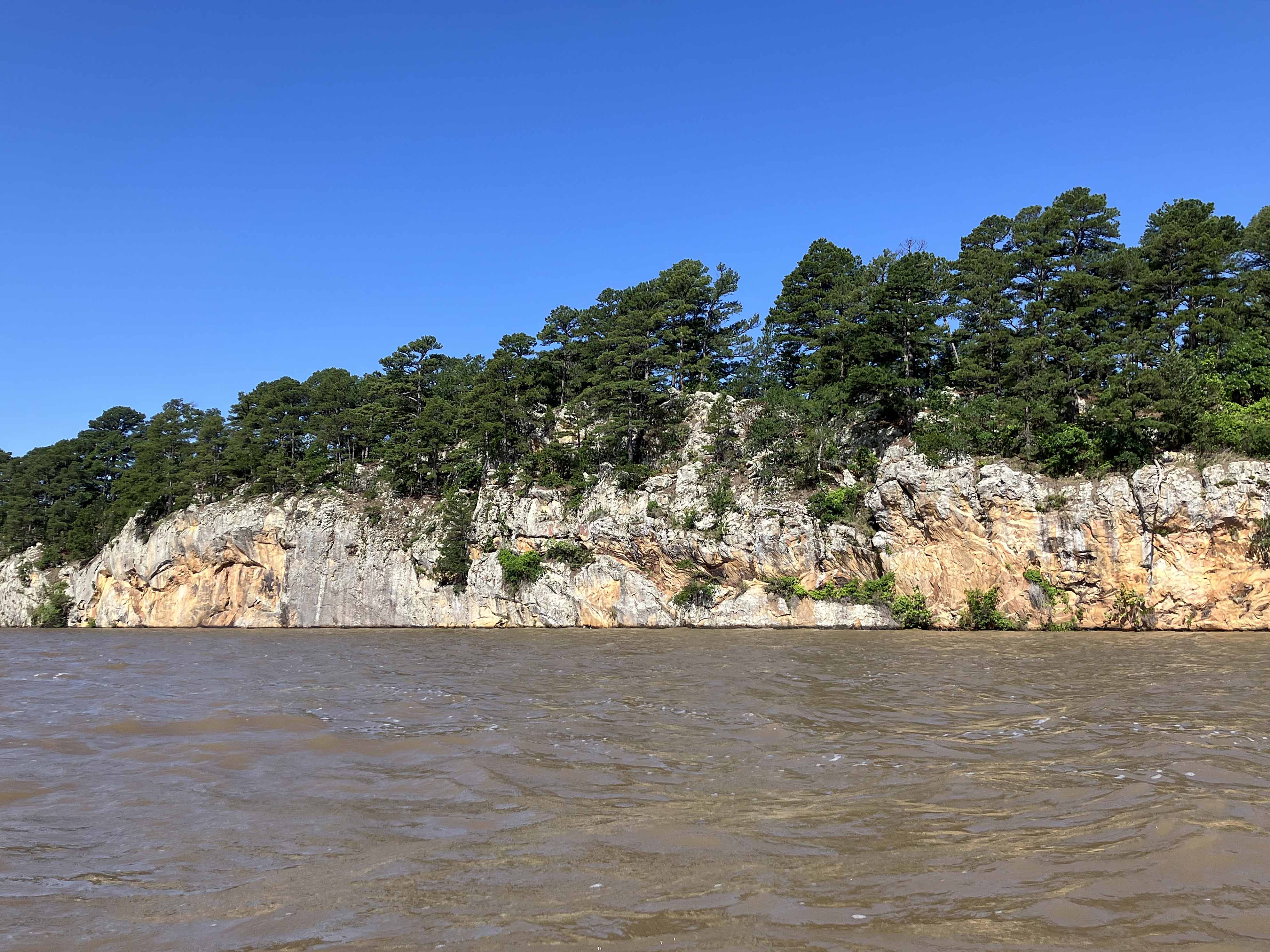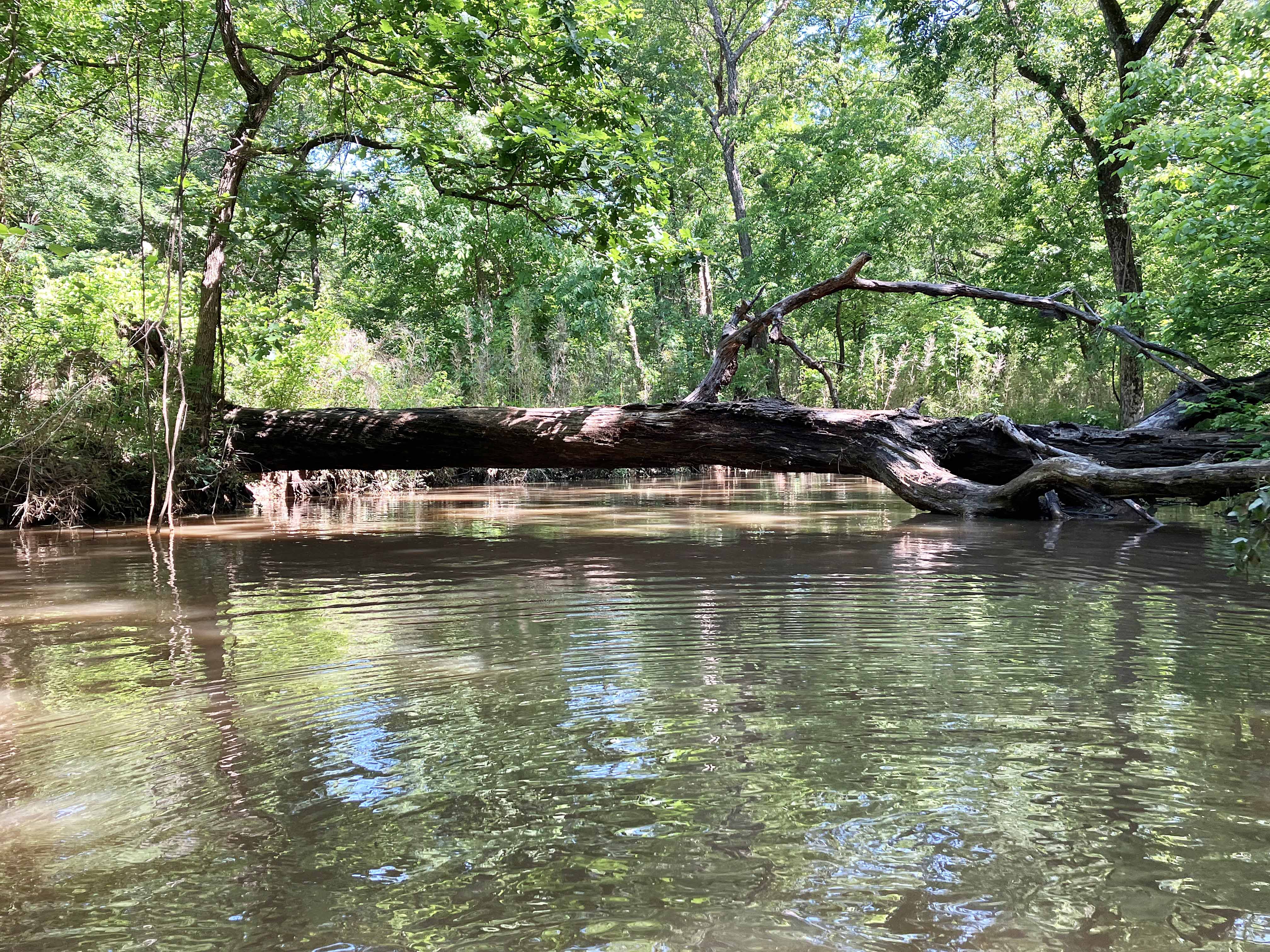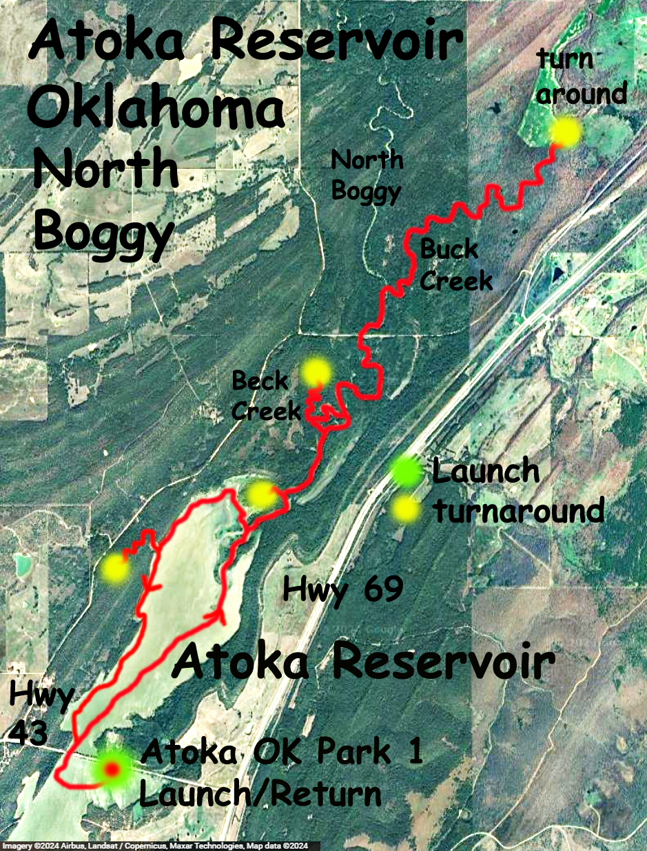 Atoka Lake, or Reservoir, in Oklahoma, is accessed by turning west from Highway 69 onto Highway 43 just north of Atoka and Stringtown. The turn is about a mile north of the correctional center, and the launch is on the left hand side of the road. From that launch I did a couple kayak trips, one of which shown on the map above. This one goes north into the North Boggy Creek and splits into Buck Creek. The open water part on the lake is fine enough, but I was surprised just how nice the North Boggy and Buck Creek sections were. Both felt like warm, relaxed, shady Southern rivers that you just eased your way along. At the turnaround point the gradient of Buck Creek increases and it becomes rockier and more shallow. Heard some deer barking and saw a fine looking coyote.