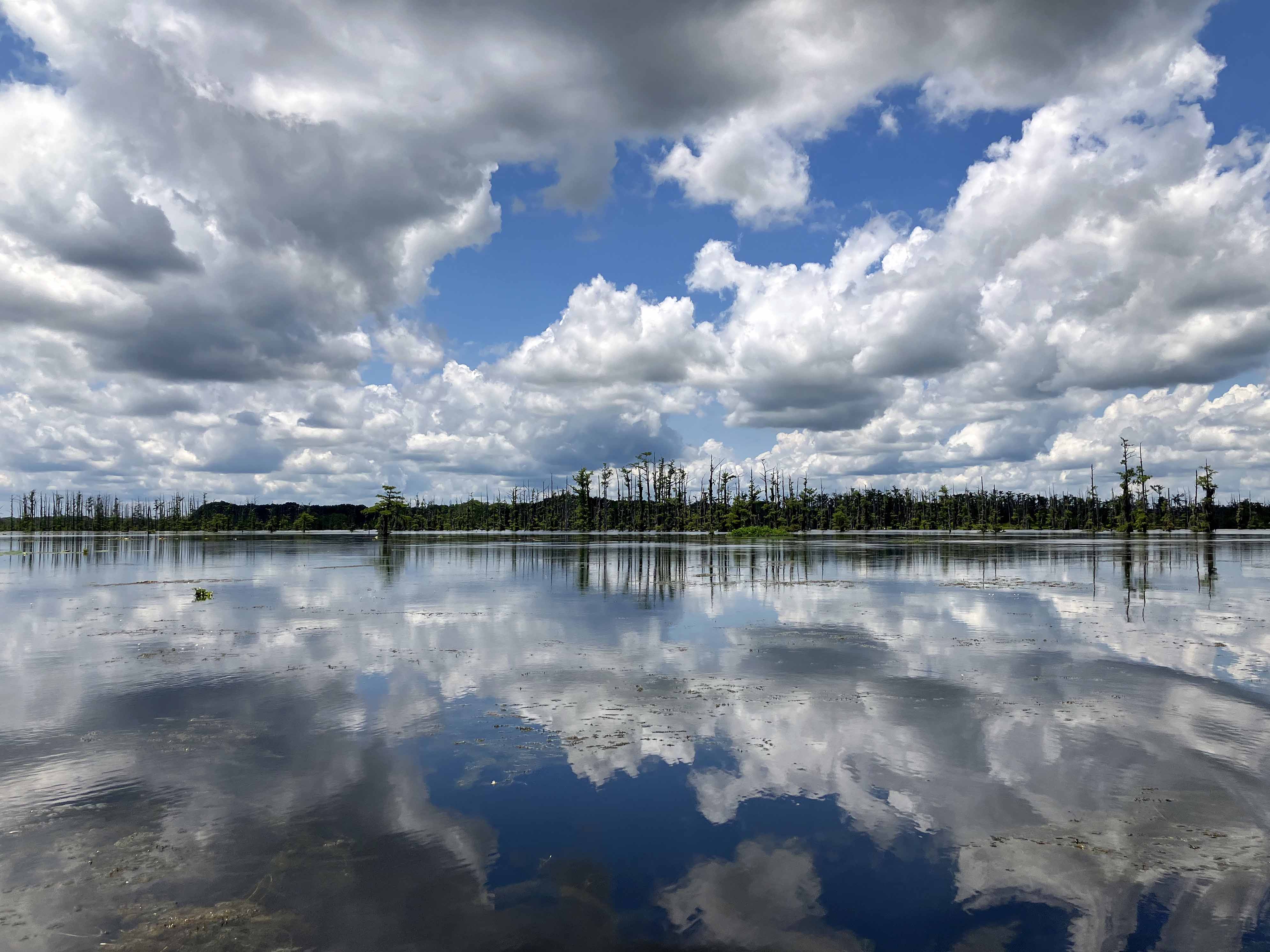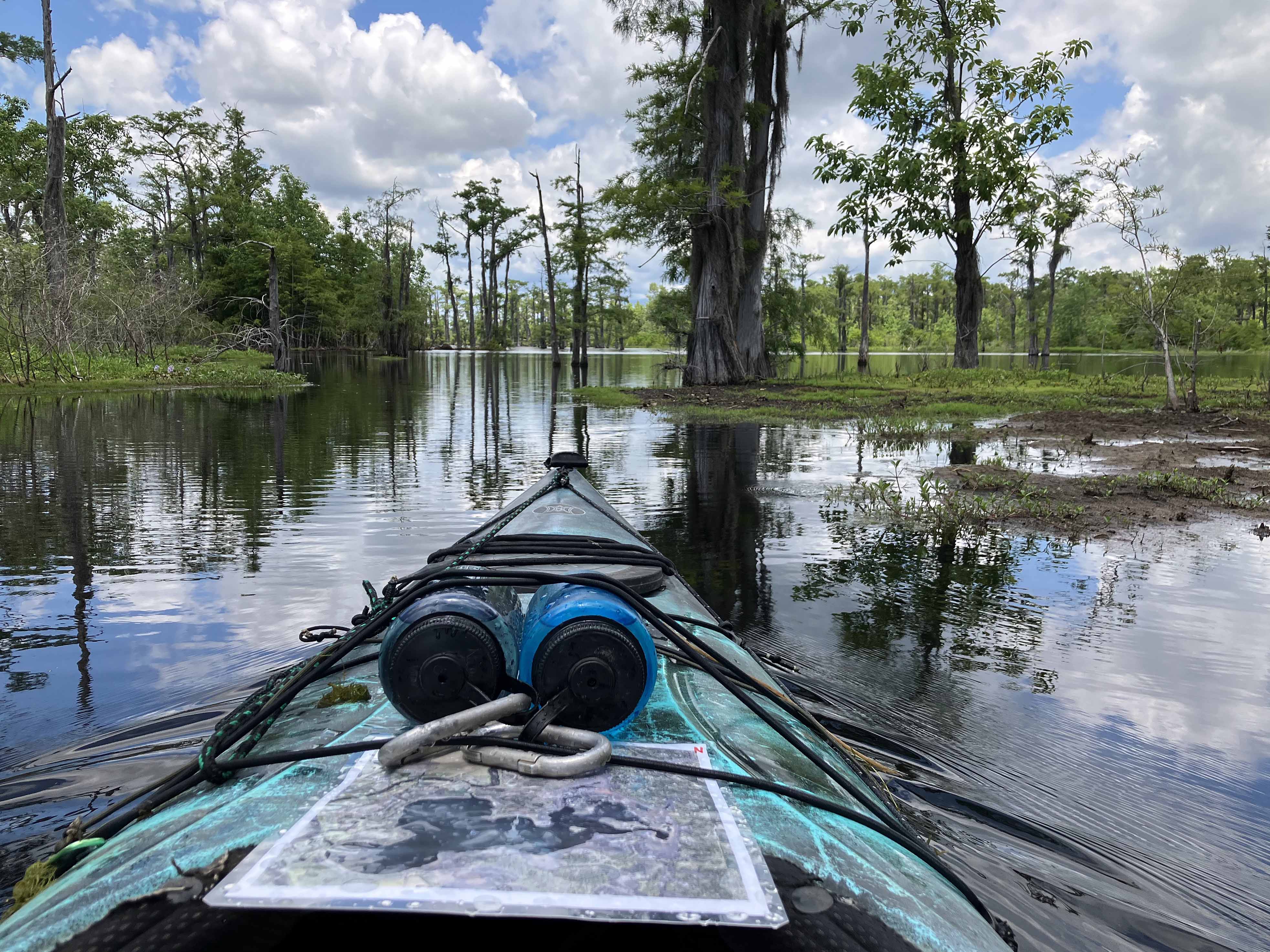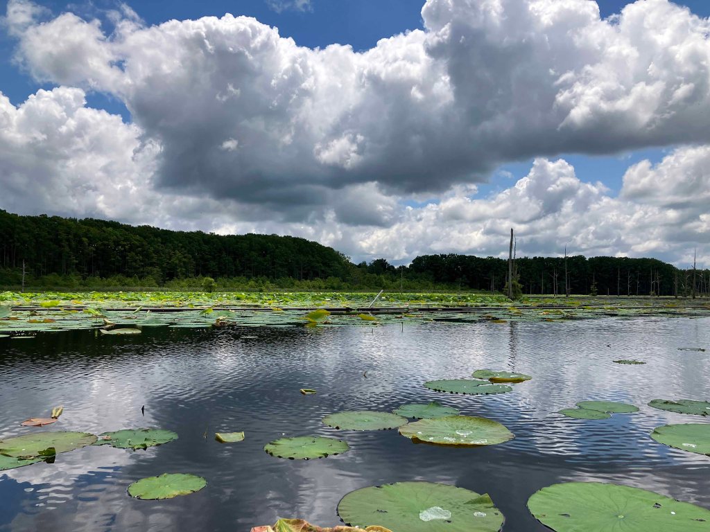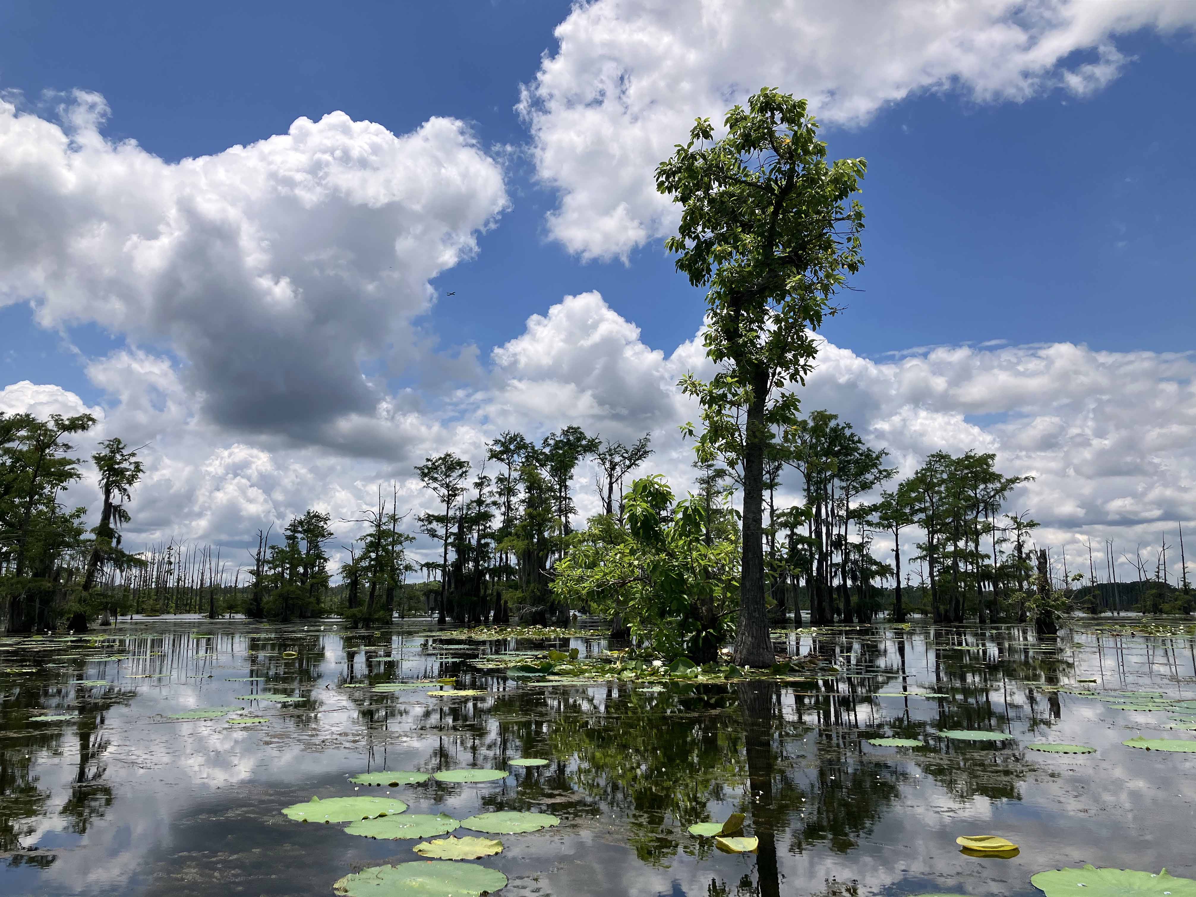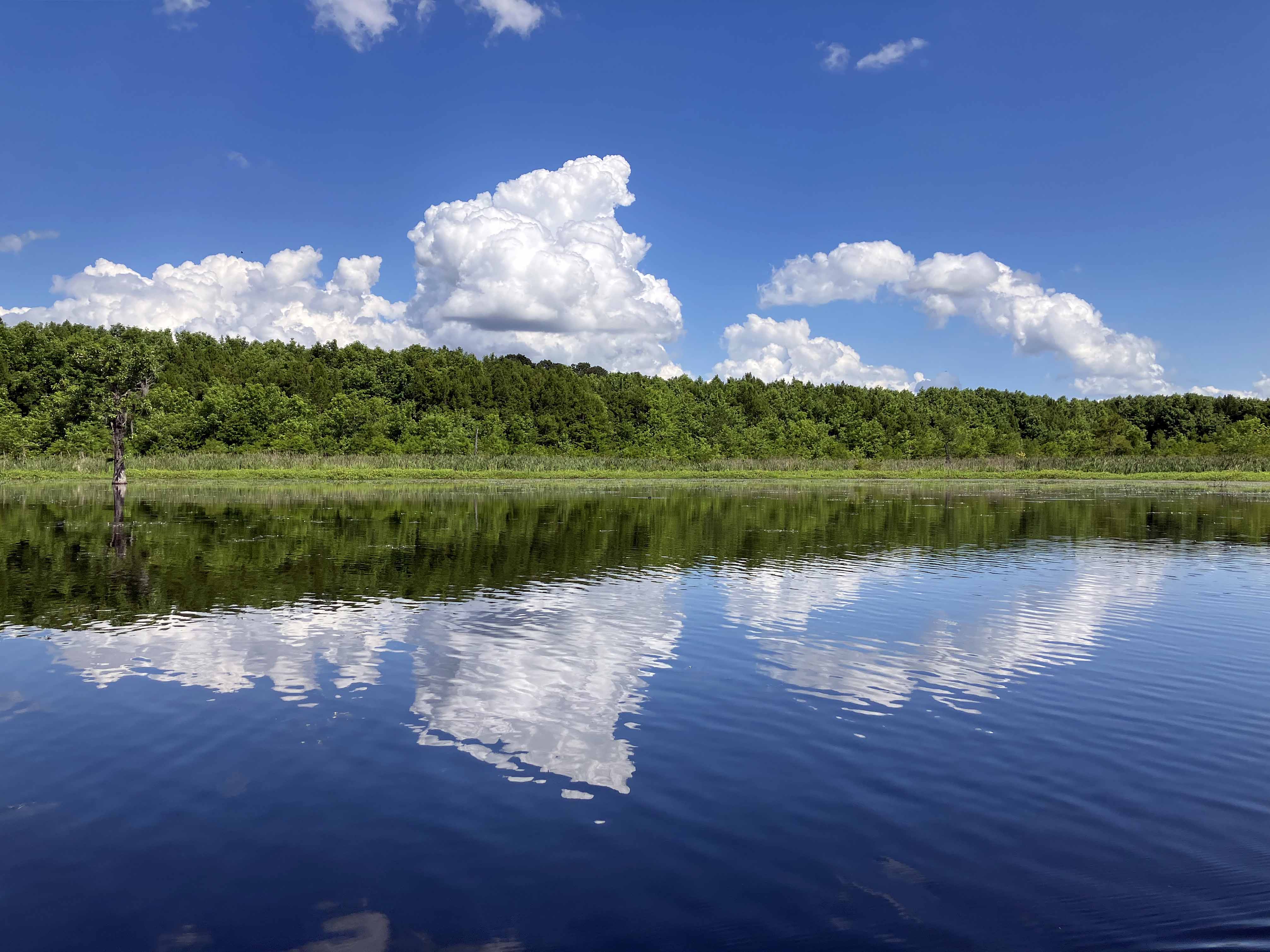 The kayak route in the above map explores the Black Bayou Lake NWR just north of Monroe, Louisiana. This is another option among many in the Monroe area including Corney Bayou, Chemin-A-Haut, and D’Arbonne NWR. The NWR has a launch at the north side close to the visitors center and you paddle out a long corridor formed by the lilies to get into the main lake. Some of the areas to the northeast were either off limits or were heavily congested with invasive vegetation. Still, there were quite a few nooks and crannies to investigate, and you can paddle out into the large lake portion of the refuge to the west. I had several alligator sightings, and the sky for this trip was spectacular.