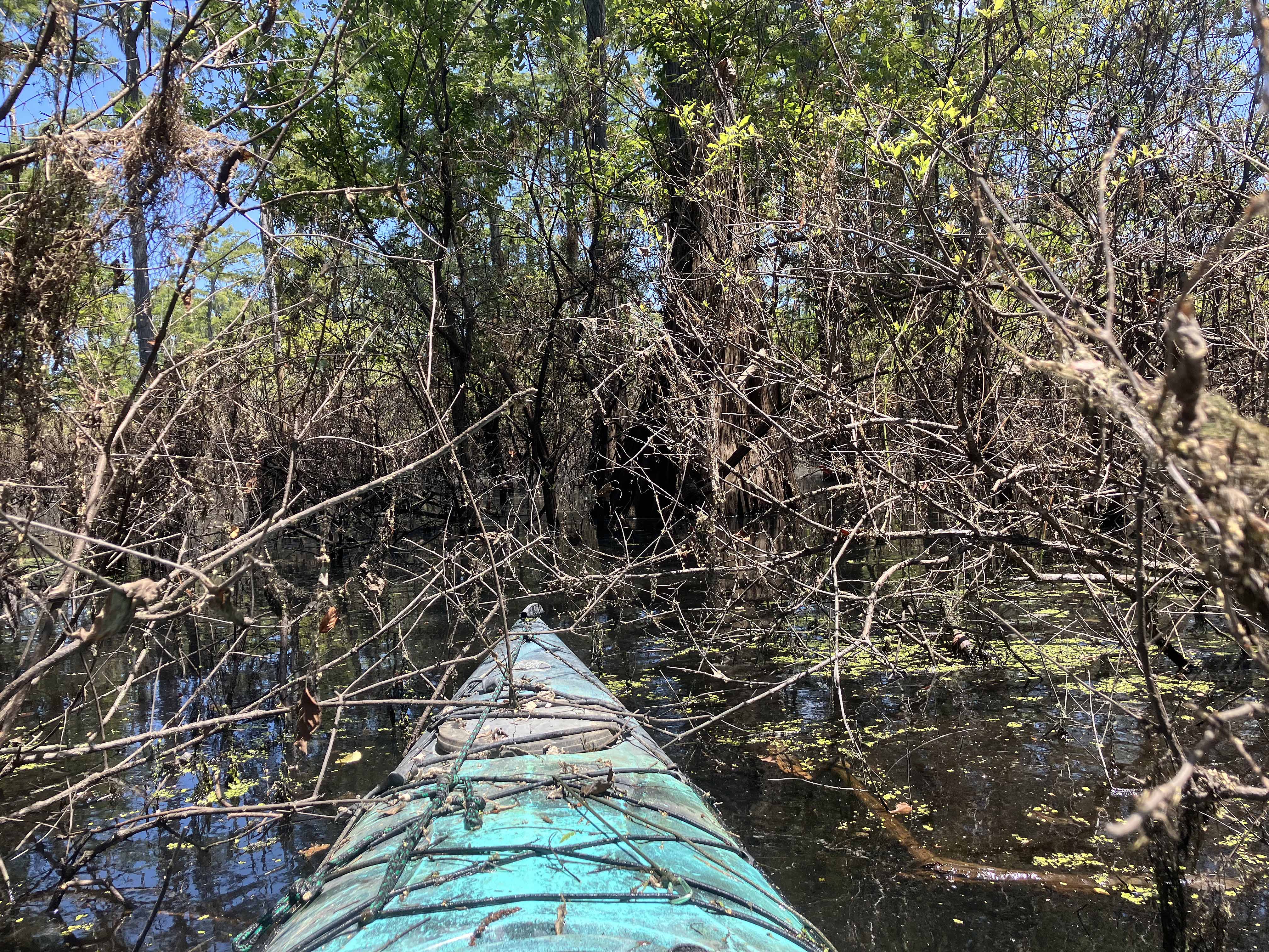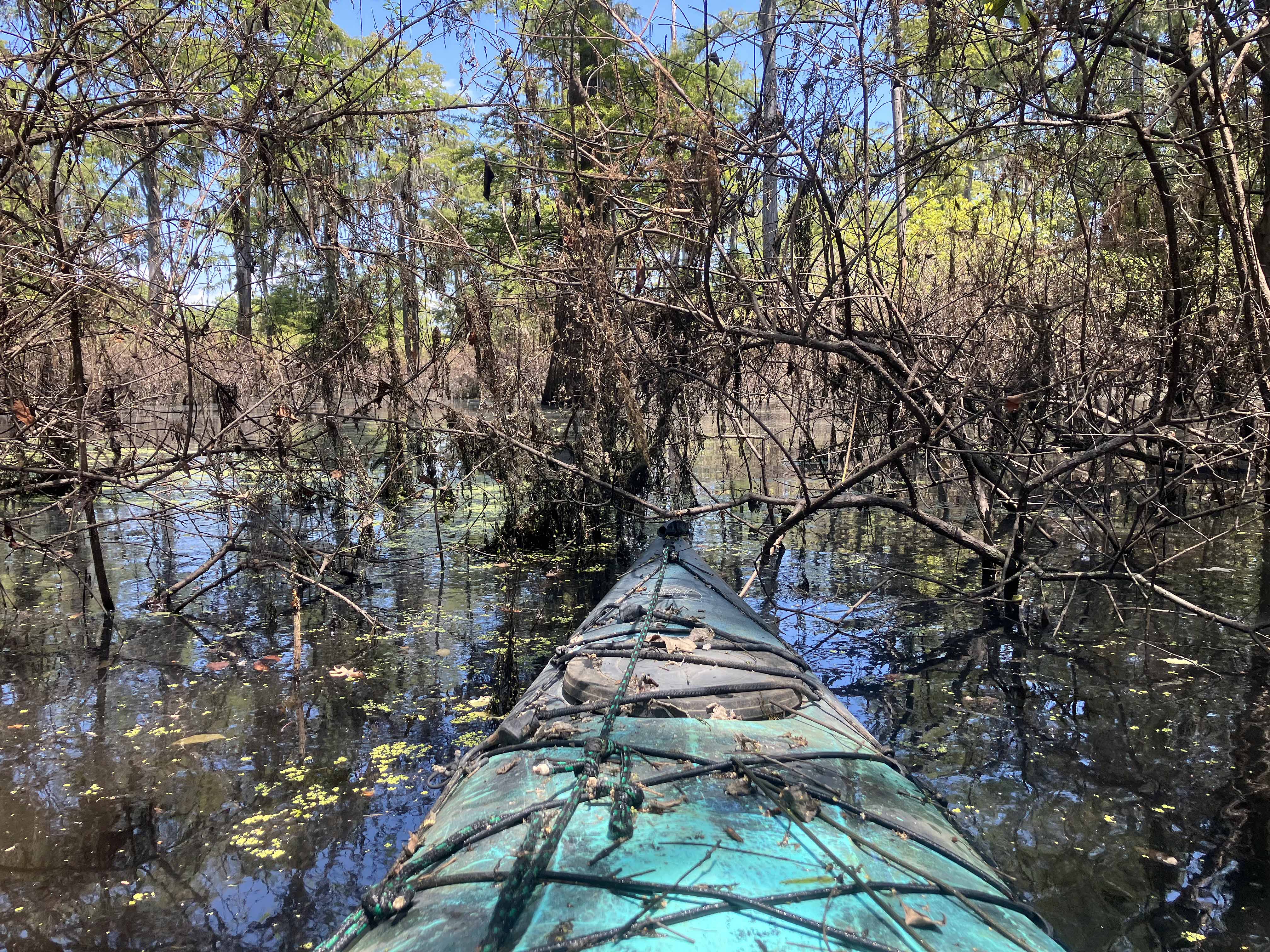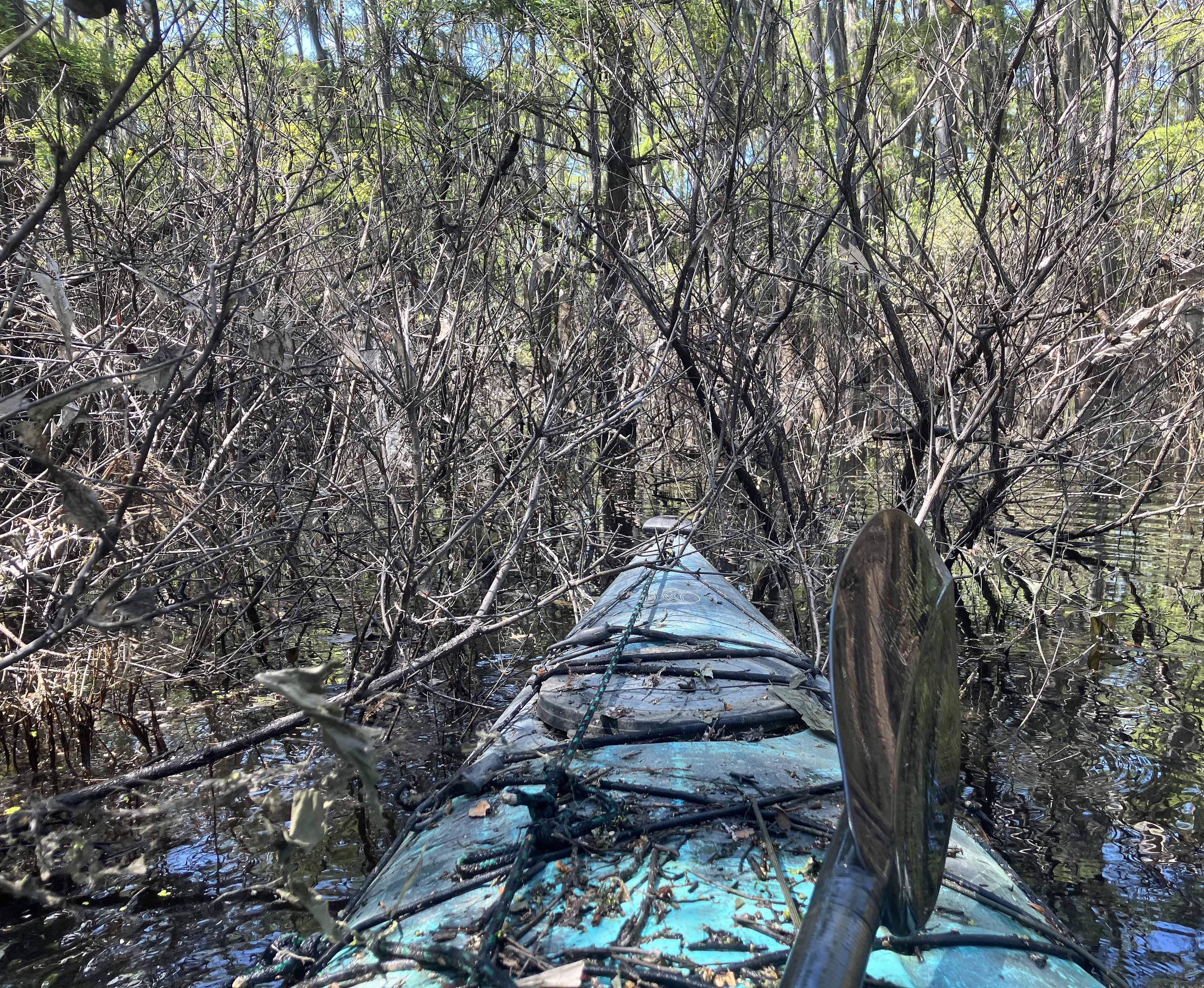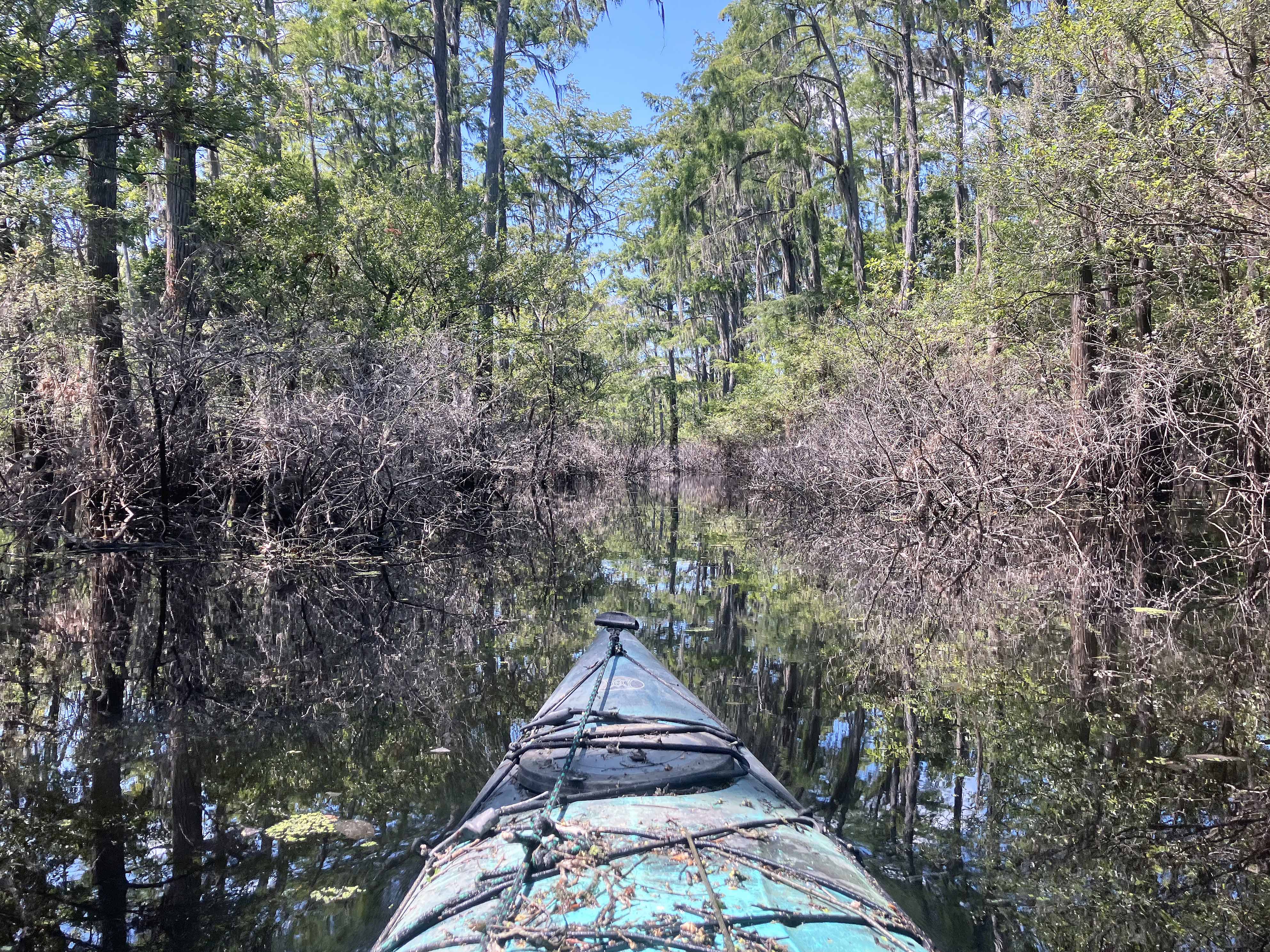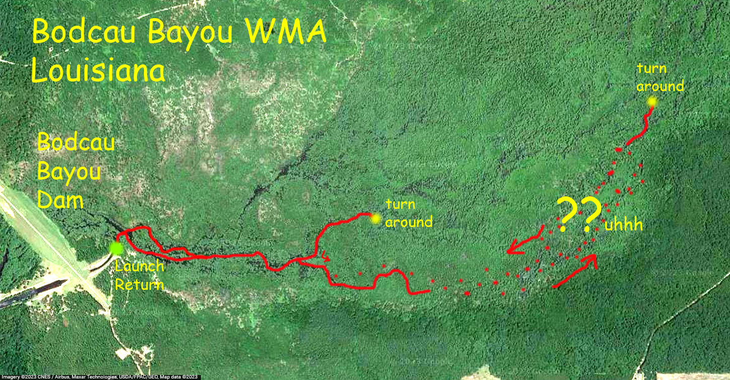 Another foray into the lake above Bodcau Dam, east of Shreveport Louisiana. It was a blistering hot afternoon, mid summer. By satellite map it looks as if there were some clear channels to the northeast and I wondered if I could paddle the boat up to those areas, or even to an open stretch of bayou. But not this time. The pictures below give a pretty good idea of the kayaking challenge. Things started out good but ended up as a crash through the brush. The map shows part of the route as dot dot dot, which means I kind of knew the direction I wanted but there was nothing direct that got you there, it’s a plow, pushing and shoving. On the positive side however, and perhaps counterintuitively, the confusion and jumble actually makes this area kind of interesting, and repeatable. Each time you can see what routes can be paddled, where you can go, where you can’t. Also, the lake can be circled by car using Cotton Valley Road on the east side and Duck Dam Road on the west; it’s a great drive.