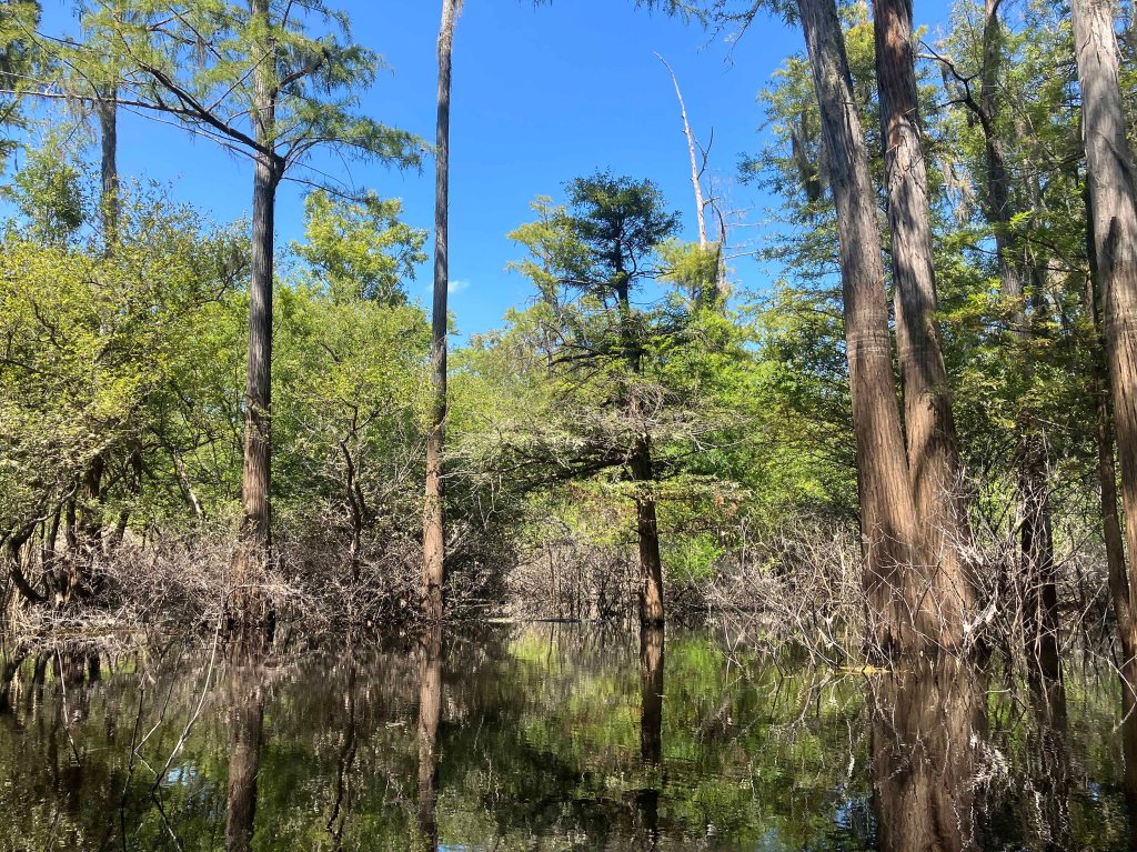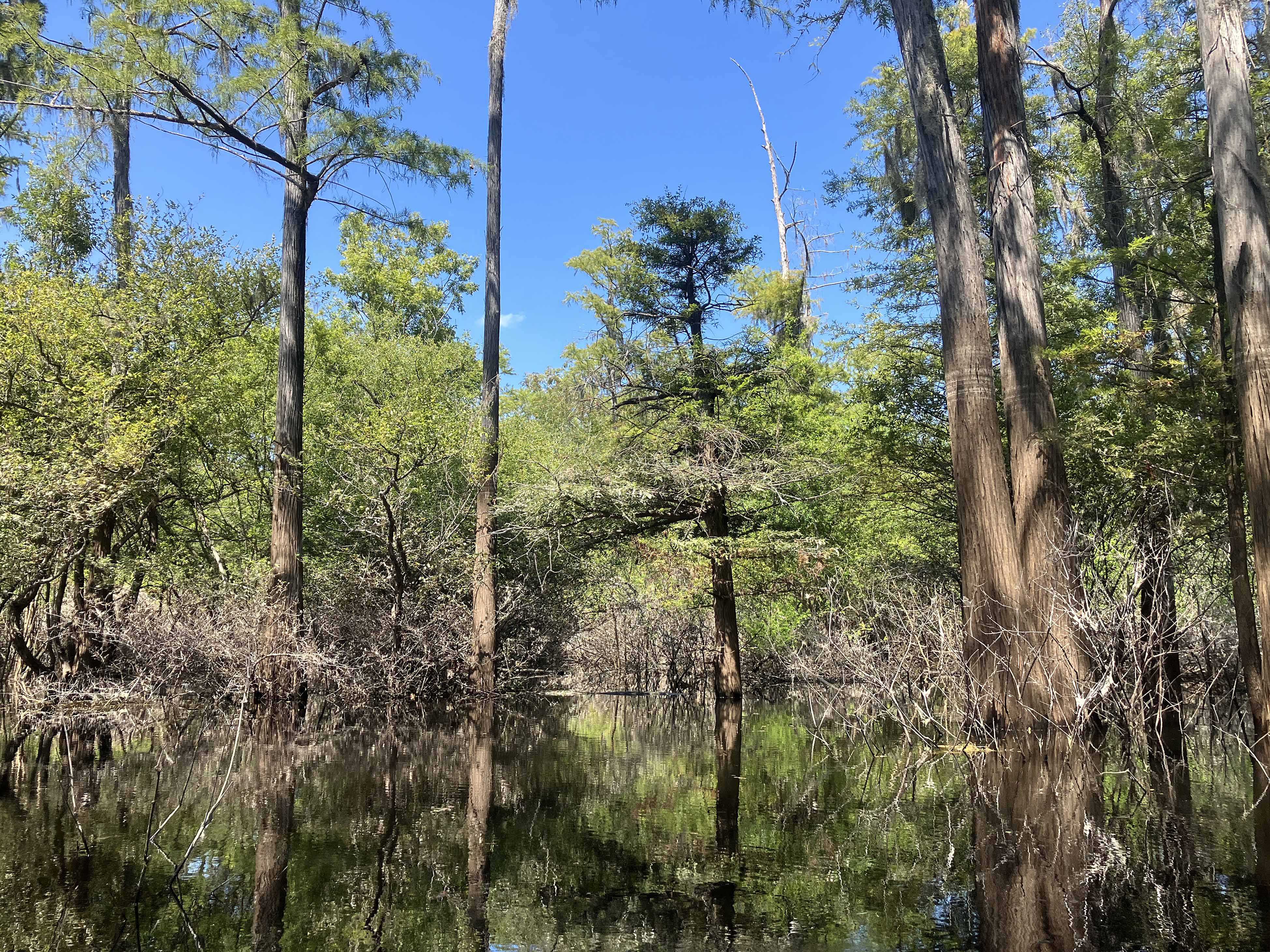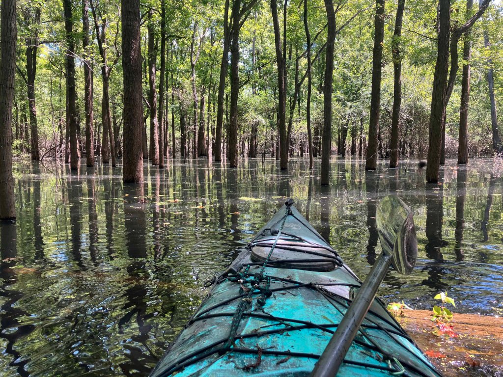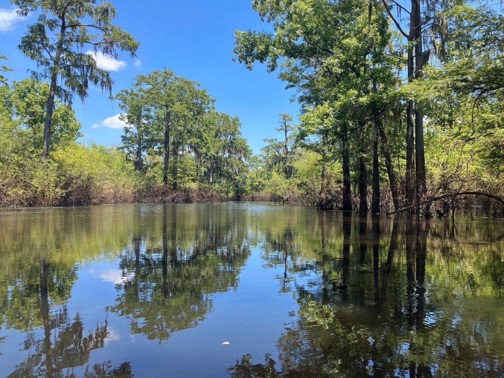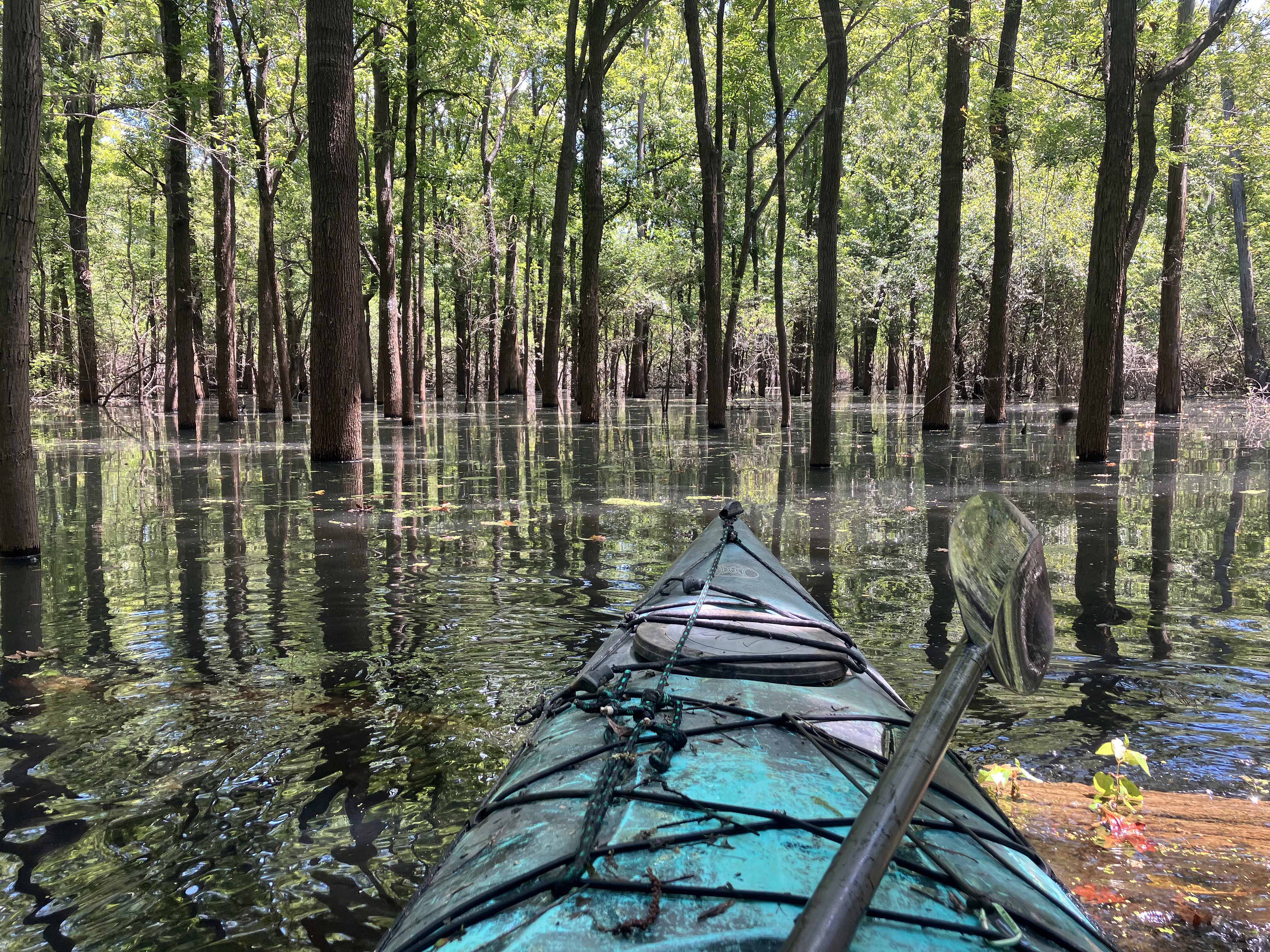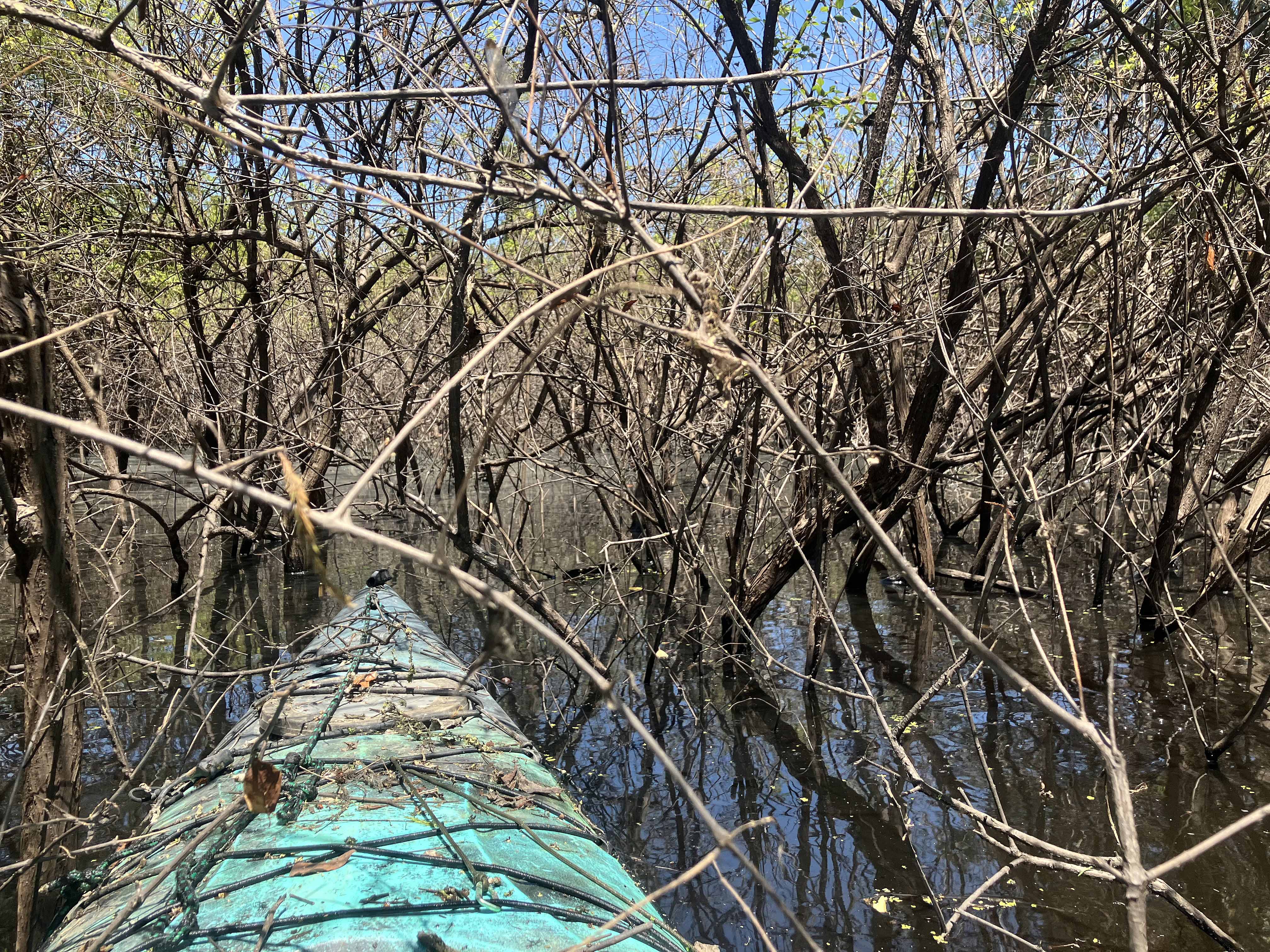 Another foray into the lake above Bodcau Dam, east of Shreveport Louisiana. It was a blistering hot afternoon, mid summer. By satellite map it looks as if there were some clear channels to the northeast and I wondered if I could paddle the boat up to those areas, or even to an open stretch of bayou. But not this time. The pictures below give a pretty good idea of the kayaking challenge. Things started out good but ended up as a crash through the brush. The map shows part of the route as dot dot dot, which means I kind of knew the direction I wanted but there was nothing direct that got you there, it’s a plow, pushing and shoving. On the positive side however, and perhaps counterintuitively, the confusion and jumble actually makes this area kind of interesting, and repeatable. Each time you can see what routes can be paddled, where you can go, where you can’t. Also, the lake can be circled by car using Cotton Valley Road on the east side and Duck Dam Road on the west; it’s a great drive.
