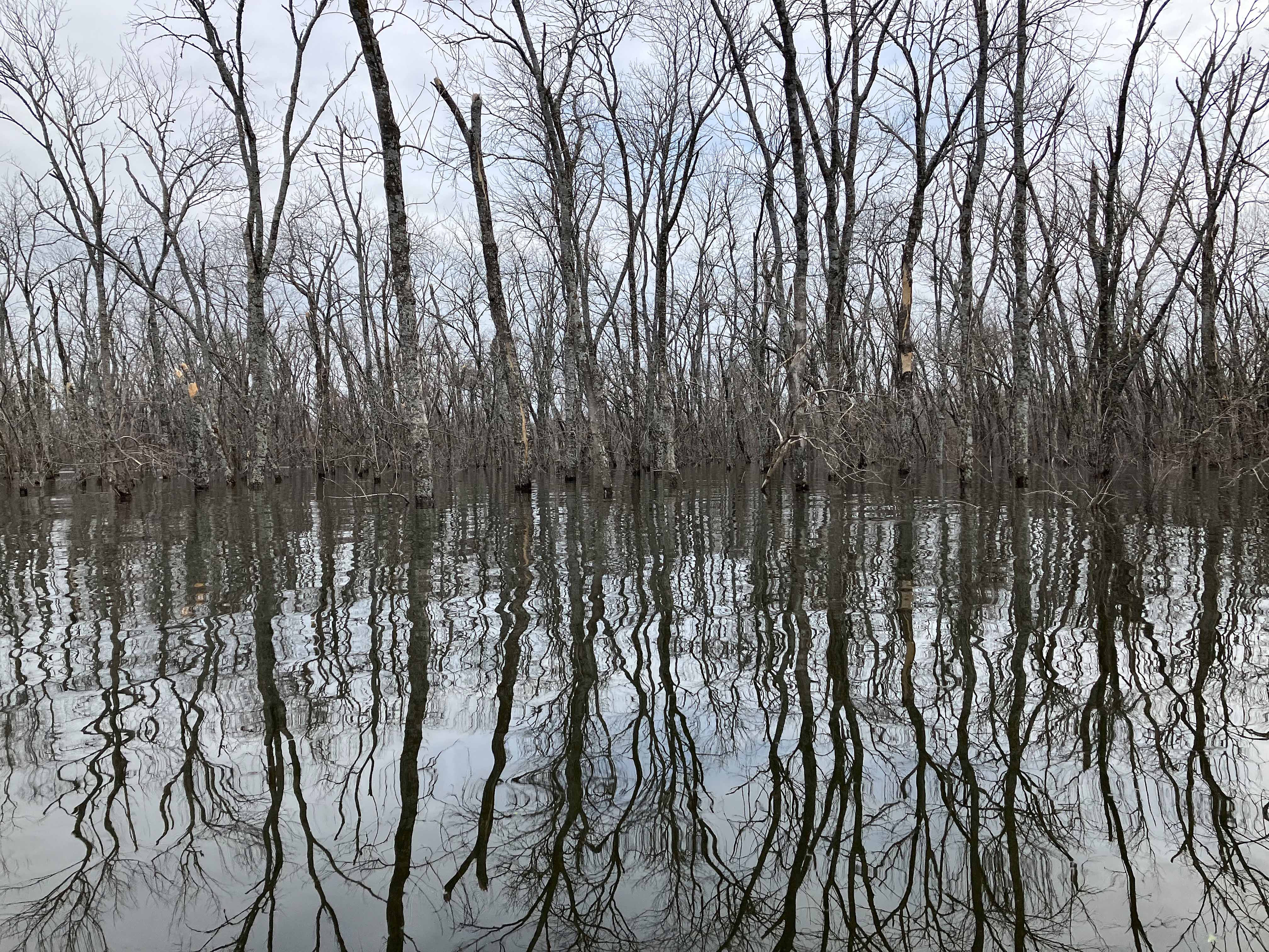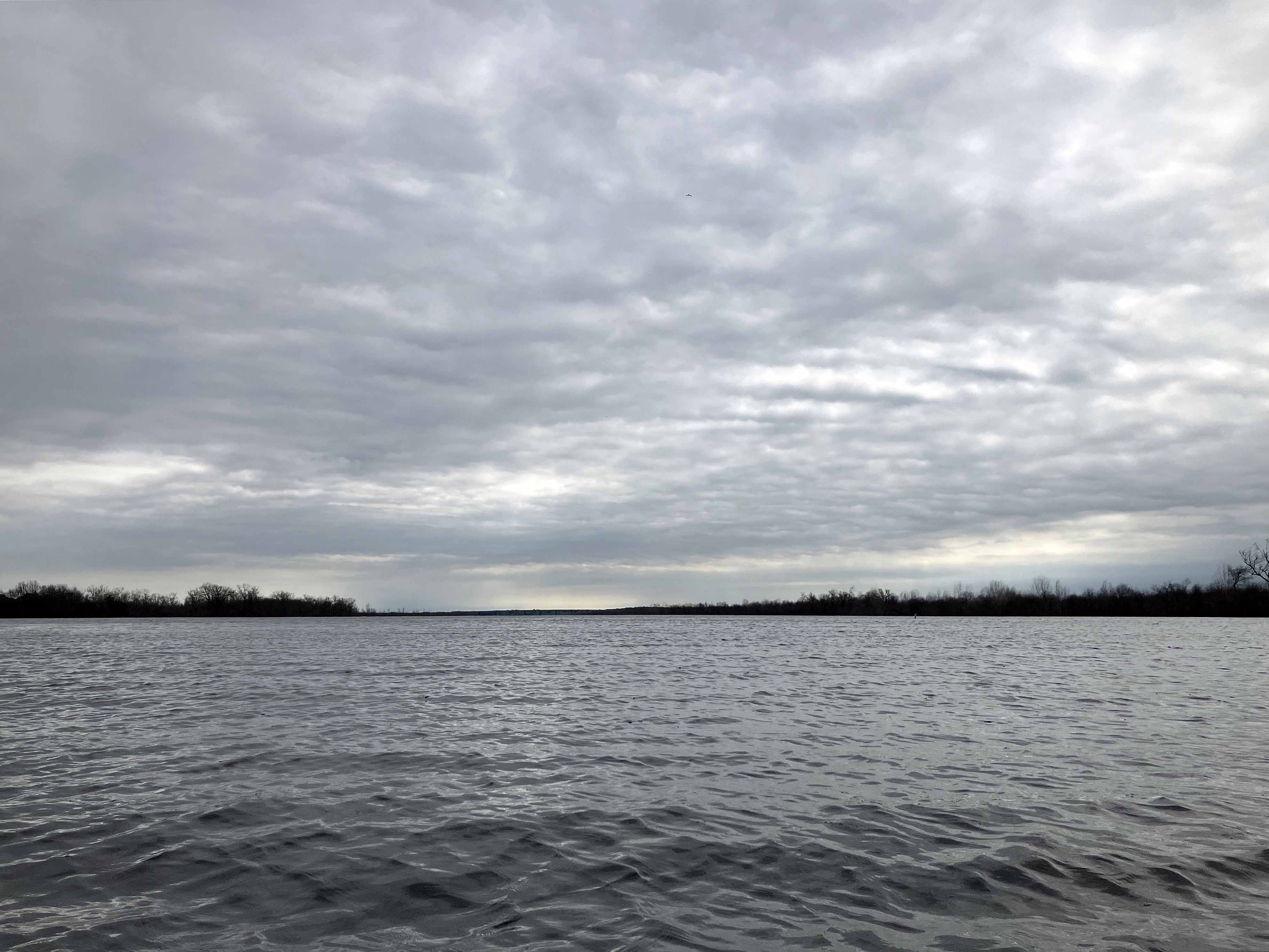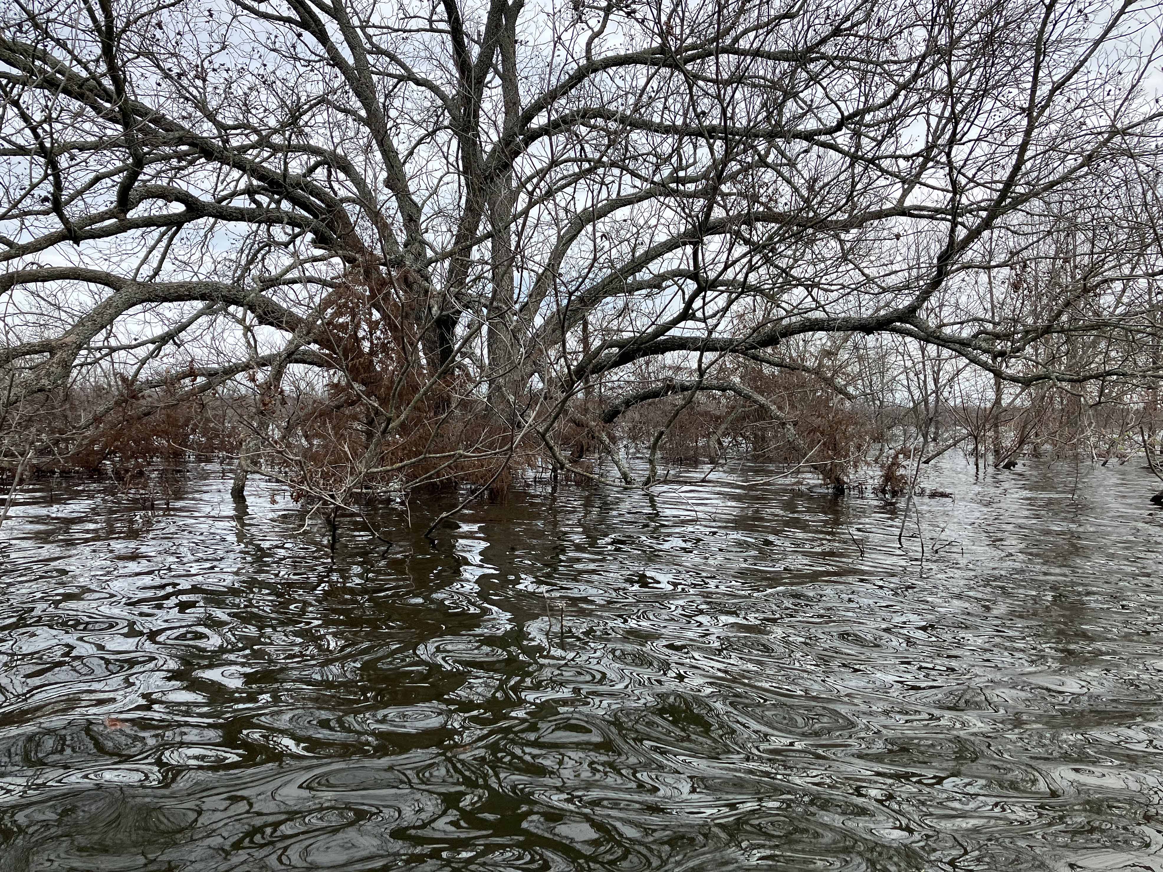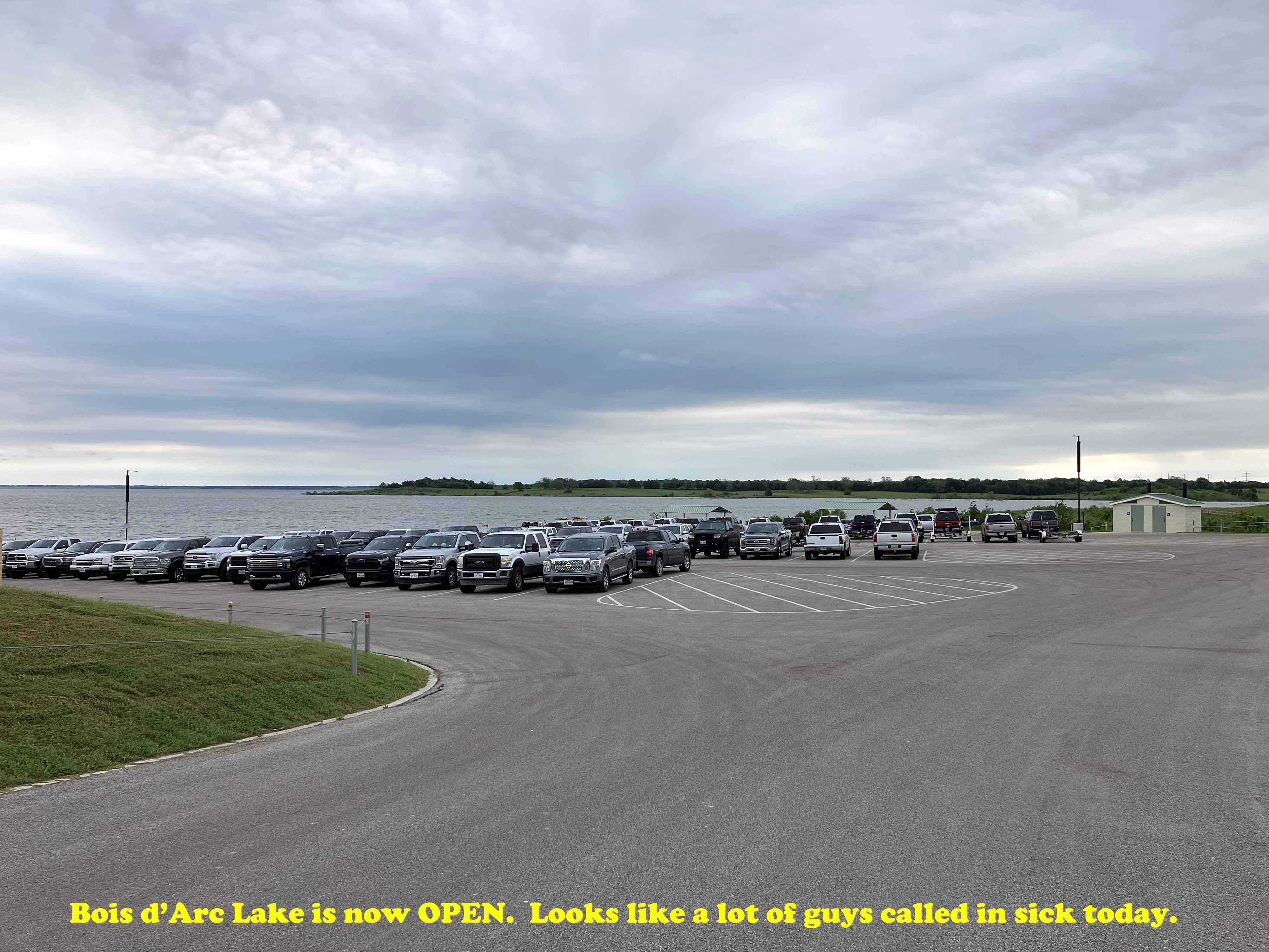Kayak paddle route on Bois d’Arc Reservoir Lake near Bonham Texas. I had been waiting several years for this lake to open, checking the pool level regularly, but it had been stuck for a long time at about 75%. I went a couple days after it first opened and the parking lot was jammed on a weekday (see picture). This new reservoir is to the east of Bonham, and the launch site I used was off of Highway 897. The interesting thing about the lake is that since it just filled the adjacent wooded areas are all flooded; probably the tree trunks will be sticking out of the water for years just like they do in other lakes. Eventually the part of the tree above the water will decay and the stump will remain at about water level. But now, since the reservoir has filled so recently, you can actually kayak into the woods as it were, which is kind of cool. Note that at the time the above route map was made google satellite images were not up to date on the full pool boundaries. So you have to see where you can go once you’re there or wait for a later satellite pass to take new images.
