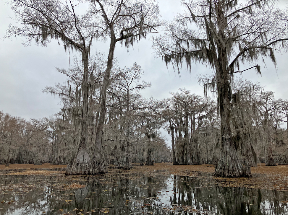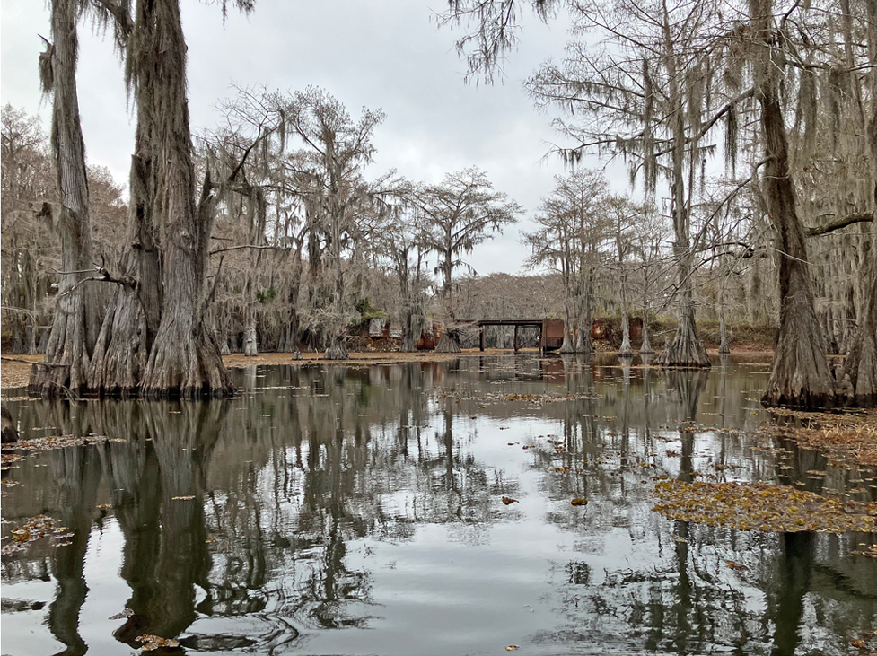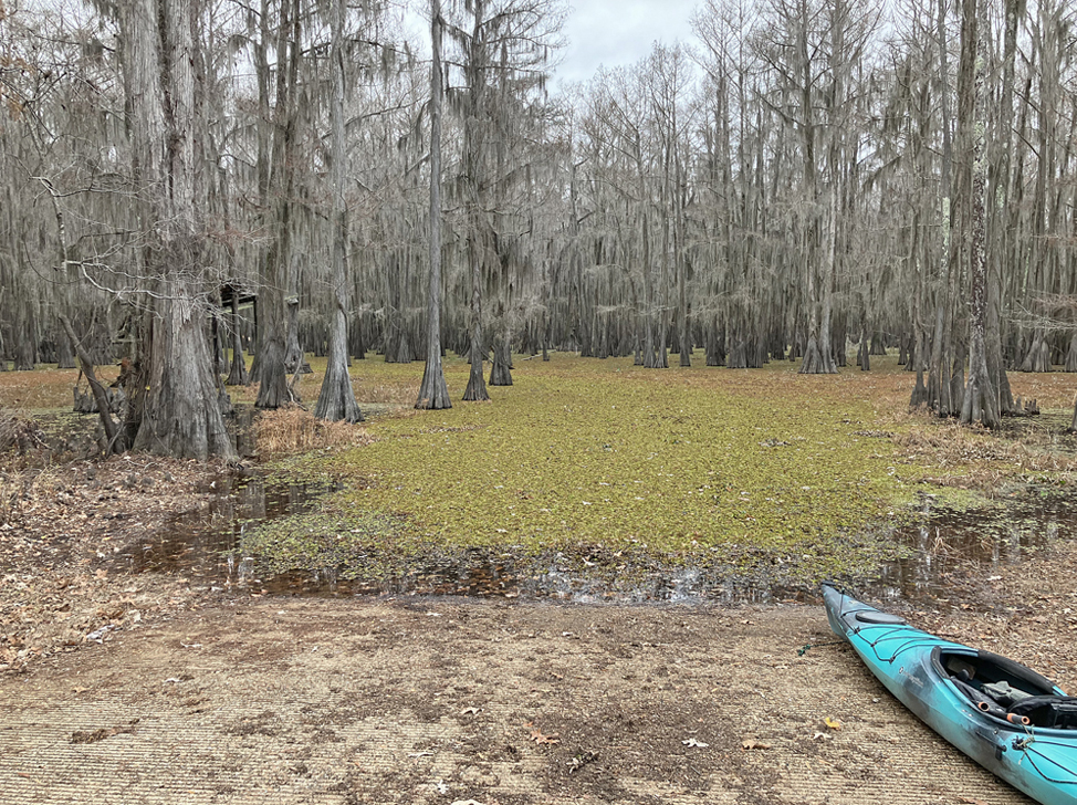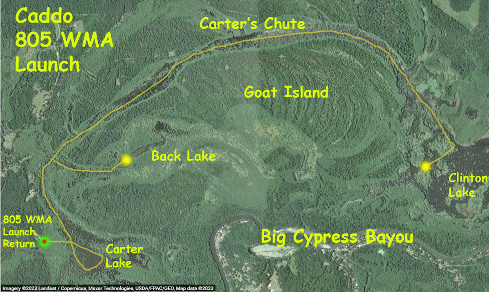 Simple kayak paddle map in Caddo, an early trip there. Caddo is closest place to try for those in the DFW area who want to experience paddling in a ‘real swamp’, something different from open lake or flatwater river paddles, something a bit more exotic. Finding that a swamp was so close to Dallas was a big surprise for me. Something clicked. In this section on Caddo trips there are several paddle routes and maps (A, B, C, etc.) for the Caddo area. This area includes Carter Lake, Clinton Lake, and the Big Cypress Bayou (which flows downstream into Caddo Lake itself). Most of the routes start at the 805 WMA launch, which is at the end of a dirt road off of Highway 43 coming out of Marshall Texas. And most are more complicated than the one above. A WMA Access permit is required to use the 805 launch site. This is a particularly good put-in because you are in the swamp right away. There is also a launch at Caddo Lake State Park but its two miles flatwater on the bayou before you enter the swamp (and two miles back). There are also launches at Johnson’s Ranch Marina and in the nearby Caddo Lake NWR (Starr Ranch).