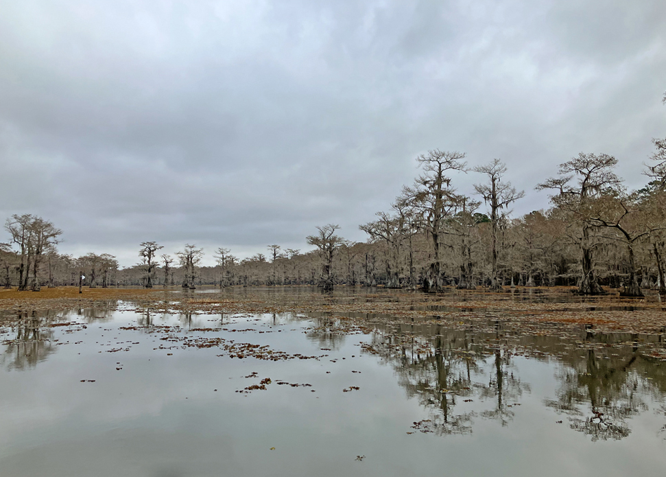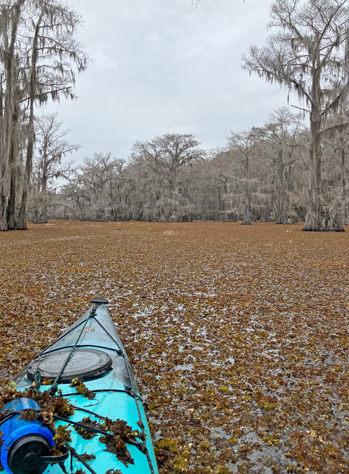 The TPWD website has a number of easy, named, trails here, Carter’s Chute, Hell’s Half Acre, Turtle Shell, and several more. Those are good trails to start and there are signs to identify each route. My first few times at Caddo I paddled VERY carefully from sign to sign to sign so as not to get lost. The above route map is pretty easy, it launches at the 805 WMA put-in, goes around Carter Lake a bit, goes out Carter’s Chute just north of Goat Island till it reaches Clinton Lake, and tries to go into Back Lake (but the Salvinia was too bad). The TPWD and powerboat trails have markers but there are no signs if you go ‘off trail’. It is pretty easy to get lost in Caddo so it’s good to know the general north south east west framework of the place. Getting lost is no fun believe me.