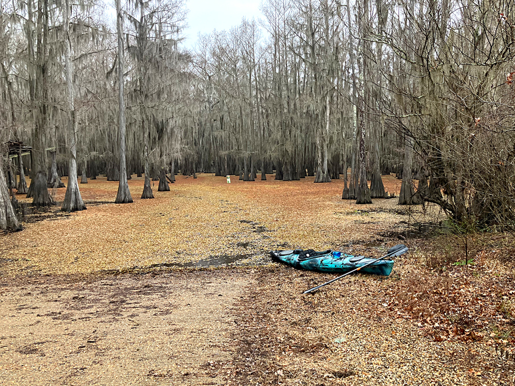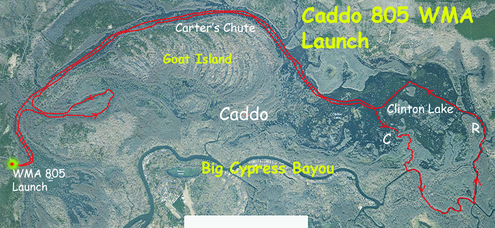 A winter paddle at Caddo. This kayak route uses the 805 WMA launch, follows Carter’s Chute, but goes further out the C and R boat lane markers to do a loop at Clinton Lake. The connection between Clinton Lake and Big Cypress Bayou is Blind Slough, which is twisty and fun, just watch out for powerboats coming around the corners. Camping is available at the nearby Caddo Lake State Park, at primitive campsites at the 805 WMA launch site and, if you want to haul your gear, on Goat Island. During hunting season the 805 WMA launch is packed with cars, campers, boats.