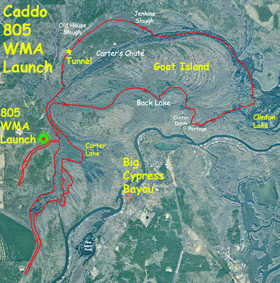 A paddle route at Caddo, starting at the 805 WMA put-in. This one hangs an immediate right at the launch site to explore the nearby inlet. Even though this inlet is not very big, I once got all turned around and lost in it, every direction looks the same. The paddle route continues to explore another longer inlet that extends quite a ways south, then heads north through Back Lake and Clinton Lake to get back onto Carter’s Chute. Instead of taking this all the back the route detours into Jenkins Slough and Old House Slough (including a tunnel!), and finally returns to the launch. The water was pretty high, there was a bit of current on Carter’s Chute, and because of this a complete transit of Jenkins and Old House was possible. Otherwise these might not be doable, they can be shallow and very brushy. Good trip.
