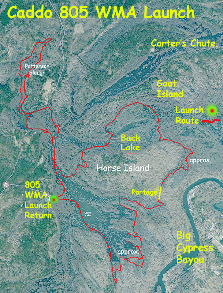 A Caddo kayak paddle route starting at the 805 WMA launch. This one just explores here and there, seeing how far we can go along the perimeter. The east side of Horse Island leading into Back Lake is complicated and required a portage. The route also explores Patterson Slough to the northwest, which splits off from Carter’s Chute. There is a little channel the gets you into the slough and it’s an interesting place, you can go quite a ways north as the route shows. This was a fun exploratory paddle, kind of improvised on the spot, sloggy and muddy, but overall a good tour.