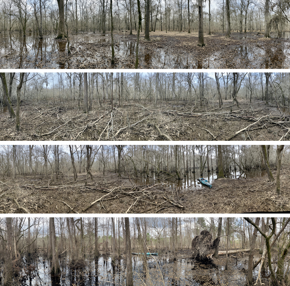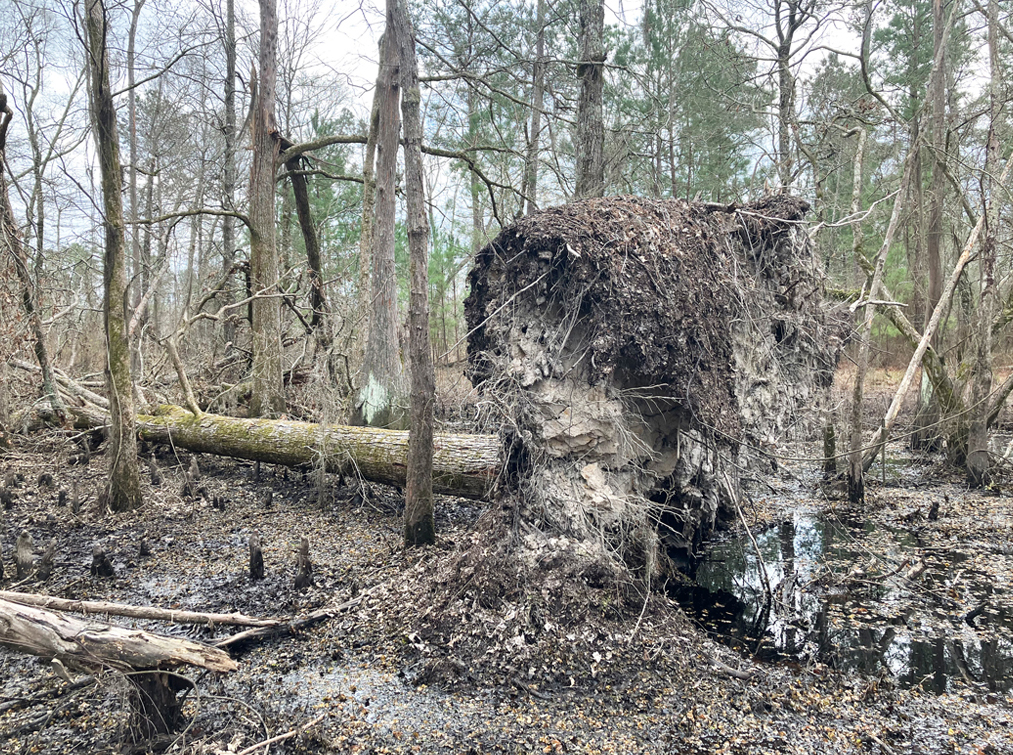 Above: Big overturned tree, sometimes the pit left behind becomes a hog wallow. And I’ve seen alligators in them as well.