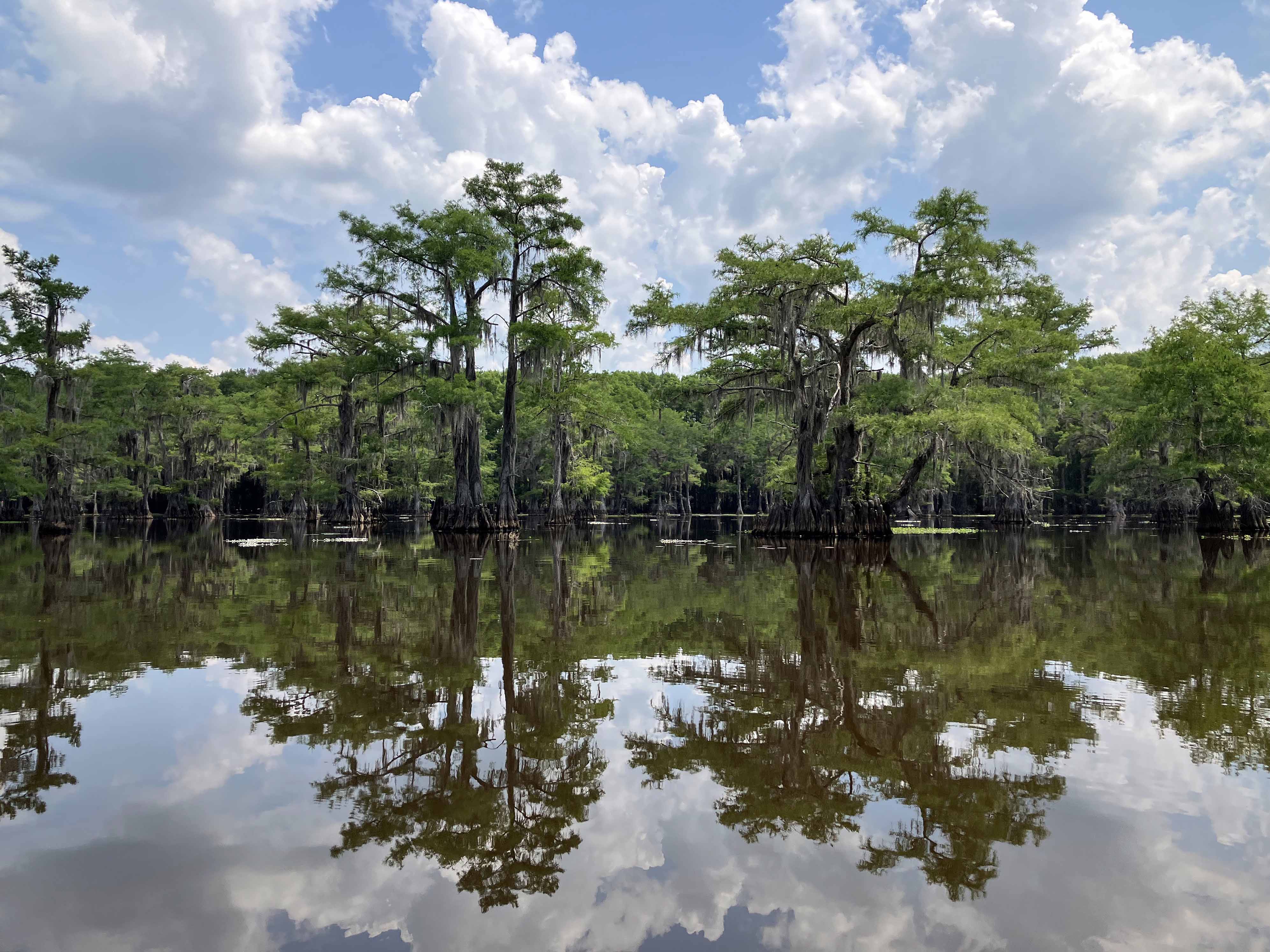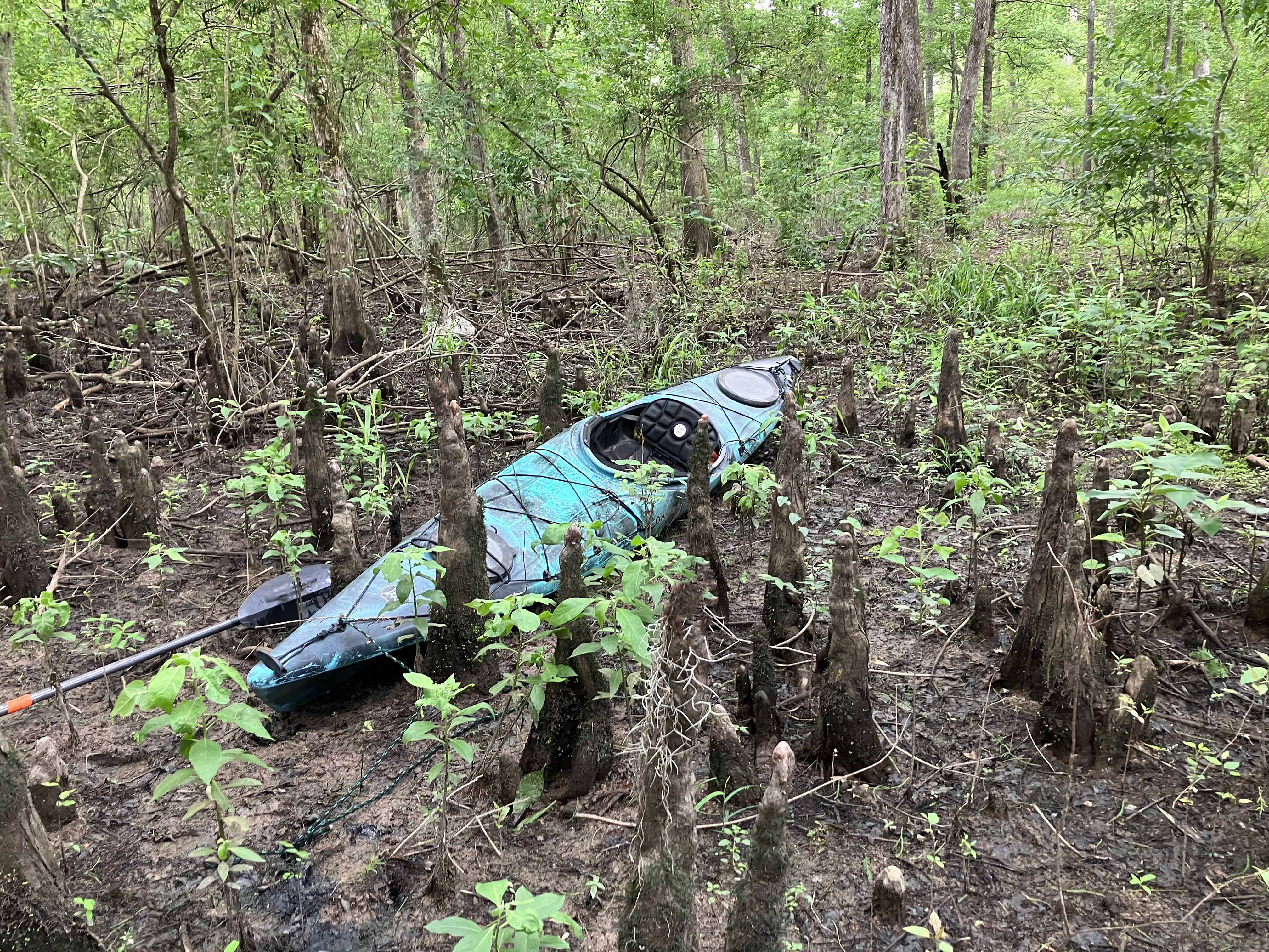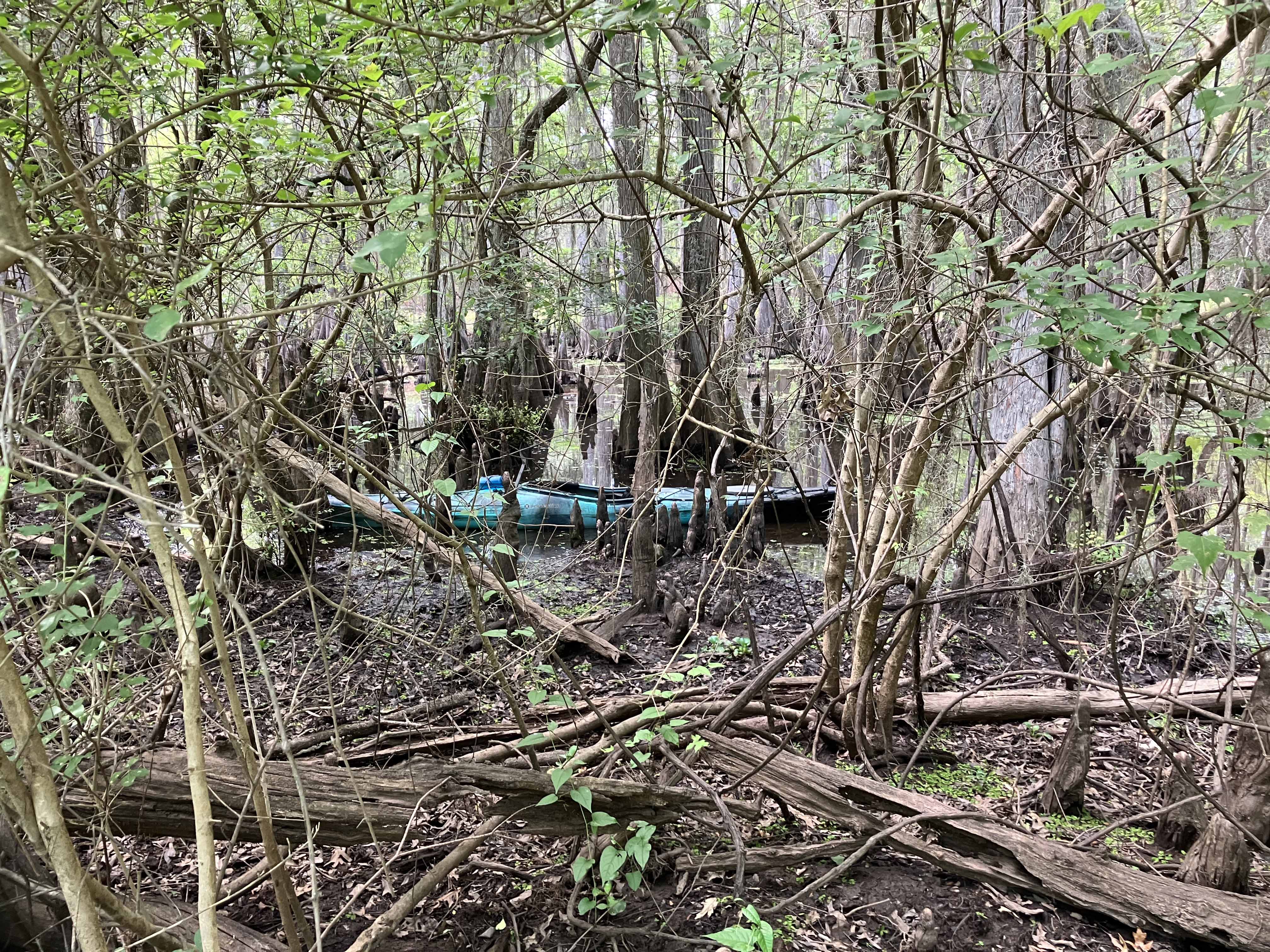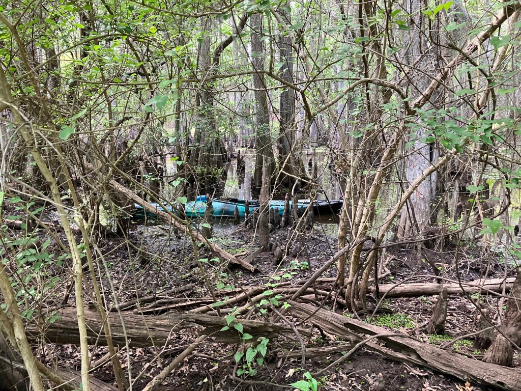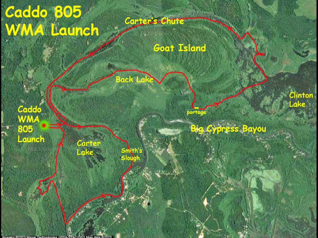 A Caddo kayak paddle map route starting, as usual, at the 805 WMA launch After a while there is a certain amount of repetition to Caddo paddles, and so this route goes over some of the same areas as some earlier trips. It first goes through Back Lake and out Whistleberry Slough into Clinton Lake and back again through Carter’s Chute. And then out Smith’s Slough to the Big Cypress Bayou and back through the Canal towards the launch site. Perfect day. I once had to portage, which really means drag the boat by hand in the woods, across the east-most end of Goat Island. The reason was I got really disoriented in Back Lake but I knew that going straight north would get me back to Carter’s Chute. Wasn’t easy, there were several water filled ravines that had to be crossed, trickier than I thought. But this trip was easy enough. Although you have to watch for powerboats in Smith Slough.
