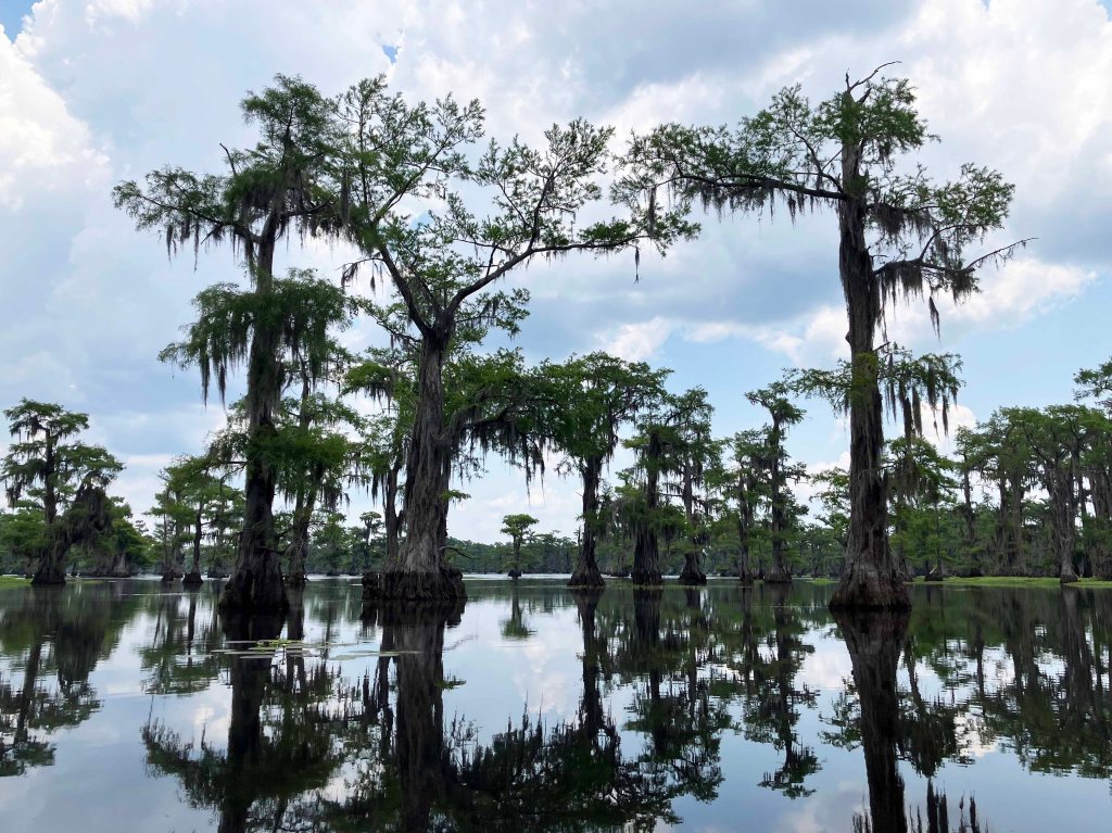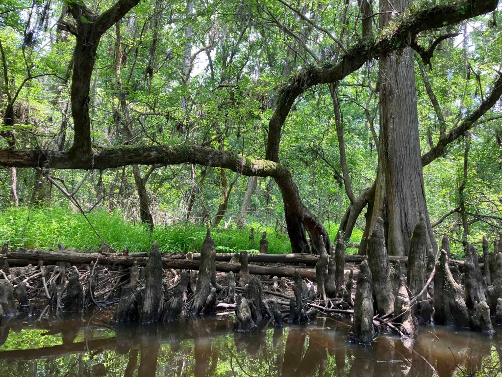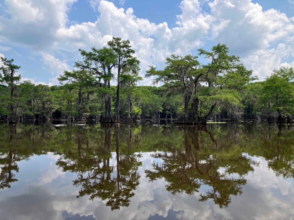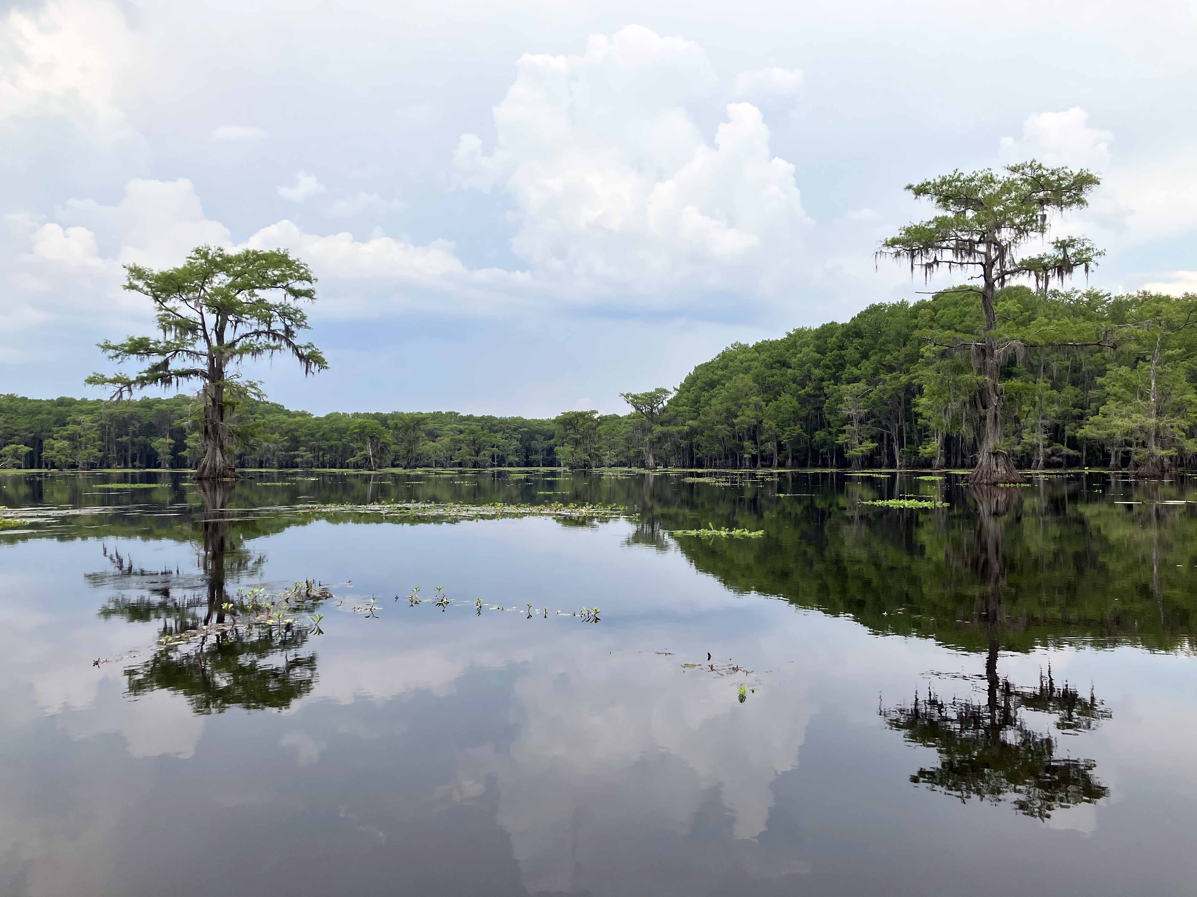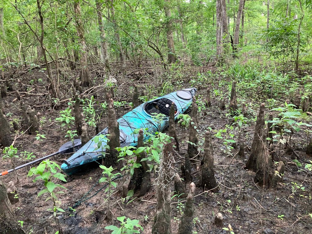 A Caddo kayak paddle map route starting, as usual, at the 805 WMA launch After a while there is a certain amount of repetition to Caddo paddles, and so this route goes over some of the same areas as some earlier trips. It first goes through Back Lake and out Whistleberry Slough into Clinton Lake and back again through Carter’s Chute. And then out Smith’s Slough to the Big Cypress Bayou and back through the Canal towards the launch site. Perfect day. I once had to portage, which really means drag the boat by hand in the woods, across the east-most end of Goat Island. The reason was I got really disoriented in Back Lake but I knew that going straight north would get me back to Carter’s Chute. Wasn’t easy, there were several water filled ravines that had to be crossed, trickier than I thought. But this trip was easy enough. Although you have to watch for powerboats in Smith Slough.