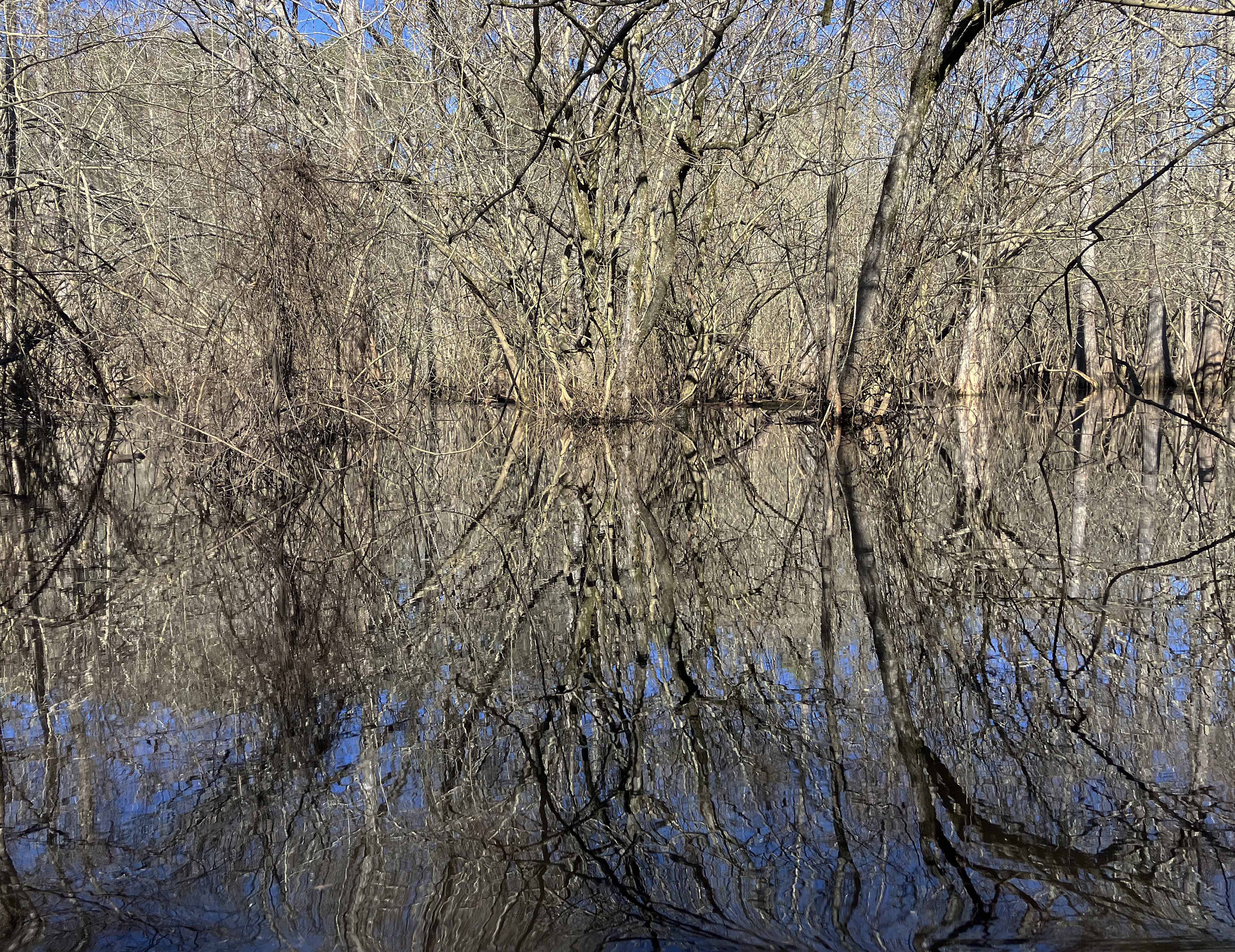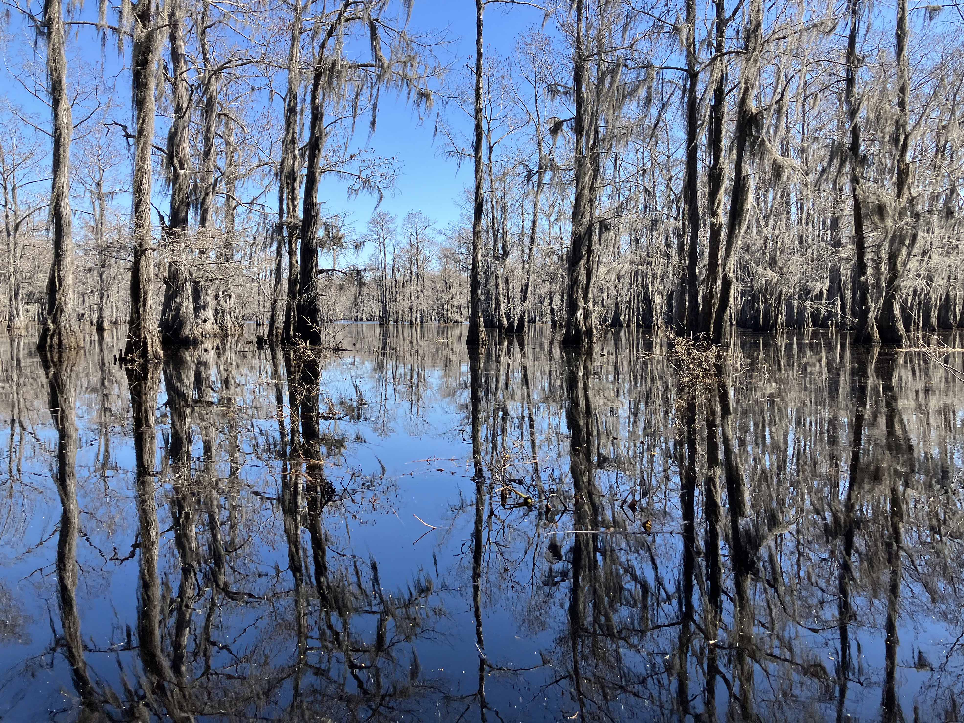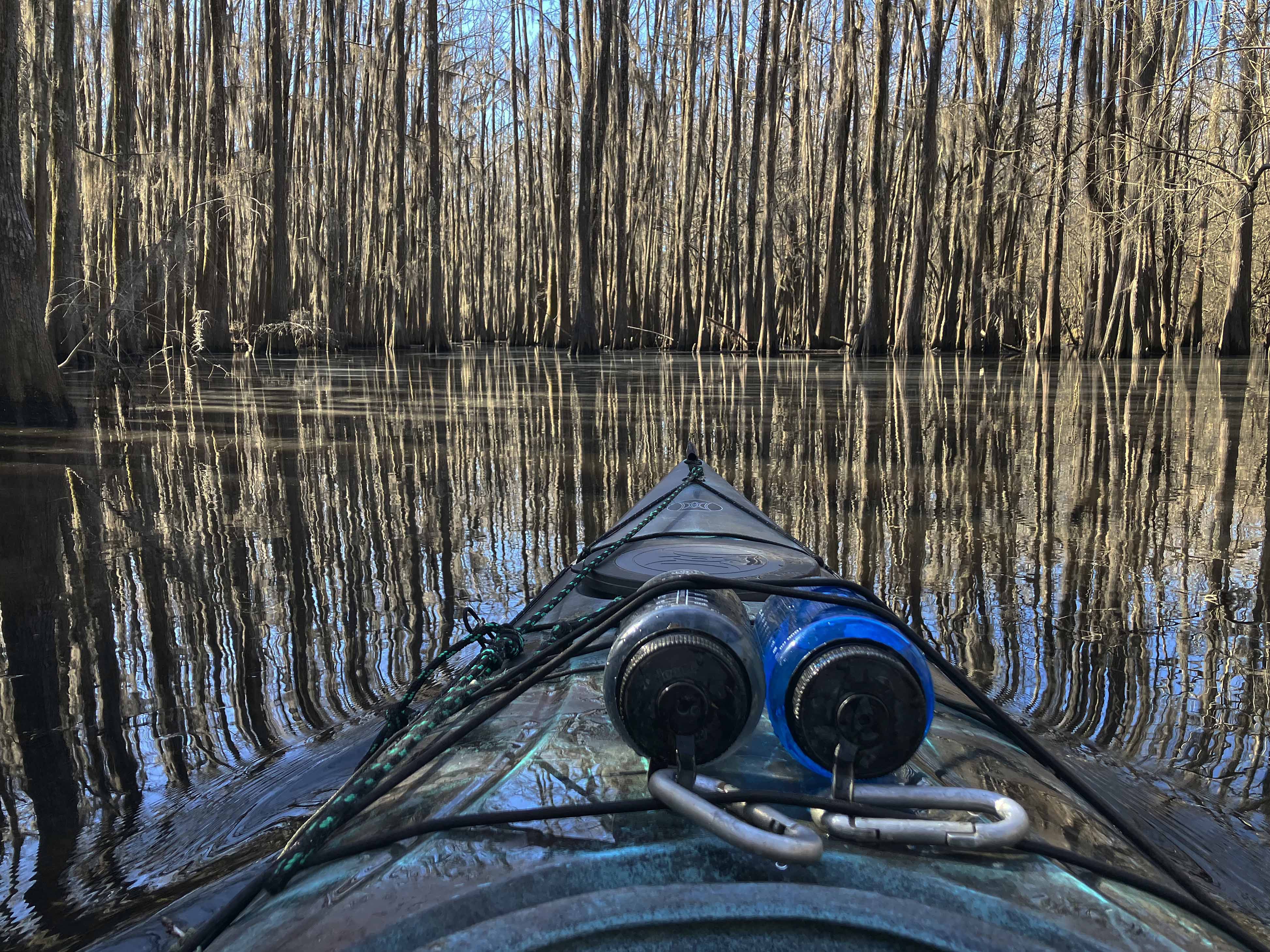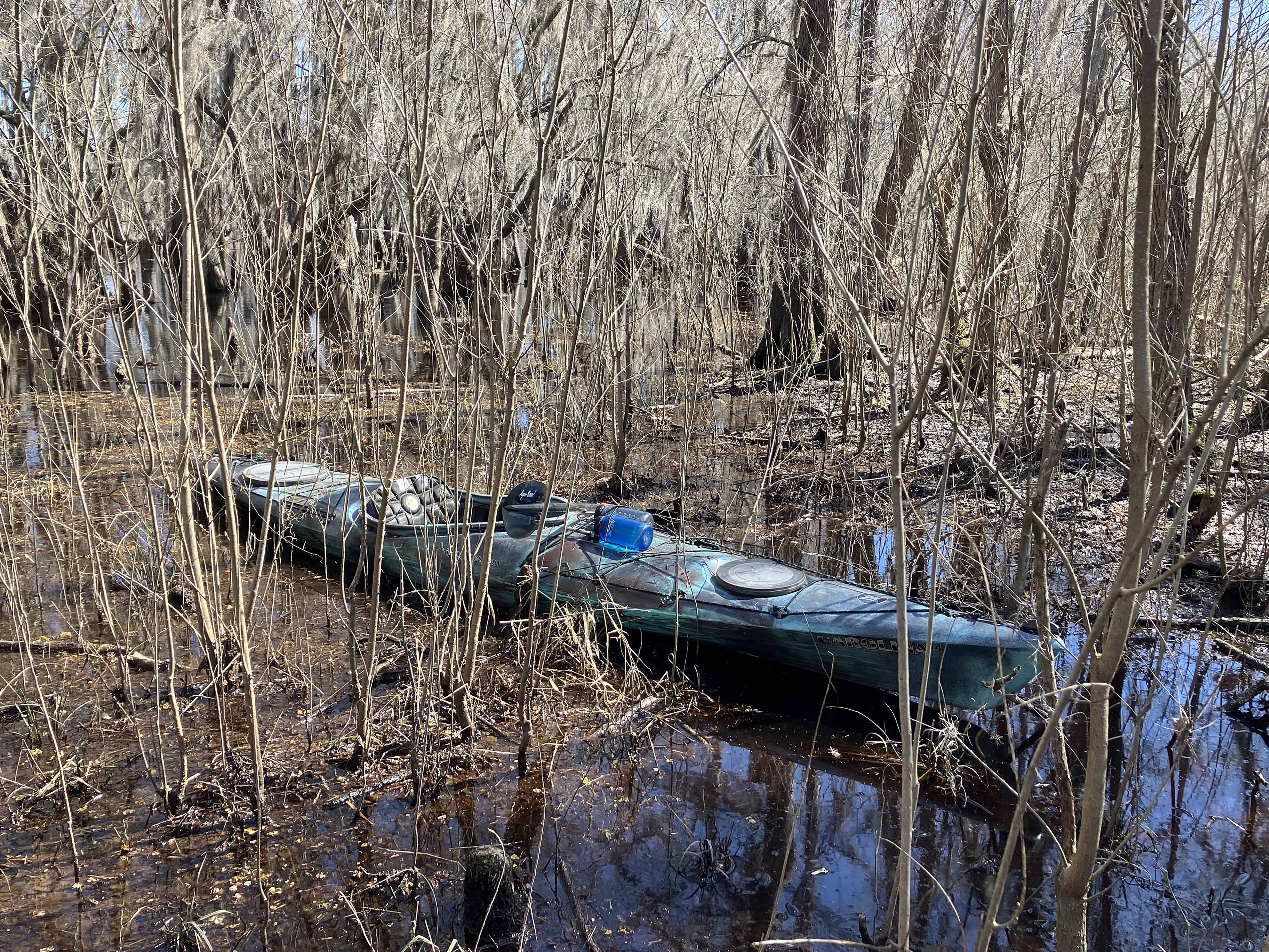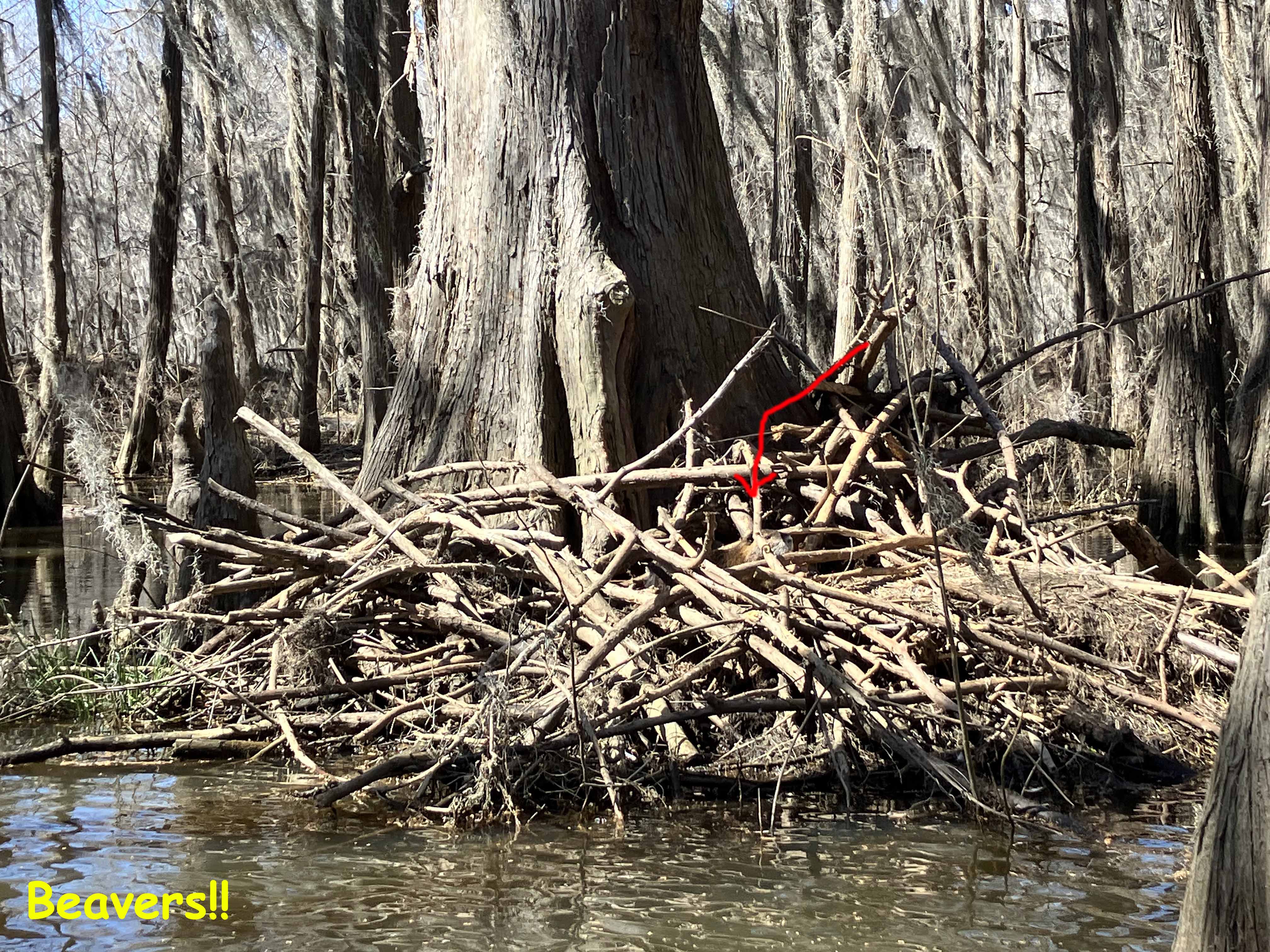 This kayak trail paddle route at Caddo starts from the 805 WMA launch and stays nearby, just exploring the edges of Carter Lake and nearby inlets and shorelines. There is nothing particularly designed about the route, just a pleasant paddle to check here check there. Not a long paddle either, just winding through the cypress, paddling backwards, getting hung up on the knees, puttering around. It’s amazing how much more paddleable area there is than one might expect. Highlights of this nice paddle were some baby beavers and an alligator.