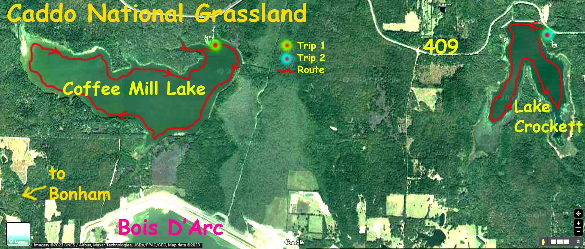 Coffee Mill Lake and Lake Crockett are two adjacent lakes in the Caddo National Grasslands between Bonham and Paris. They are just north of the new Bois d’Arc Reservoir. Both have public boat launches off of Highway 409 and their attraction is that they are small, isolated, and less used than some of the bigger lakes in the area. Both are quite pretty and the paddling routes for them above are basically just loops along the shore. Caddo Grasslands also has some nice camping areas.