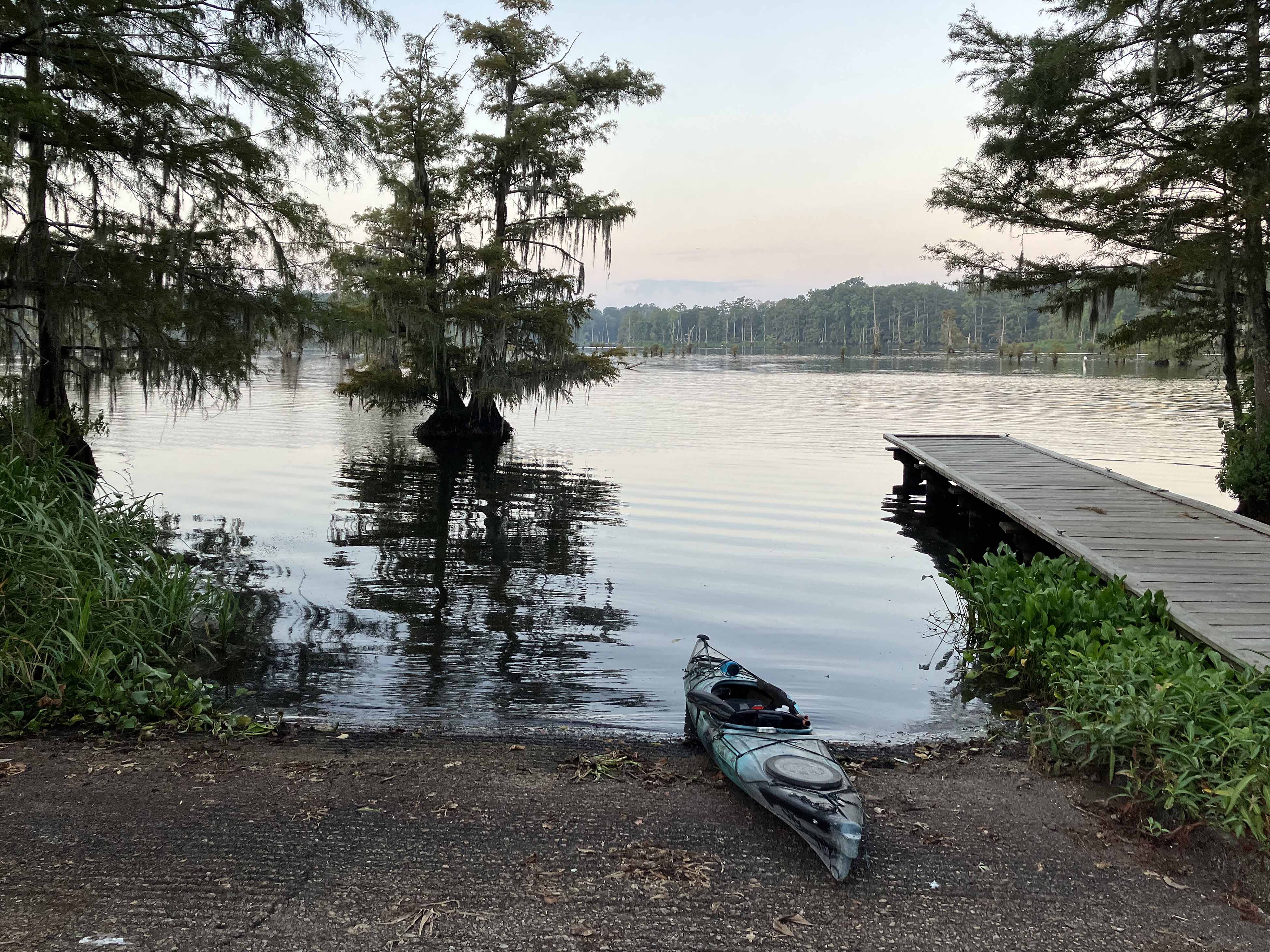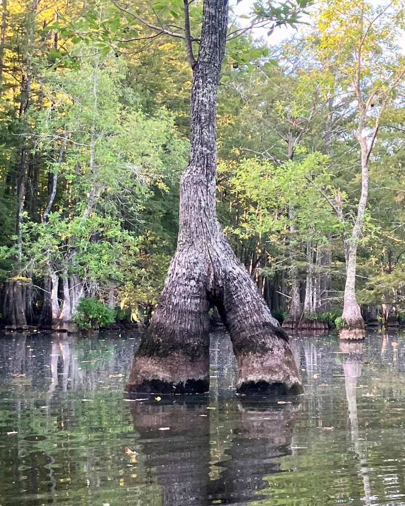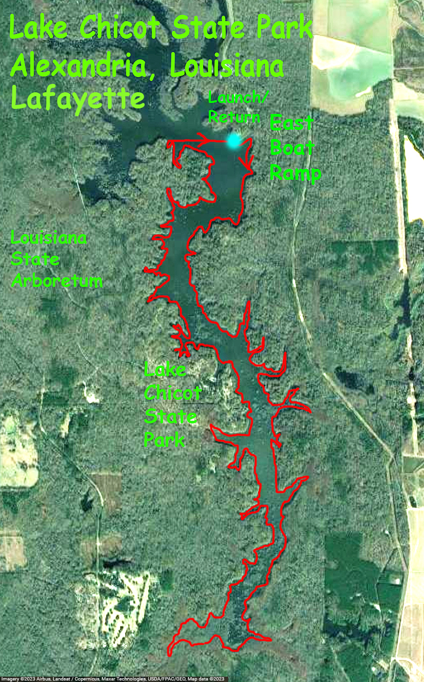 Lake Chicot is a thin strip of a lake midway between Alexandria and Lafayette and only a few miles from I-45. For this kayak trip I launched at the East Boat Ramp and hugged the shore around the entire south side of the lake, until I got back level with the launch. As a result the red trail line has the same contour as the shoreline. It’s a beautiful park and there are lots of tupelo trees in the water, one of which had two trunks (see picture). Nice early morning paddle around the lake, next time I will try the north side.