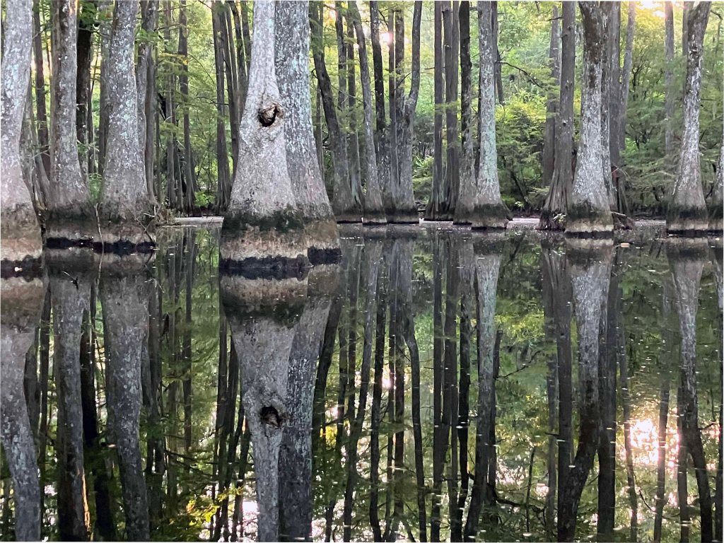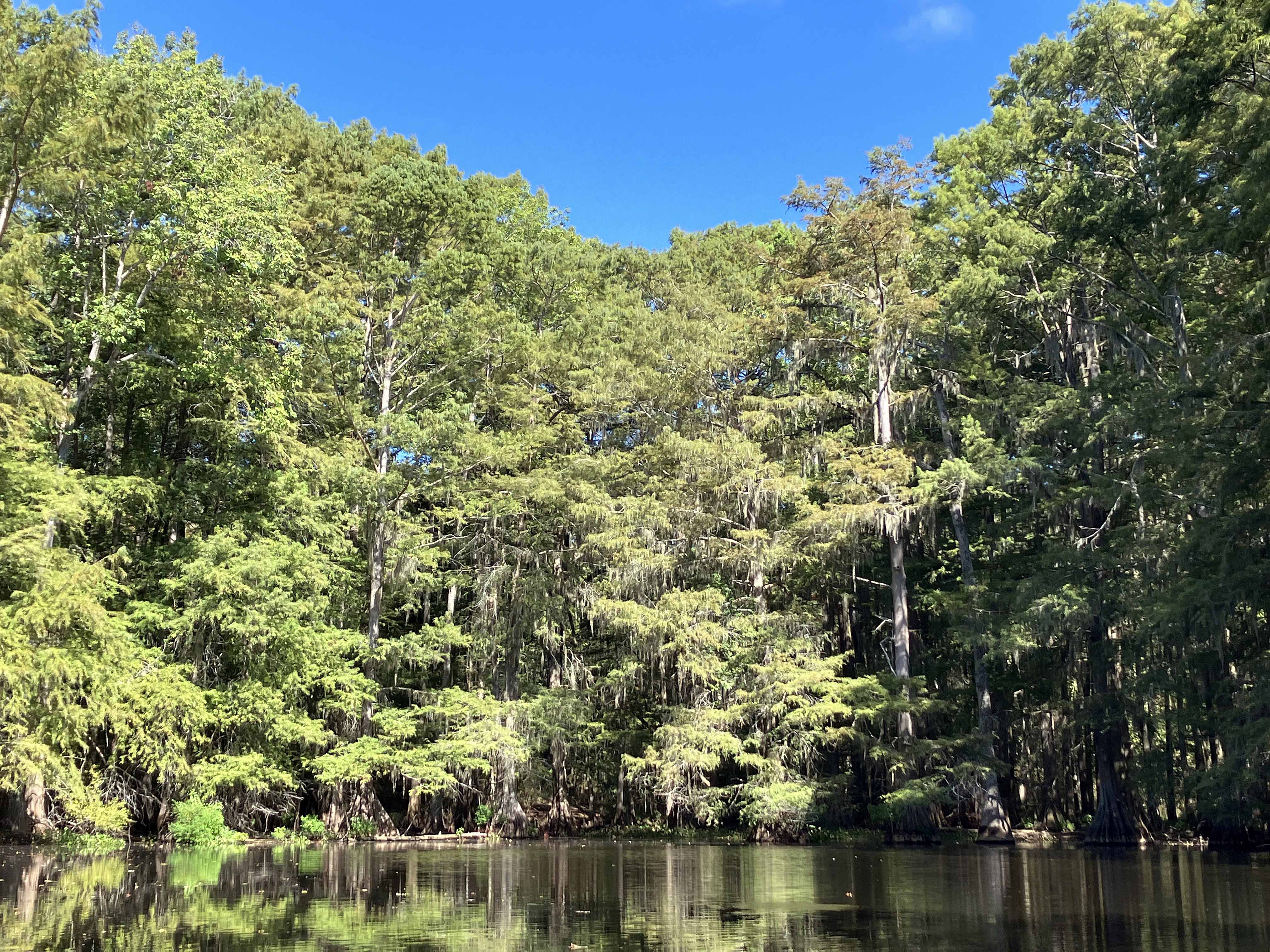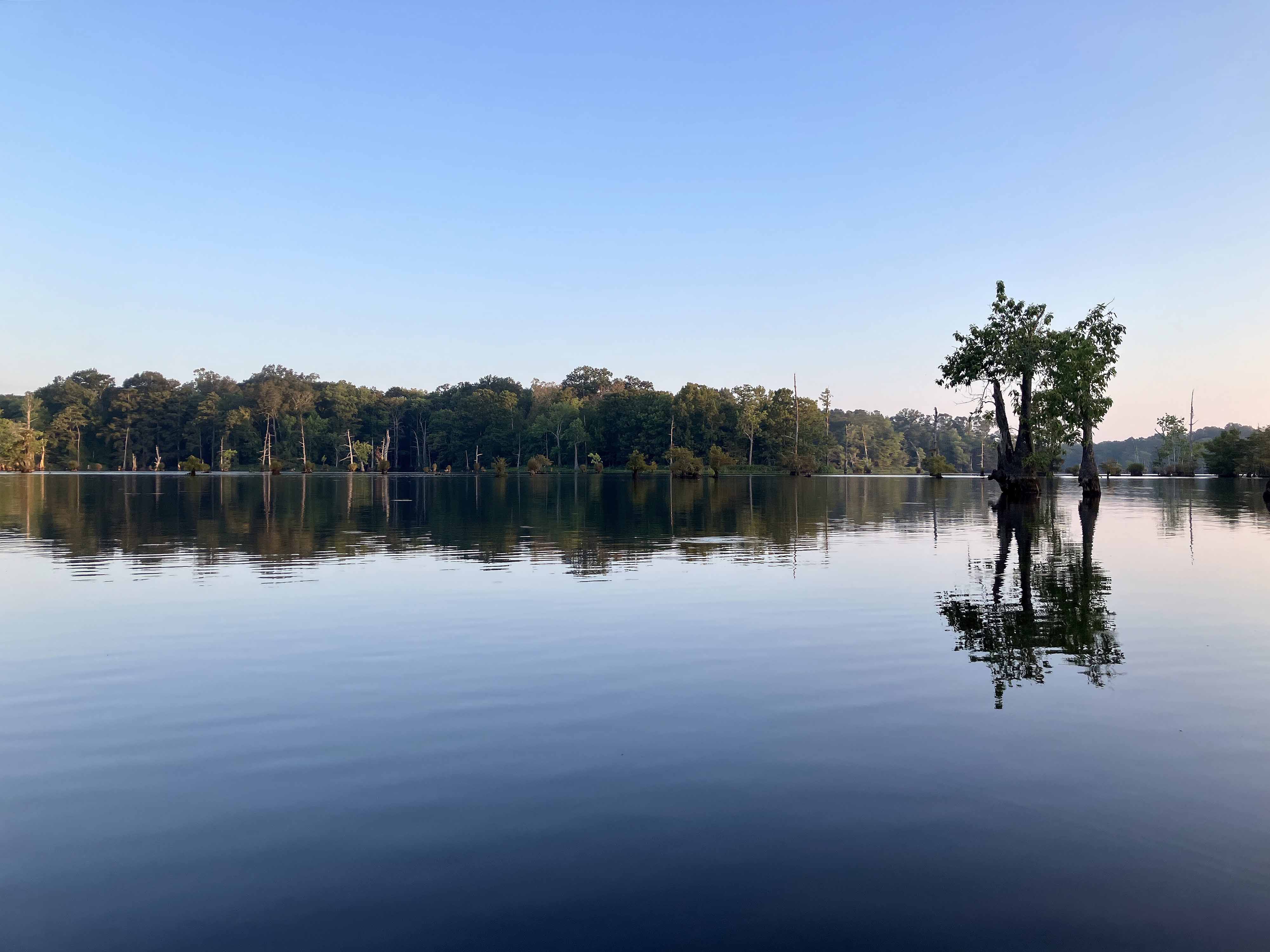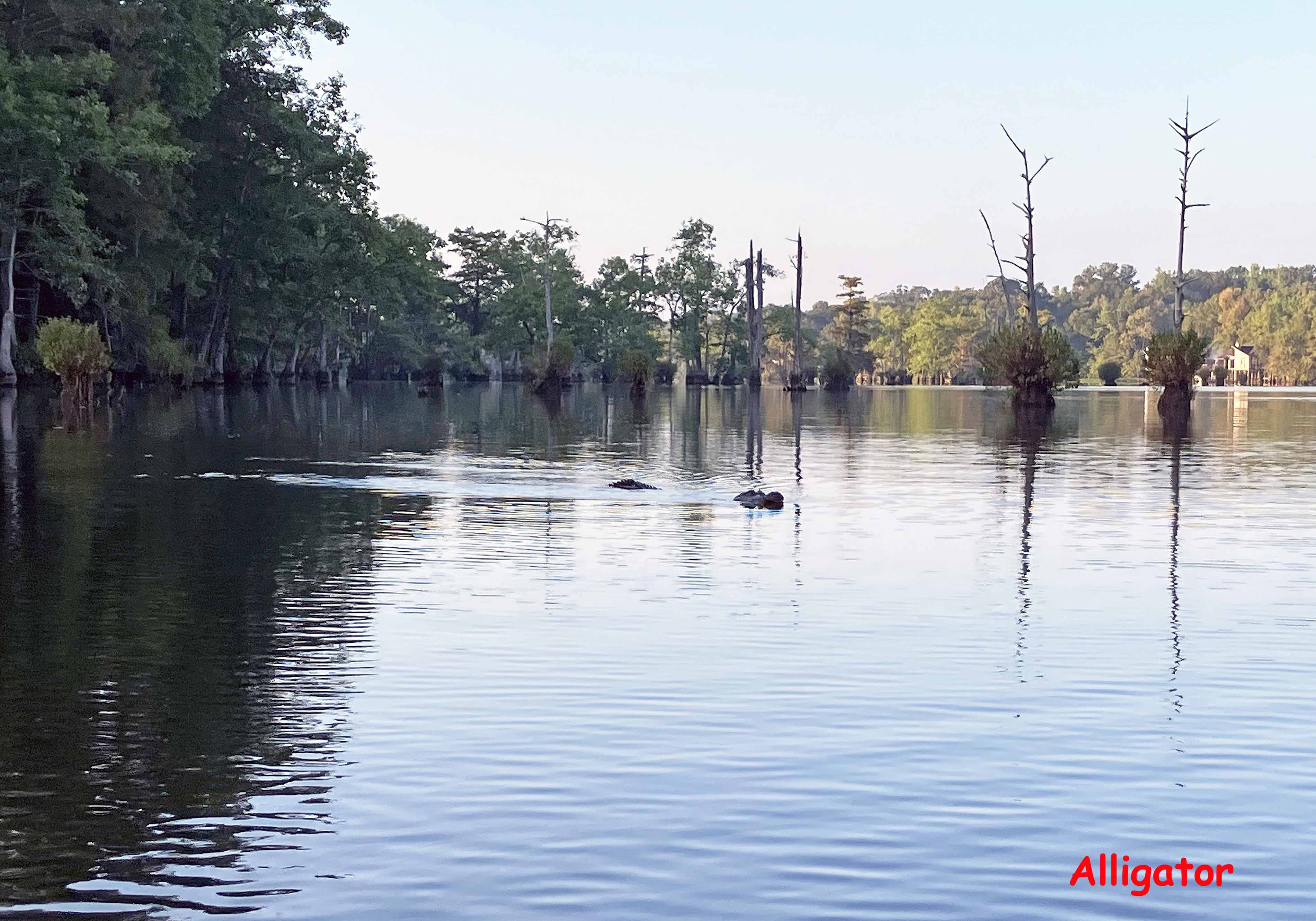 Lake Chicot is a thin strip of a lake midway between Alexandria and Lafayette and only a few miles from I-45. For this kayak trip I launched at the East Boat Ramp and hugged the shore around the entire south side of the lake, until I got back level with the launch. As a result the red trail line has the same contour as the shoreline. It’s a beautiful park and there are lots of tupelo trees in the water, one of which had two trunks (see picture). Nice early morning paddle around the lake, next time I will try the north side.