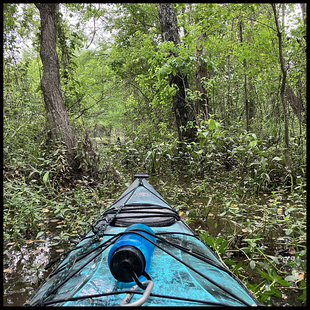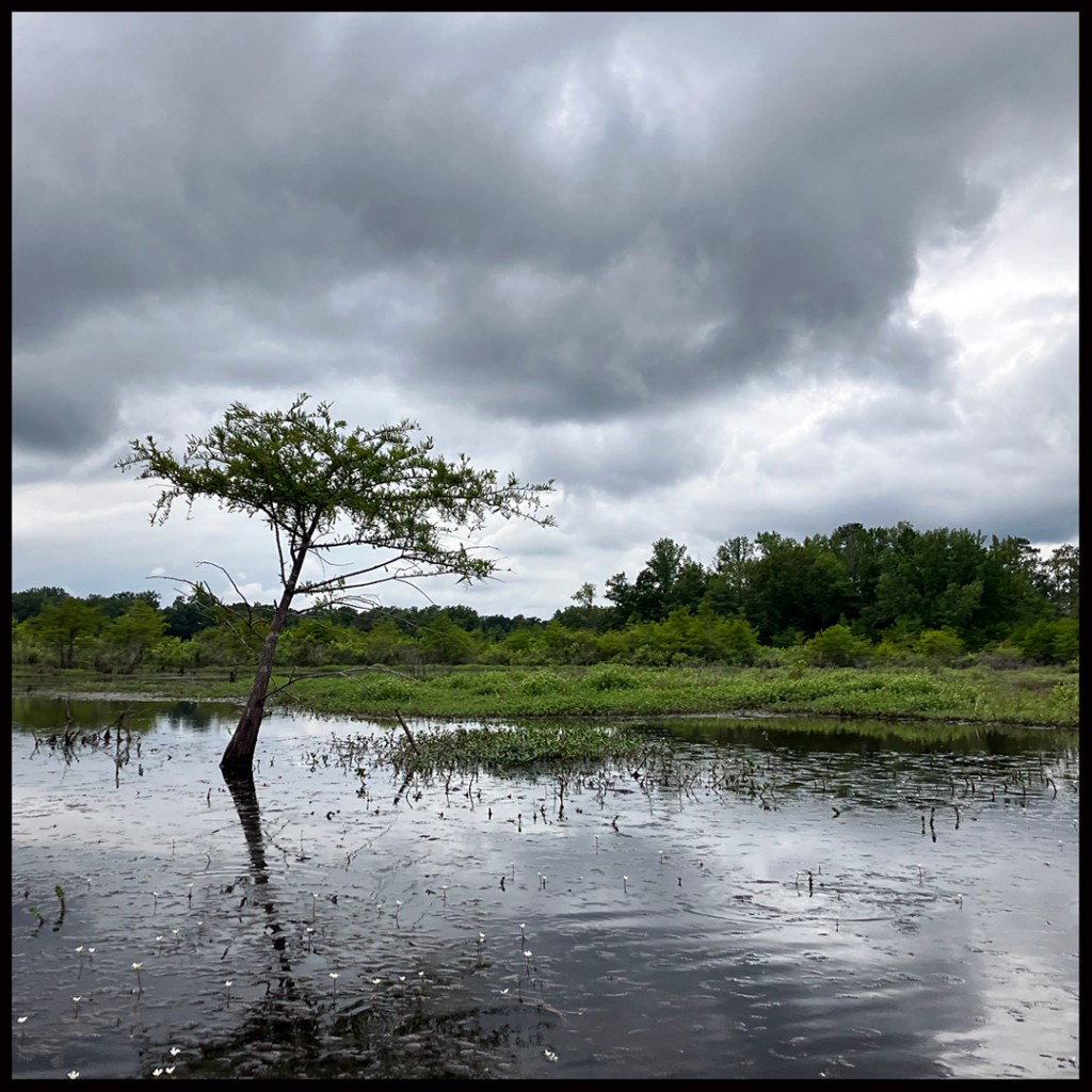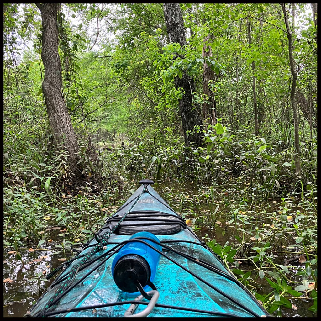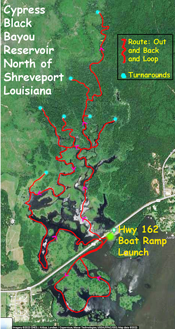 Northwest Louisiana region has so many nice places to paddle. One such spot is the Cypress Black Bayou Reservoir/Lake. It’s only an hours drive from the Texas Caddo area, and about 10 miles north of Shreveport. The put-in for a swamp paddle is the Highway 162 Boat Ramp. The red lined route in the map is just a jumble of try this, try that. It initially heads north into the bayou as far as possible but, since it’s not a huge area, it also explores many of the available side channels and takes a short loop around a few islands in the lake itself. Any route will be about as good as any other here, it can be made up on the spot. Great place, and a cool overcast day for a trip. There may be a fee or permit at the boat launch, but I can’t recall if it applies to paddled boats or not.