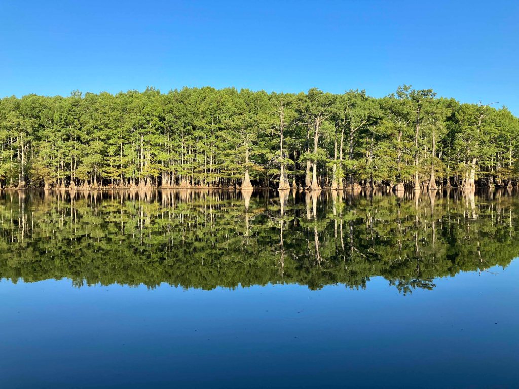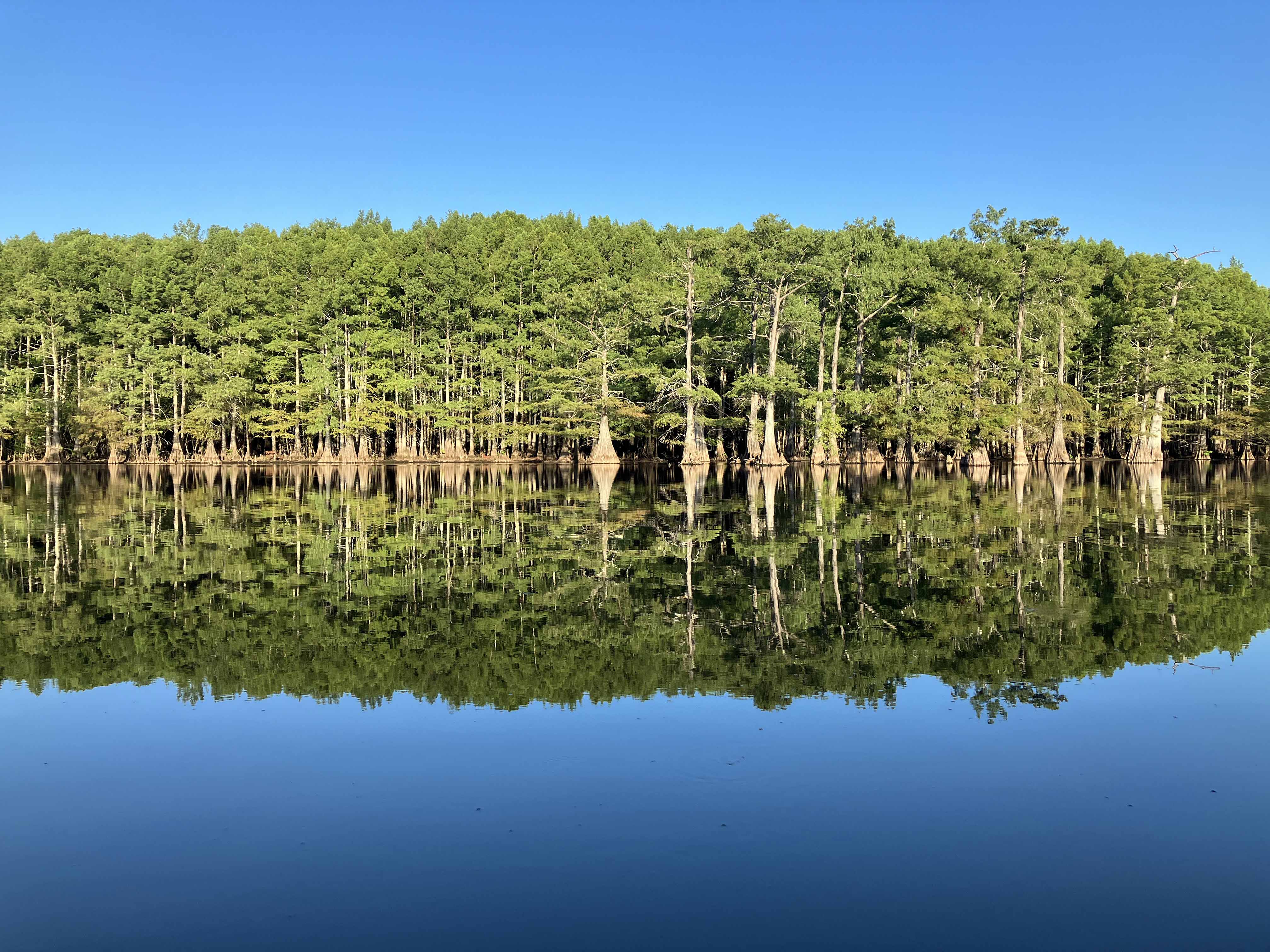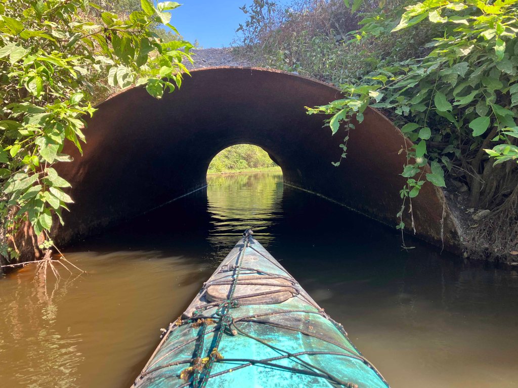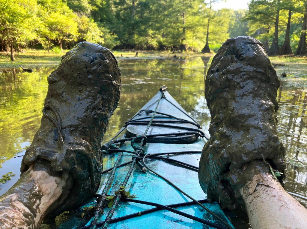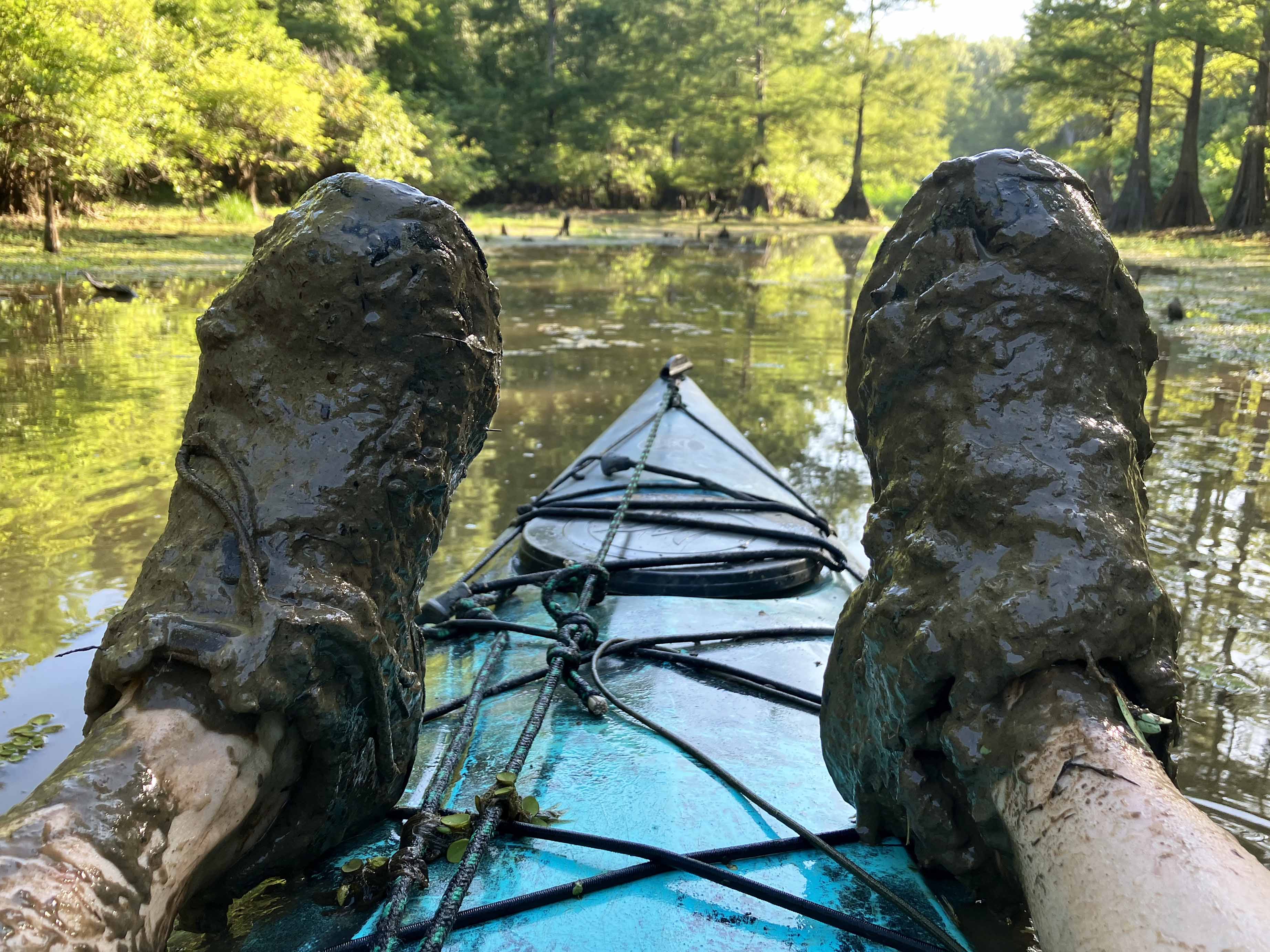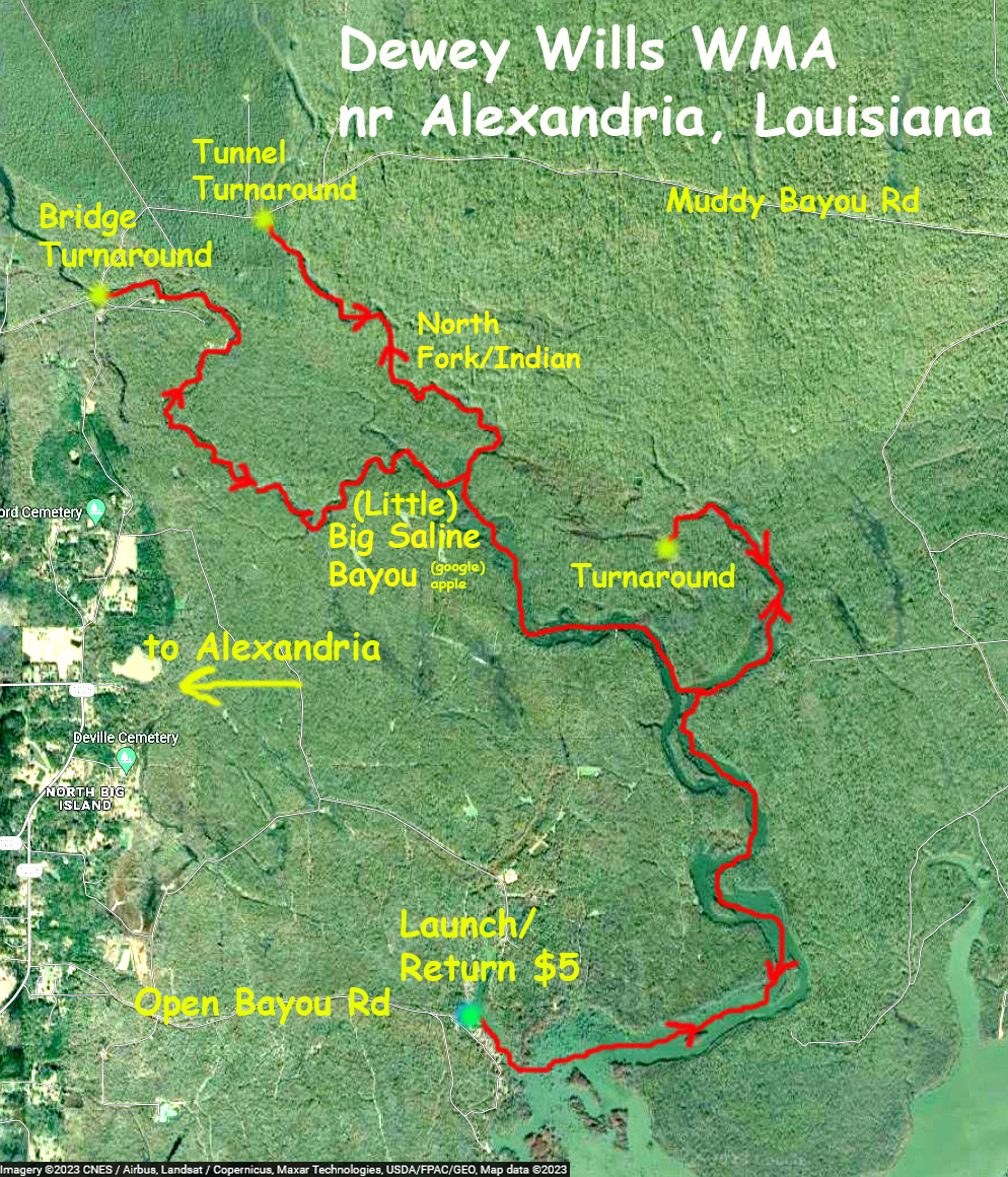 The Dewey Wills WMA is a large area east of Alexandria, Louisiana that has many paddling possibilities. The area is bounded on the north by the large Caahoula Lake, on the south by Saline Lake, and the east by Larto Lake. The route above started on the west side at a private launch ($5) at the end of Open Bayou Road, and went north along several north-south bayous. This was a long paddle with multiple out and back branches. It was summer, and in the heat, but fortunately some of the channels were well shaded. As the first picture below shows, some turnarounds were muddy. Many DIY paddle routes could be designed in this WMA, it is so large, especially routes along Muddy Bayou in the center of the WMA, and those that start from launch points near Larto Lake to the east. My trip here was a bit restricted due to very low water levels, but it’s an extensive area that could be paddled and explored for days.
