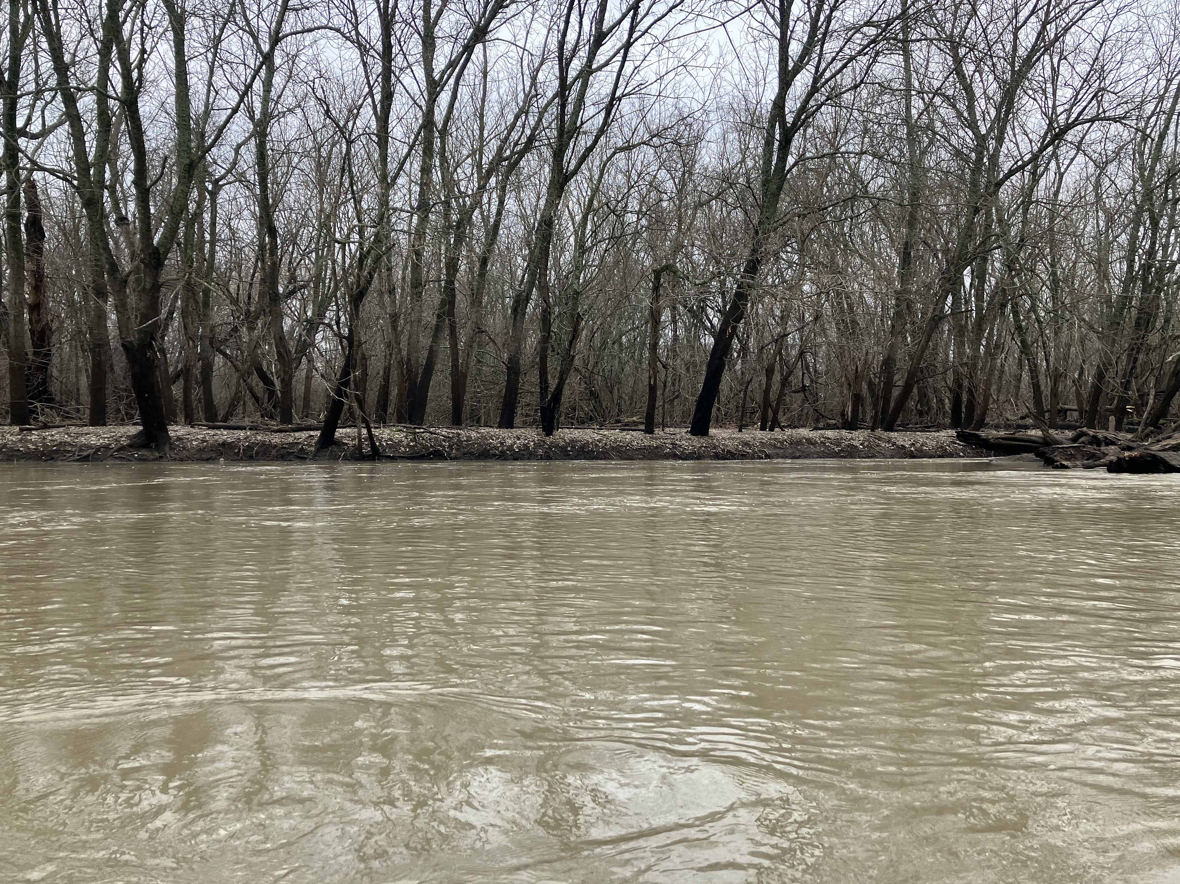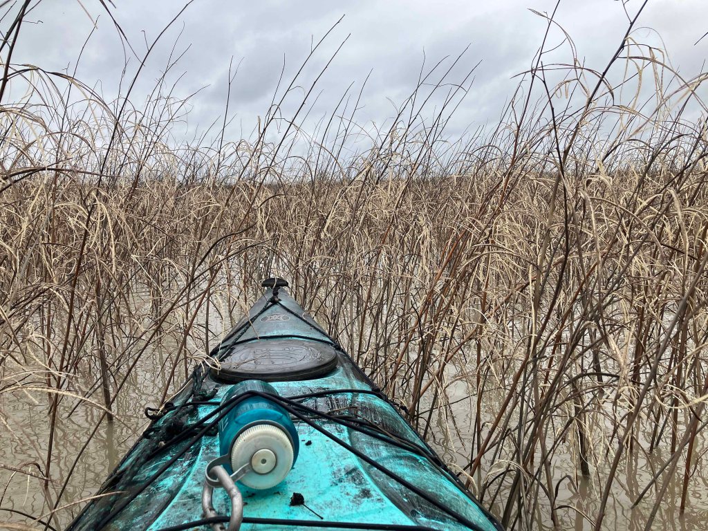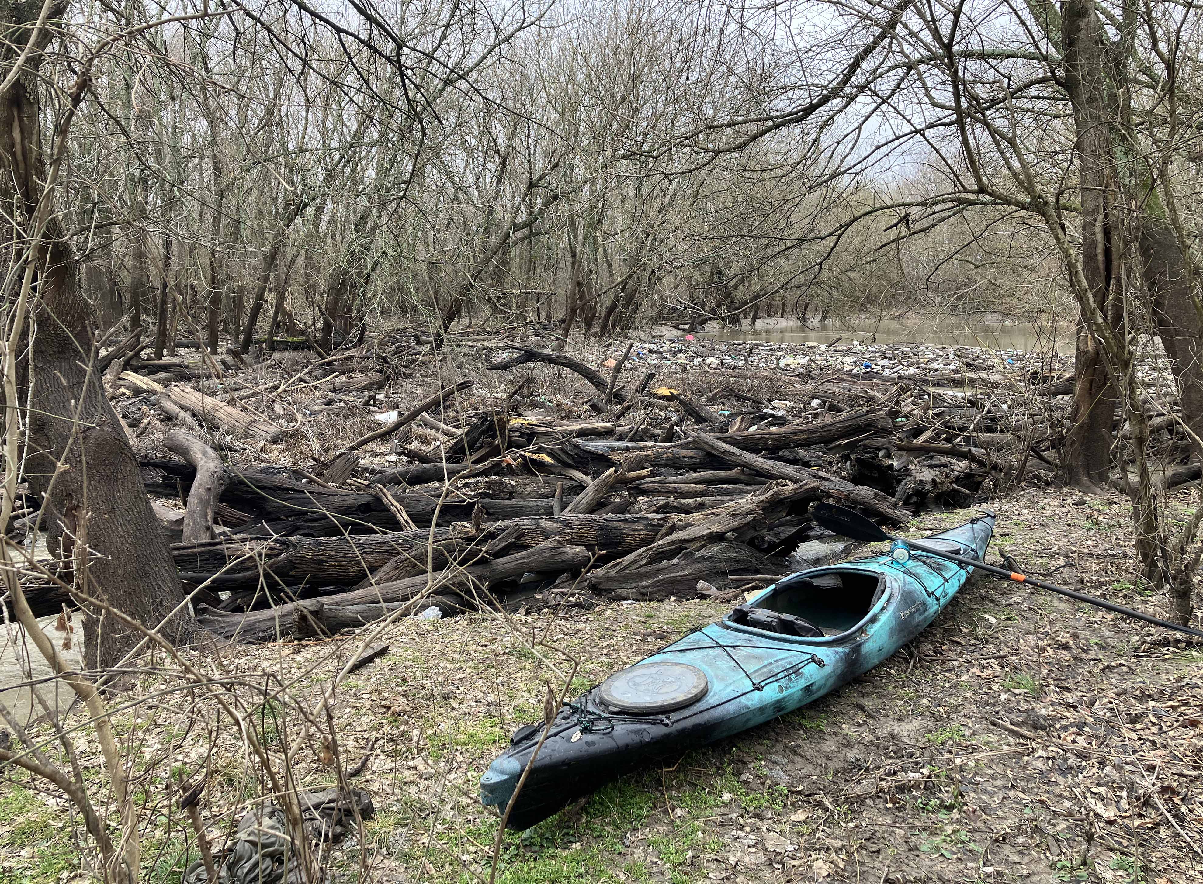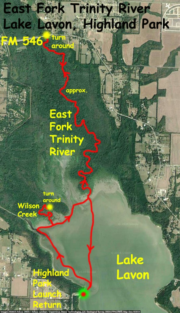 The north end of Lake Lavon is split into a west side and an east side. The launch on the west side is at Highland Park. From here you can access Wilson Creek and the East Fork of the Trinity River. The East Fork runs into Lake Lavon, then into Ray Hubbard, and eventually into the Trinity River well below Dallas. From the Highland Park launch you can go at least partway up Wilson Creek, although there was a beaver dam that I didn’t cross. And you can paddle east to find the mouth of the East Fork where it enters the lake. Once I tried this and I could only get up upstream a short distance before I encountered a huge logjam. Another time I couldn’t find the entrance to the river due to the shallow water and all the brush. For the trip here I managed to find the right channel and made it to the turnaround at FM546/Lowry Crossing. This was a pretty tough paddle with five or six muddy portages up (and back). It took some determination to finish the job. The water was muddy, the banks were muddy, the boat was muddy, and the paddler was muddy. Satisfying on completion though.