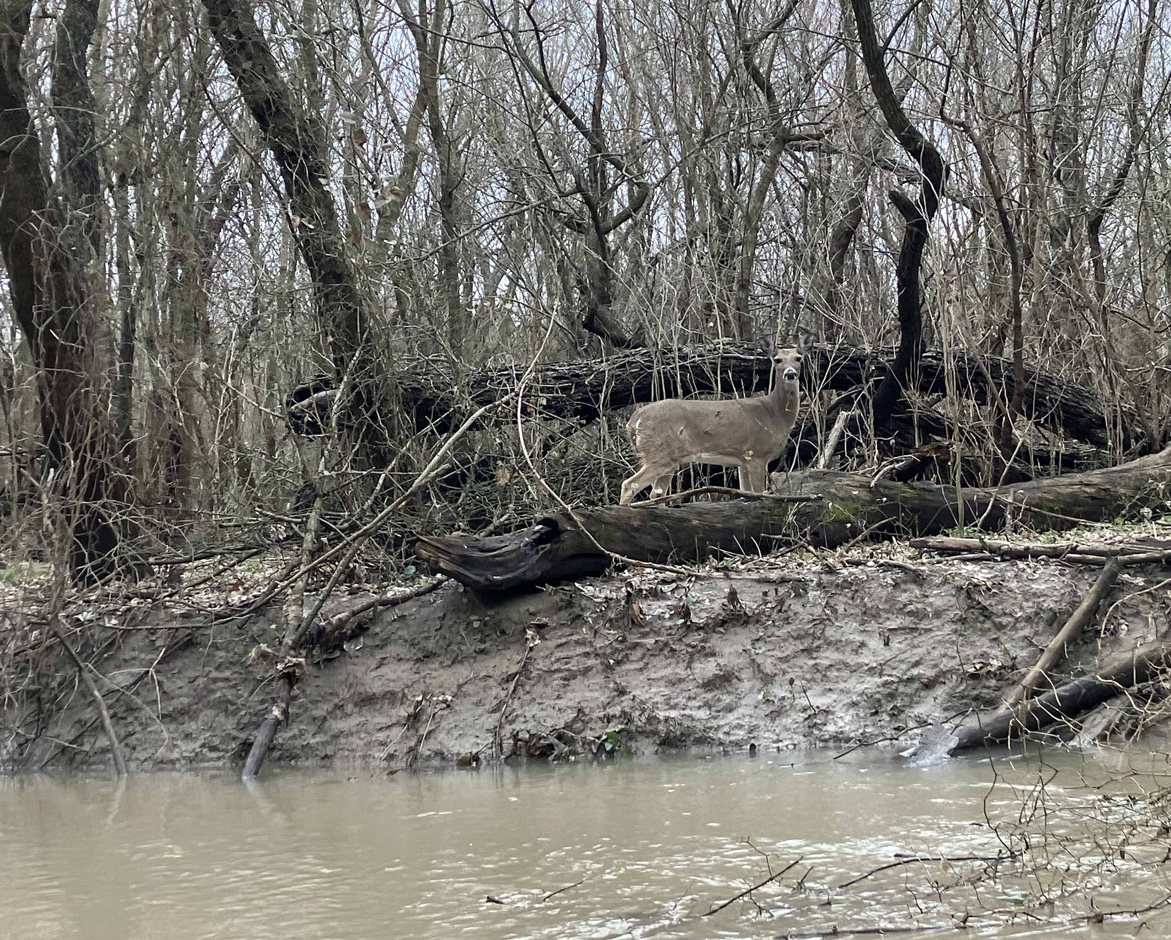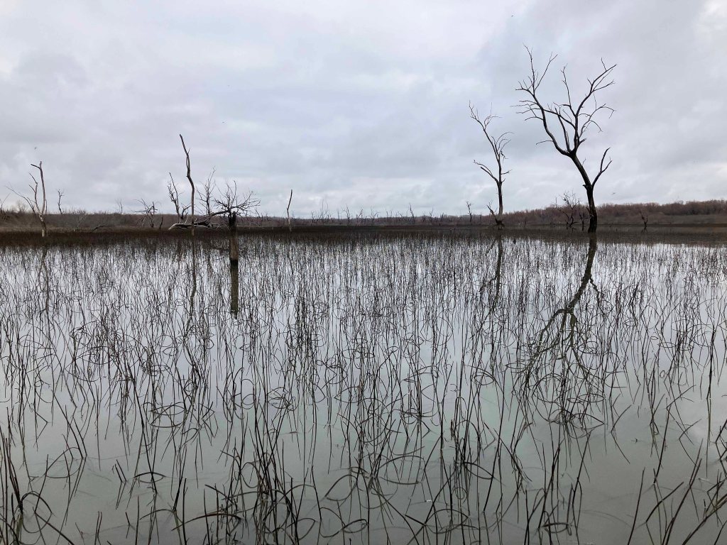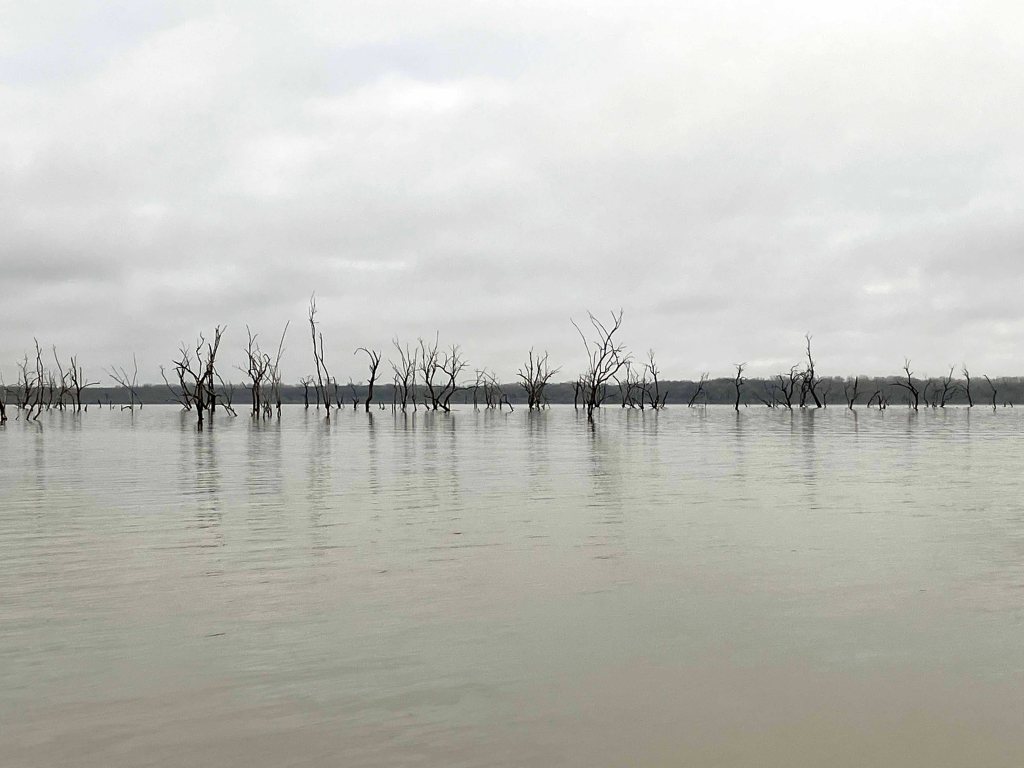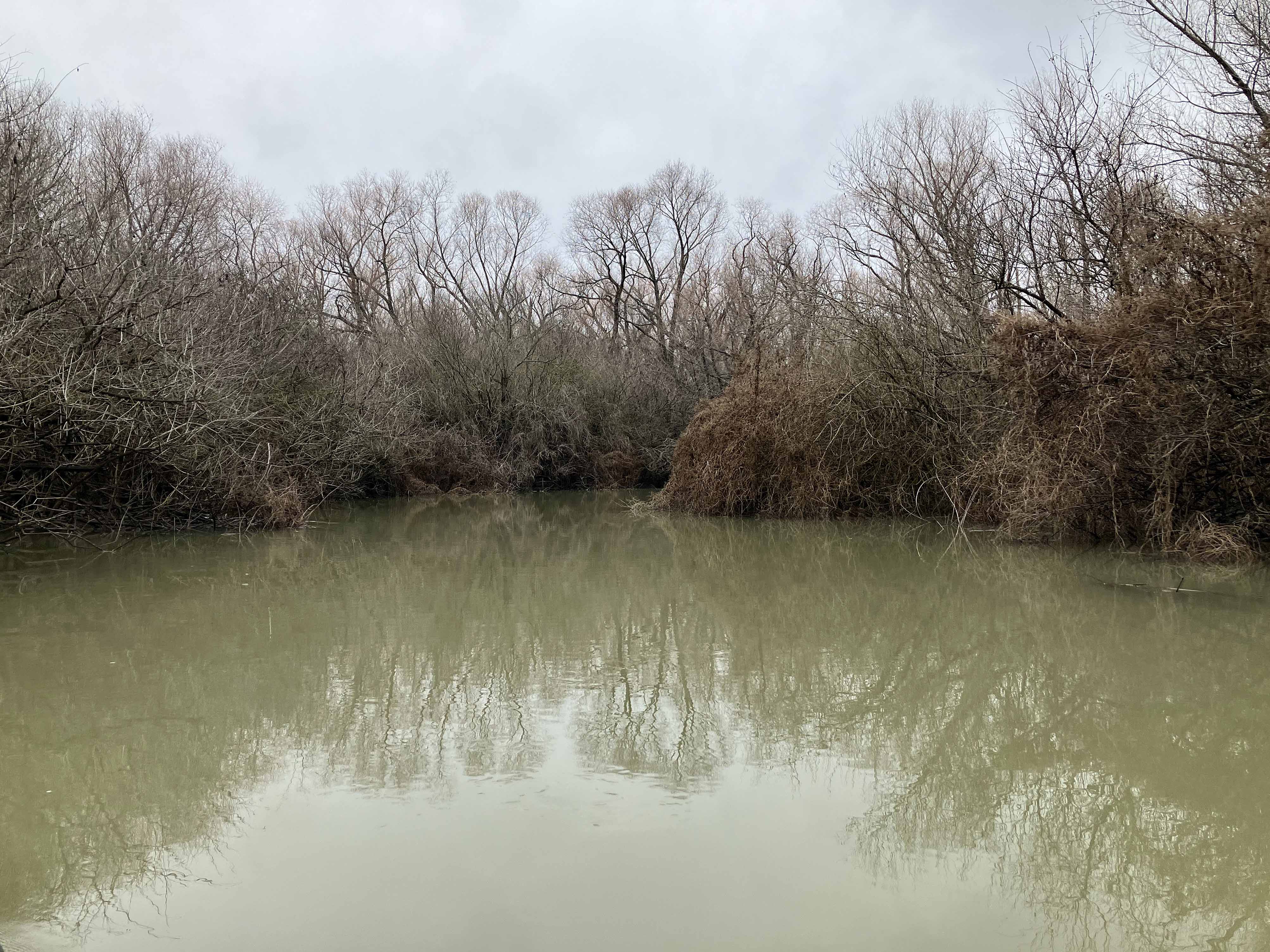 The north end of Lake Lavon is split into a west side and an east side. The launch on the west side is at Highland Park. From here you can access Wilson Creek and the East Fork of the Trinity River. The East Fork runs into Lake Lavon, then into Ray Hubbard, and eventually into the Trinity River well below Dallas. From the Highland Park launch you can go at least partway up Wilson Creek, although there was a beaver dam that I didn’t cross. And you can paddle east to find the mouth of the East Fork where it enters the lake. Once I tried this and I could only get up upstream a short distance before I encountered a huge logjam. Another time I couldn’t find the entrance to the river due to the shallow water and all the brush. For the trip here I managed to find the right channel and made it to the turnaround at FM546/Lowry Crossing. This was a pretty tough paddle with five or six muddy portages up (and back). It took some determination to finish the job. The water was muddy, the banks were muddy, the boat was muddy, and the paddler was muddy. Satisfying on completion though.