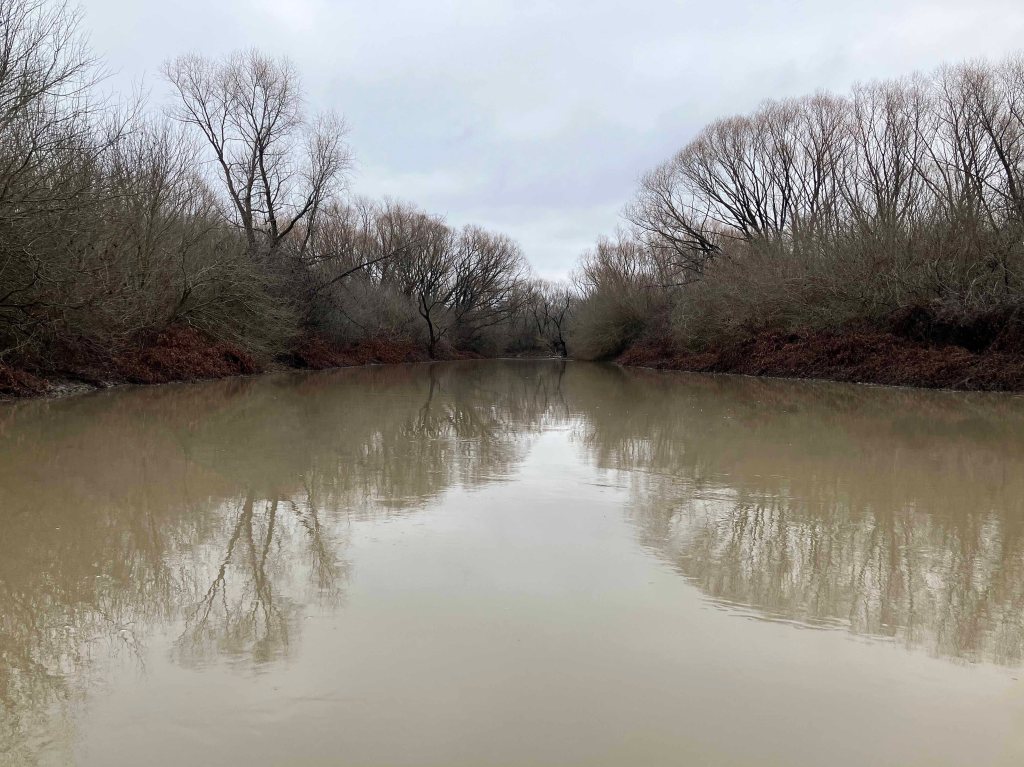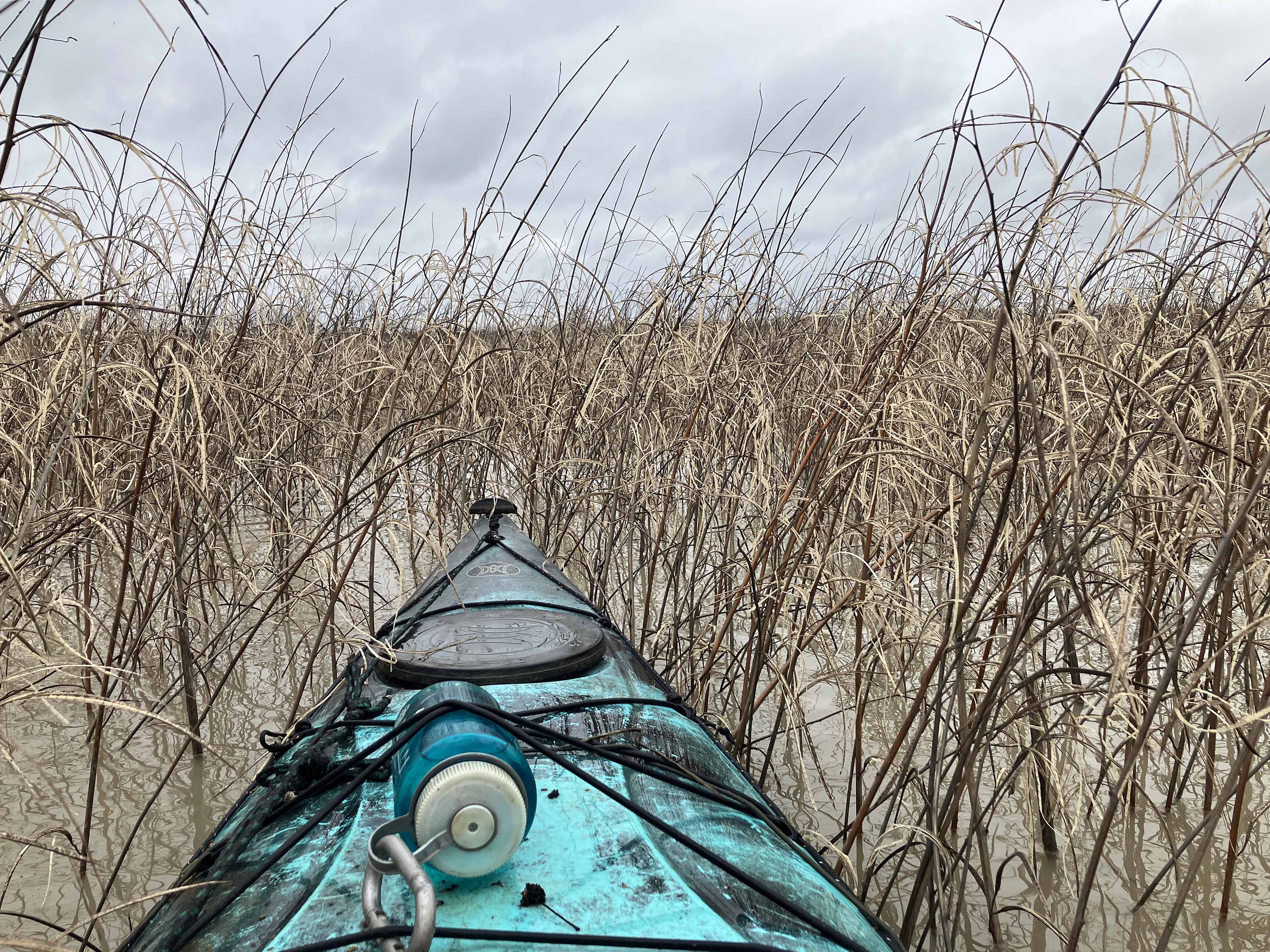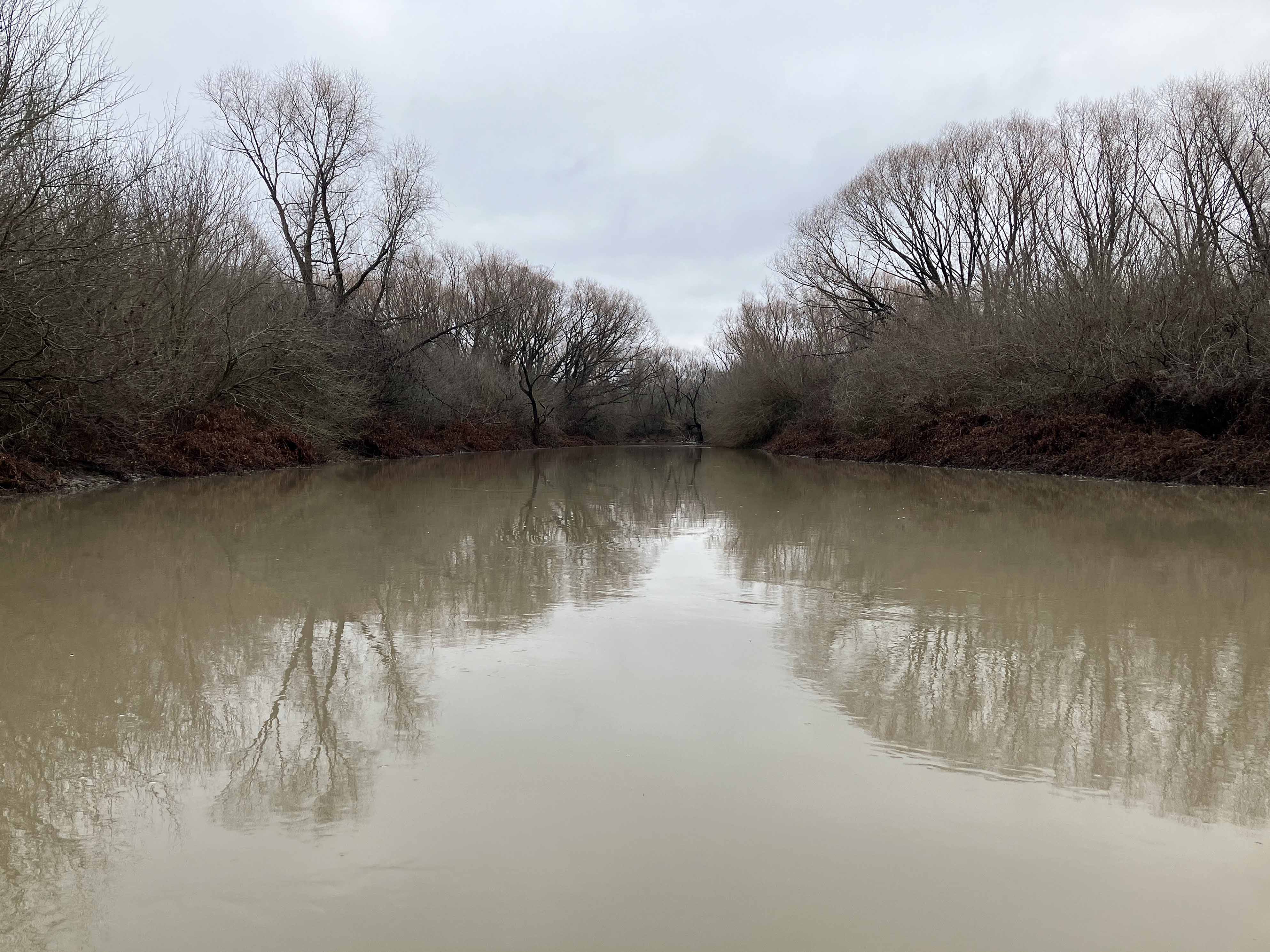 Above: Through brush and shallow water, trying to hit the entrance to the East Fork.