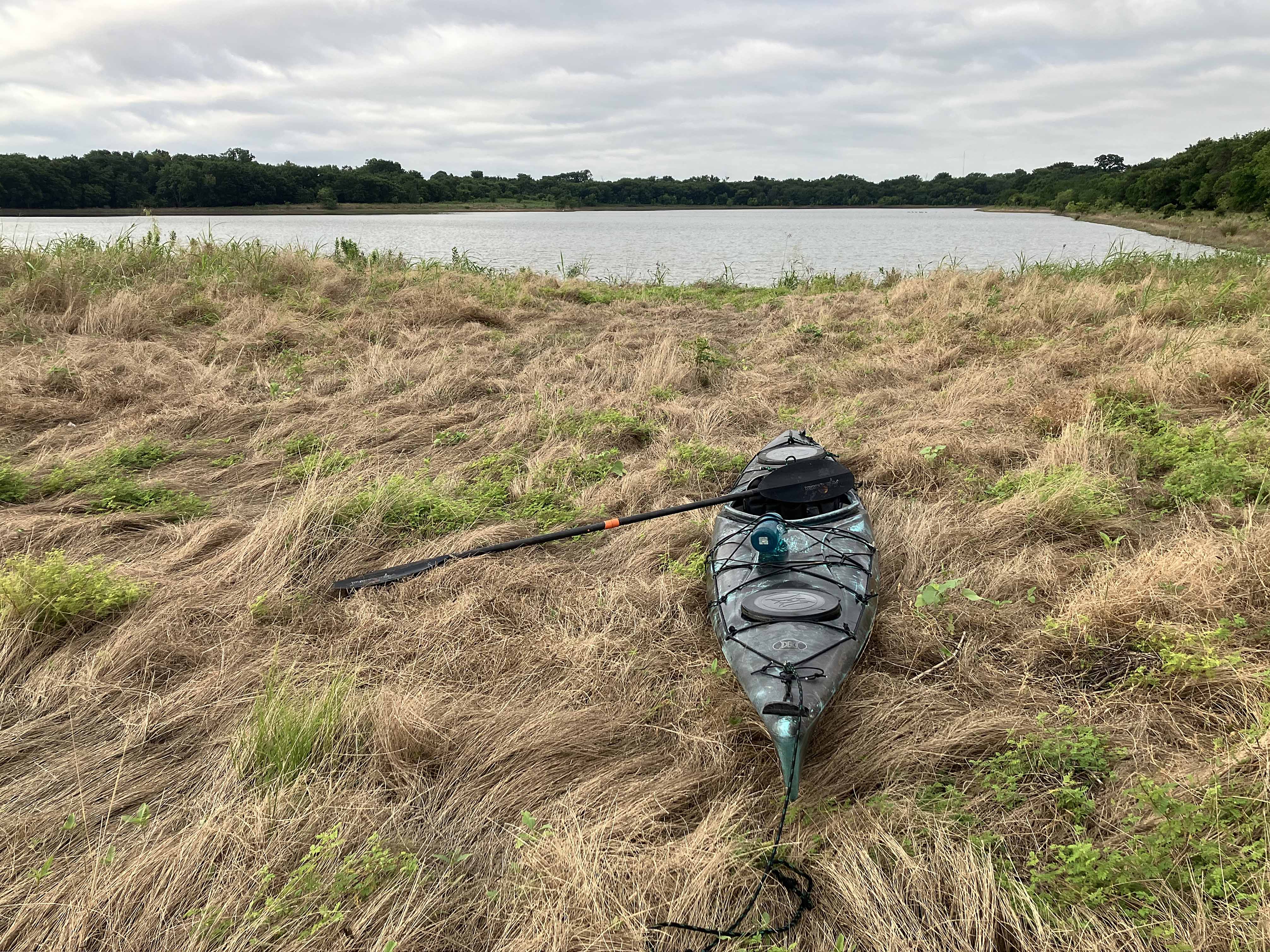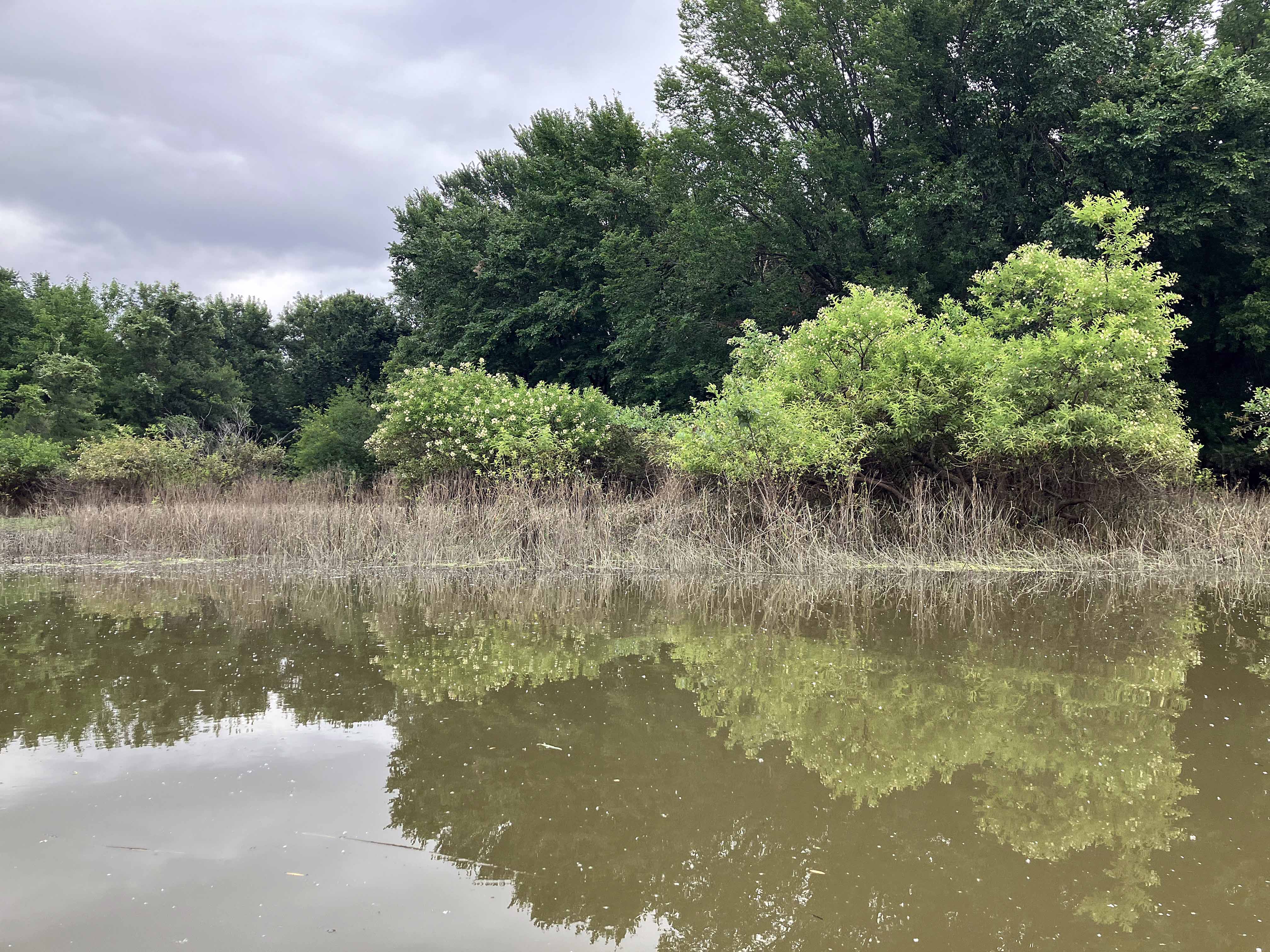 A popular launch site for the Elm Fork of the Trinity River is at McInnish Park in Carrollton. A google map of the area shows several small lakes nearby (Lost Lake, Hidden Lake), and if water levels are right it is possible to paddle through all of these using only a few short portages (shown as yellow lines on map above). These lakes can also be accessed by going up Denton Creek a few hundred yards or so and turning right into a small entry channel. The route shown in the map is arbitrary, just hitting everything one after another. It first goes up the Elm Fork into the small eastern lake near Pres. George Bush Turnpike (PGBT), then crosses back to do the four lakes on the other side. These lakes are a change of pace from the typical up to Hebron and back route. The scenery is pretty decent for being nested in an urban area, although there are a lot of big utility lines. There are a couple tunnels as well but whether you can go through depends on water levels. The western lake adjoins the Dallas Gun Club and, as they are closed Monday and Tuesday (as far as I know), those would be the best days to avoid getting shot.