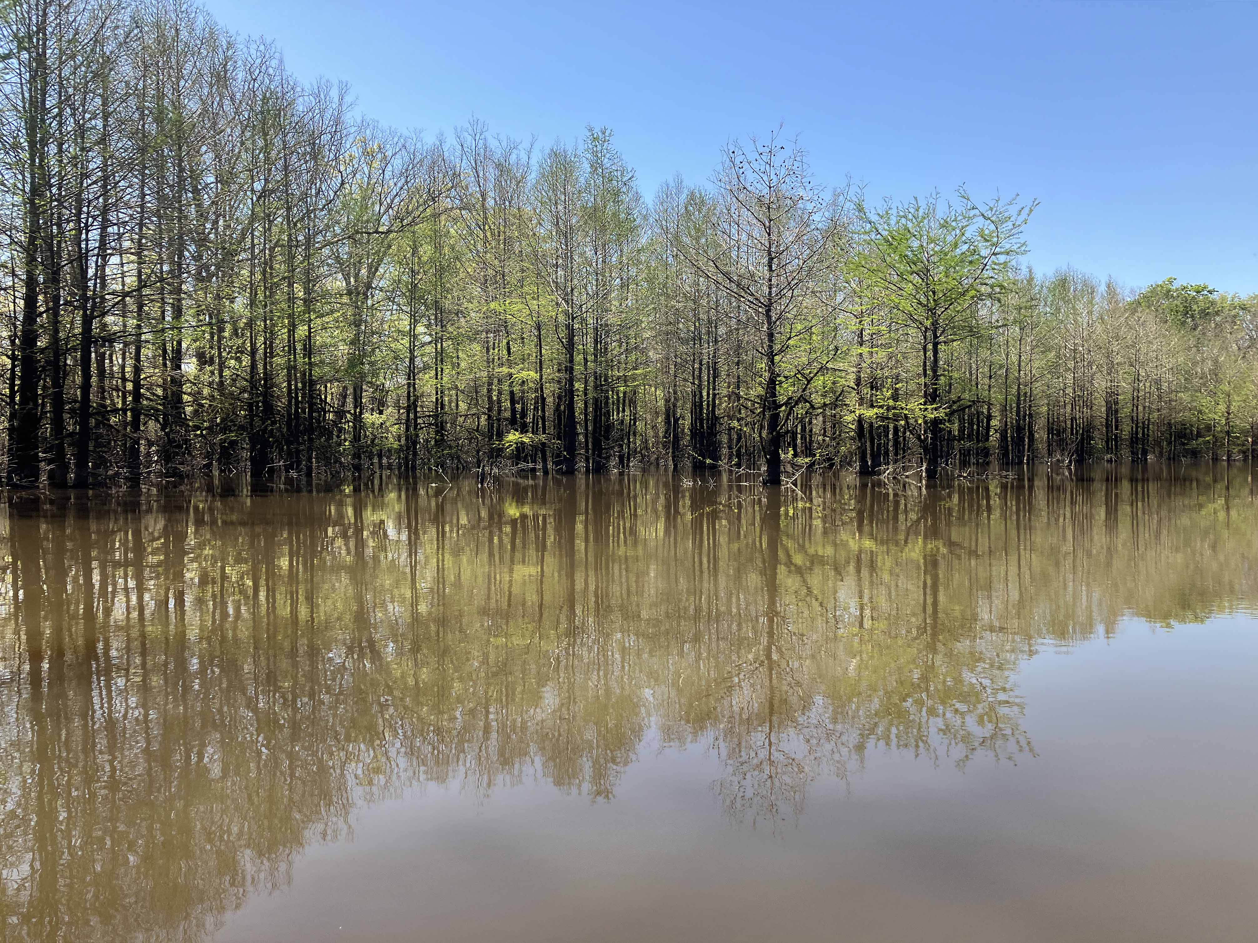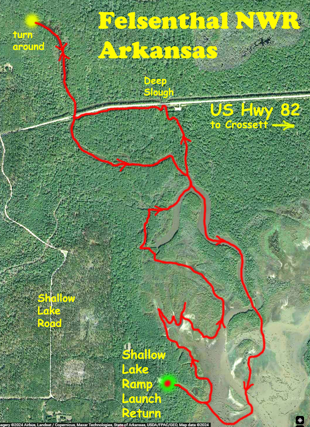 Felsenthal is amazing. It’s a huge National Wildlife Refuge in south-central Arkansas just west of Crossett. There are numerous boat launch options, and lots of DIY paddling trails to be designed. A lot to do for sure, and the individual routes in this section are designated A, B, C…etc. The trail in the above map launches at the Shallow Lake Ramp in the Felsenthal NWR, Arkansas. This ramp is down a gravel road that goes several miles south off of Highway 82, a bit west of the Ouachita River bridge. Because it’s a ways from the highway this launch is less used. There is also a primitive camping area here, which I used, and which is quite nice. This trip was my first time here and to be sure of my bearings the kayak route hugs the west shore and kind of half follows a Felsenthal NWR paddle route published by the refuge (although there were only one or two markers so the route isn’t so clear actually). At Highway 82 I unfortunately couldn’t get further up Long Branch due to shrubs and vegetation so I turned around. It is nice to paddle into the clusters of cypress trees that grow in open water and sit and enjoy the shade and silence, looking out on the rest of the lake. A DIY self-signed access permit from the Felsenthal brochure is needed. Felsenthal is a BIG place and there is lots to explore on both the east and west sides of the Ouachita River.