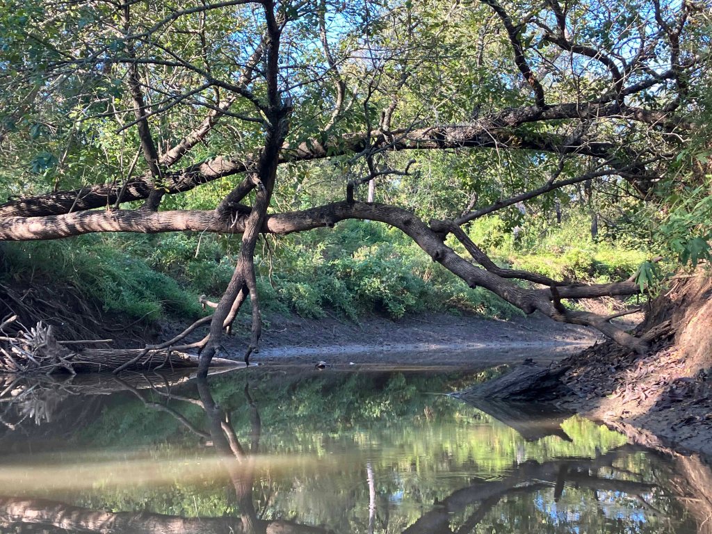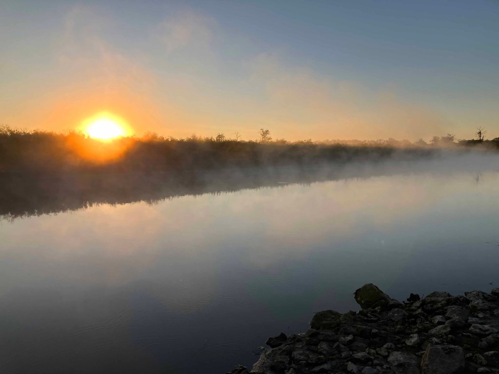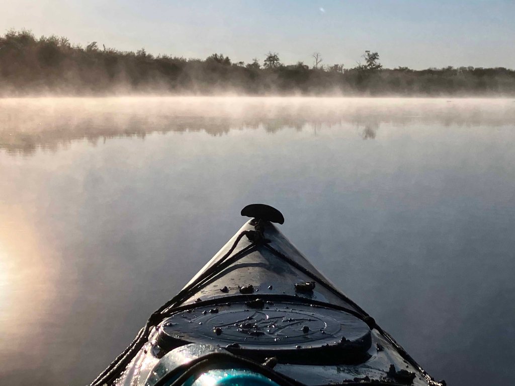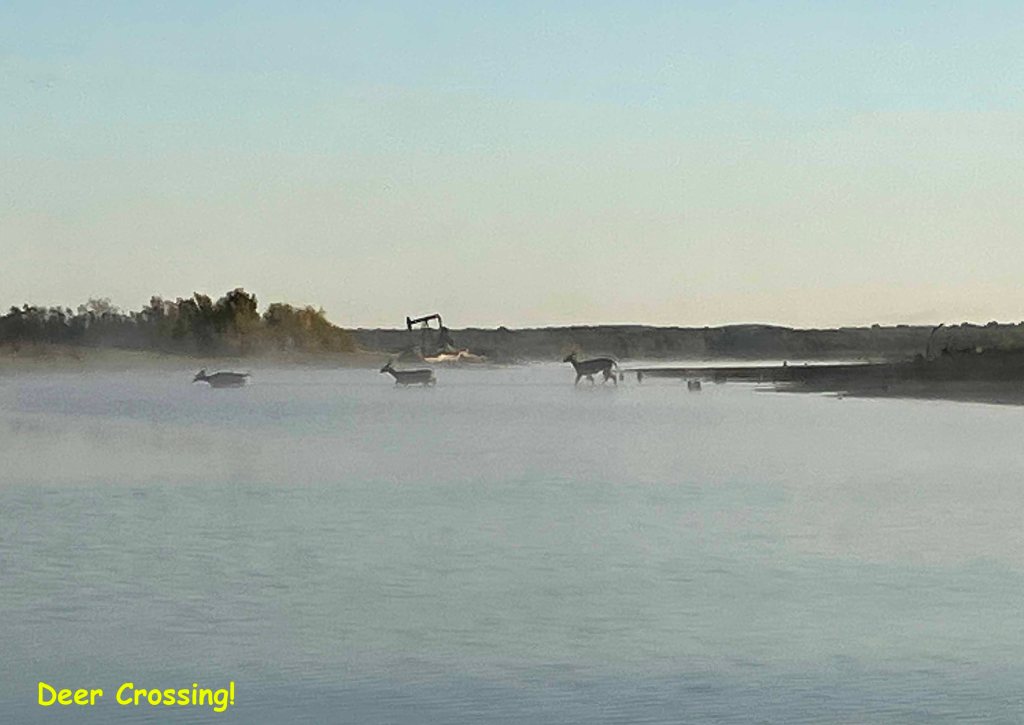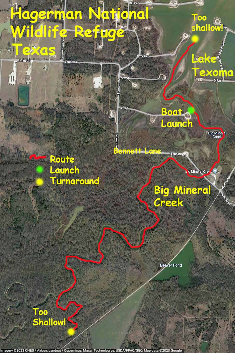 Hagerman National Wildlife Refuge (and oil field) is about 20 minutes west of Sherman TX on Highway 82. It’s a very popular birding location and there are some boat launches for paddling and fishing. The boat launch on Pad L was used for this trip (see map above). I first tried to go out to the lake but the water was too shallow and I got stuck. So, I went the other way up Big Mineral Creek until it too got shallow. Hagerman seems different every time, there is always something new to see, the birds add a lot of life to the place, and there is a lot of season to season variation. This trip I saw three deer crossing the lake (see picture) and scenery in the early morning light was amazing.