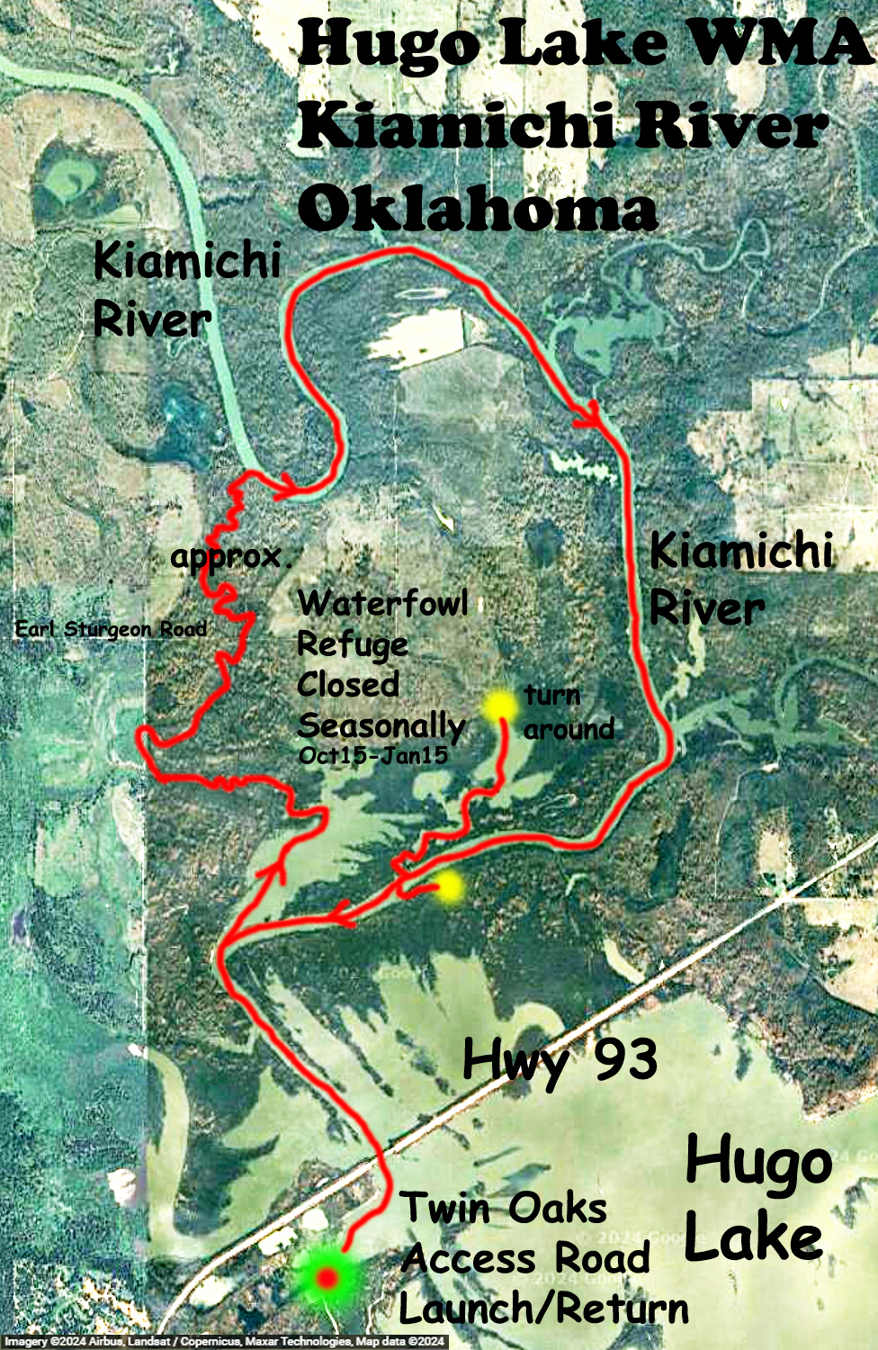 The Hugo WMA located between Antlers and Hugo Oklahoma was a total surprise. It’s close to Dallas (~2 hr) and has multiple kayak trail options (all DIY of course, and labeled here as A, B, C…etc.). The map above traces the first one I did, launching down a dirt road off of Highway 93 called Twin Oaks Access Road. Primitive camping is permitted at a few sites near the launch but I didn’t stay there. This particular route goes north under the Highway 93 bridge, then up into a creek that twists back and forth as it makes its way north, finally reaching the Kiamichi River. Whether this can be done easily or not depends on the water level, and even when it’s high some portages around blockages will likely be required, especially at the Kiamichi junction (see pictures). In shallow water the area will be more restricted in terms of route options. Also the Waterfowl Refuge area is closed during the fall and winter and boating is not allowed. The Kiamichi River although fairly wide still feels isolated and wild, making the whole round trip feel especially remote. Nice place!