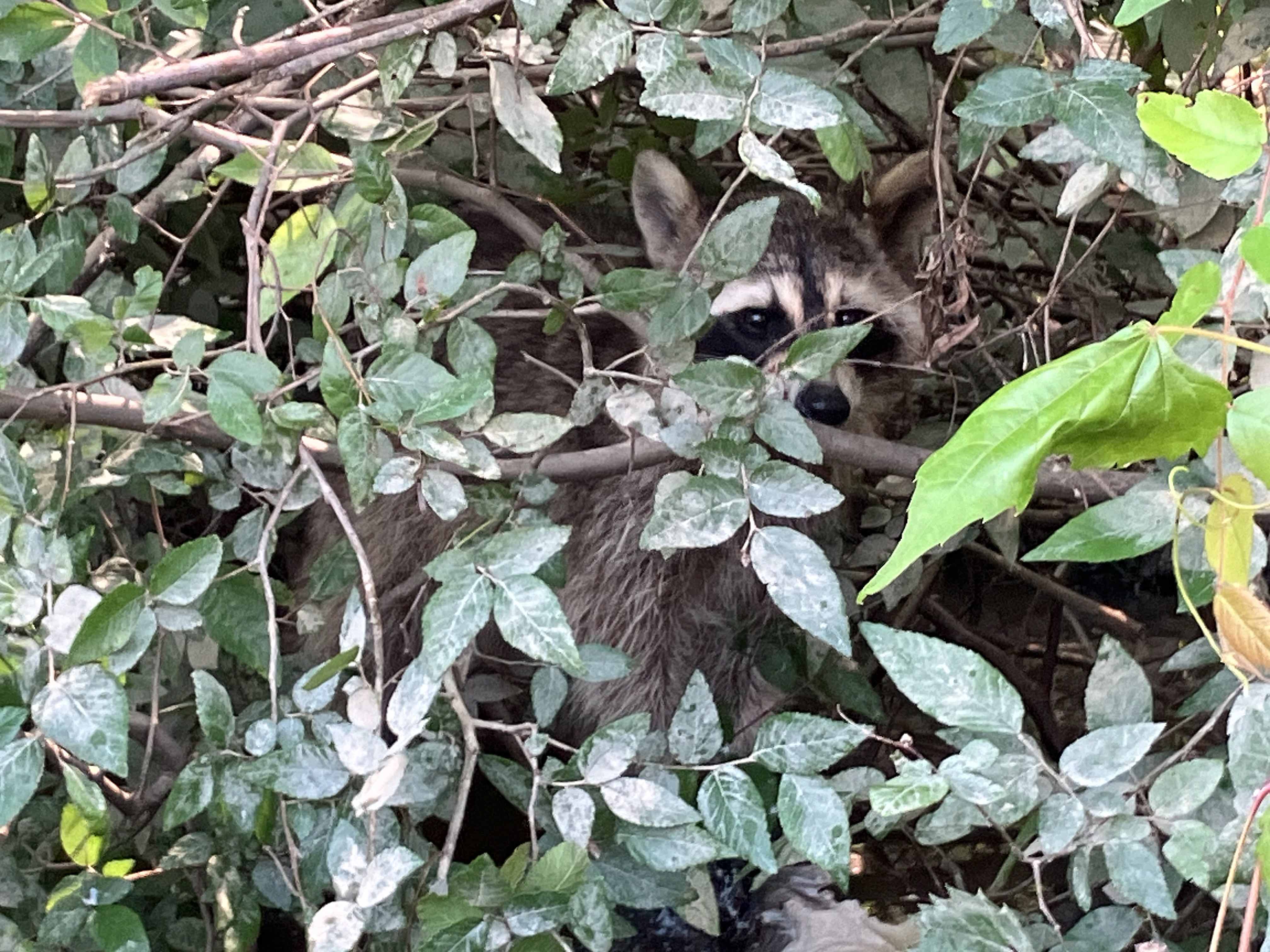 Above: This raccoon was eating a large dead fish that was caught in the branches over the water.