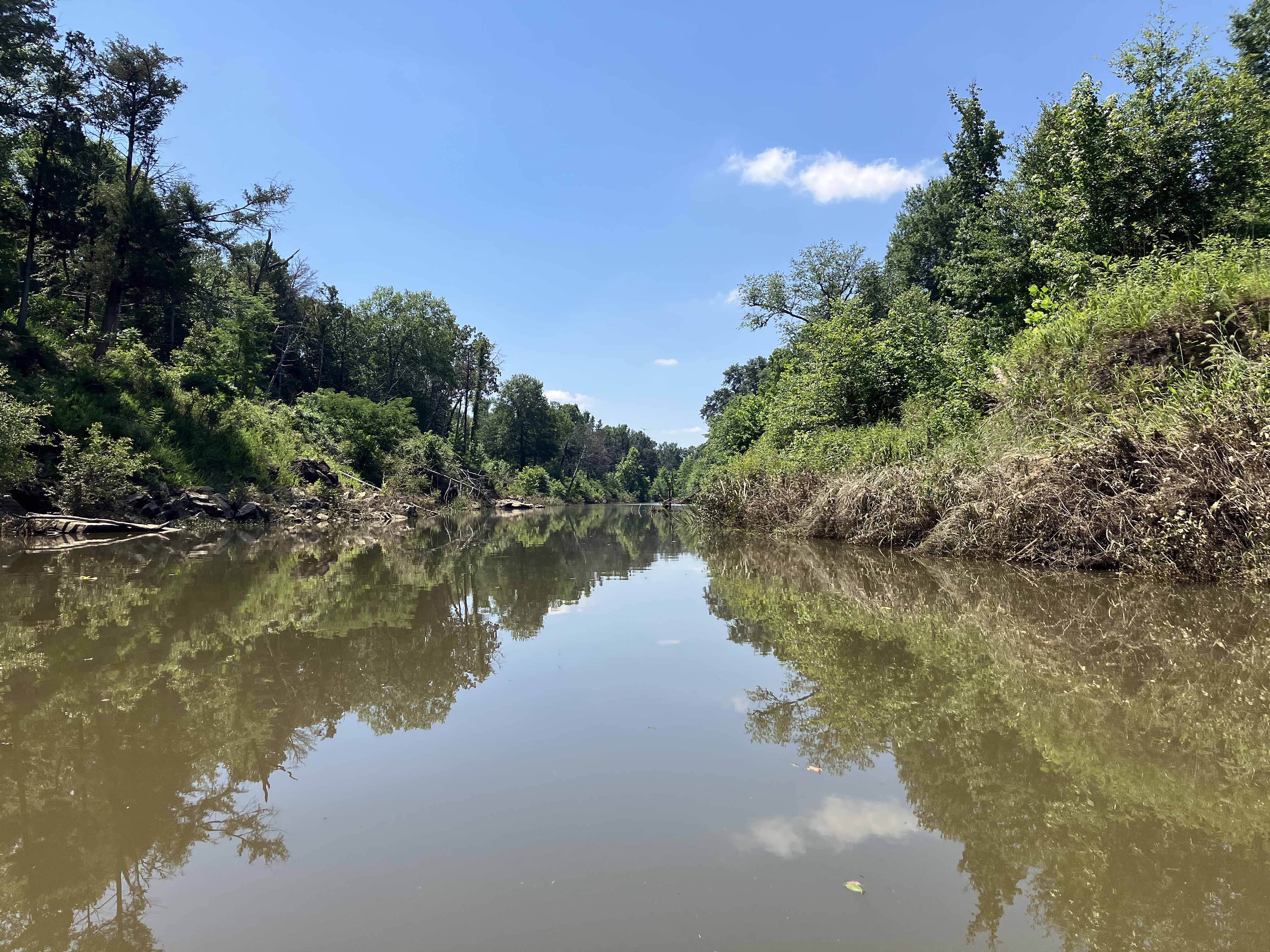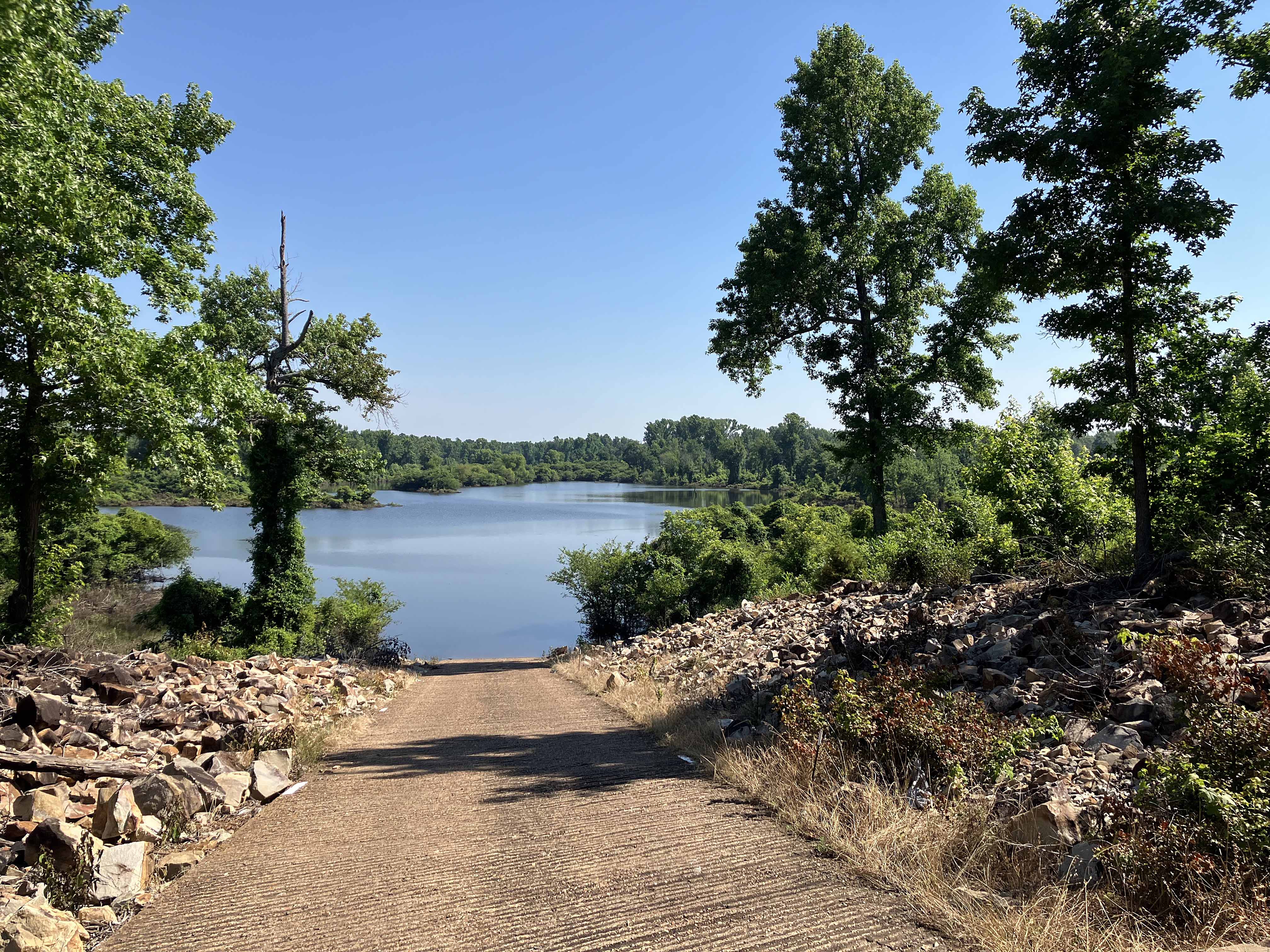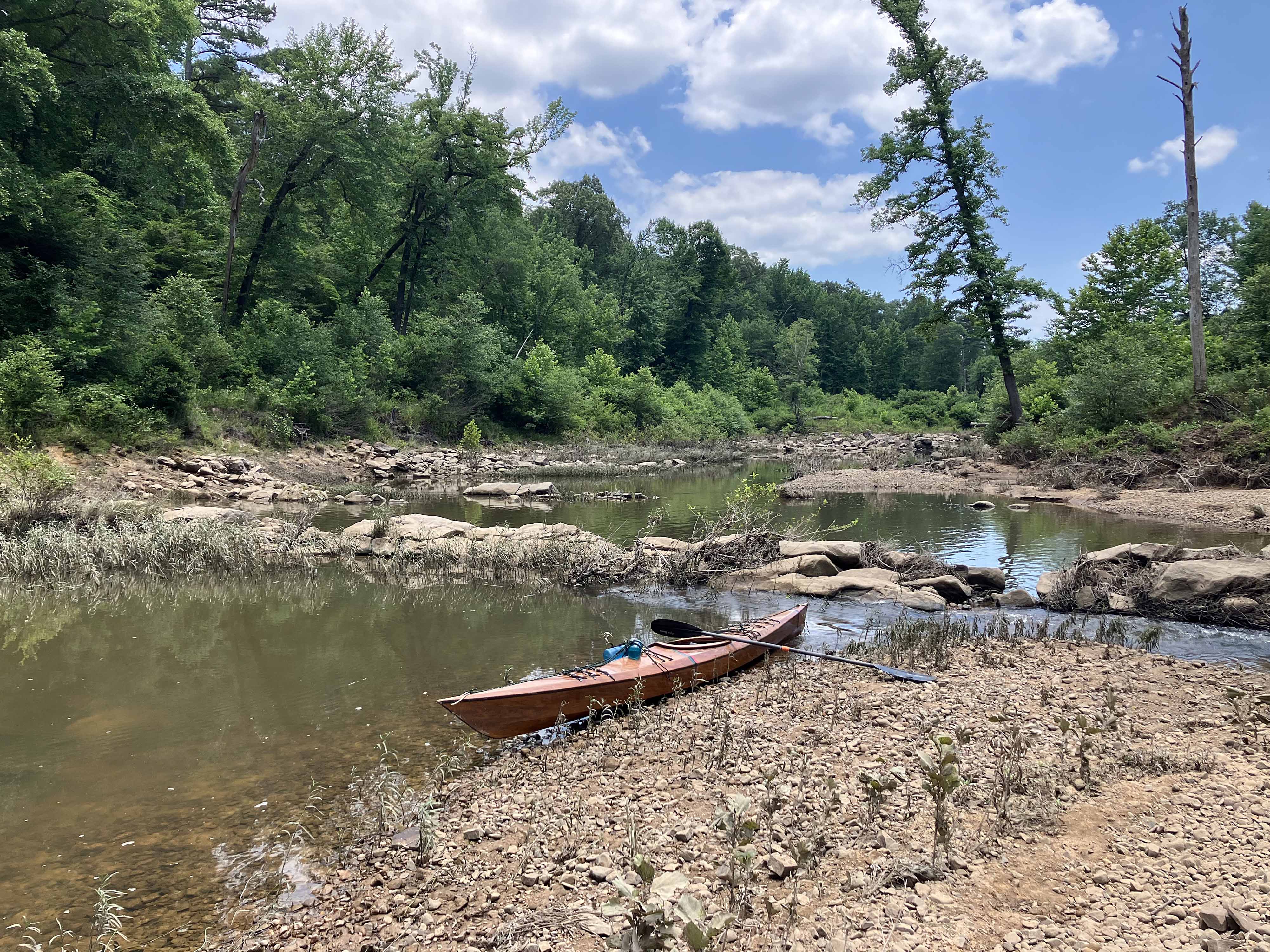 A kayak route in the Hugo WMA area of Oklahoma. This one starts at the Frazier Creek Recreation Area off of Highway 93. The ramp at the launch site is long and steep (see picture). For this trip I stayed in a tent at the COE Rattan Landing campsite. The route first goes north along the Kiamichi, then splits to go up into Rock Creek. After returning it goes up Frazier Creek and back. The turnaround points are when the creeks start to get narrow, shallow, and rocky. Beautiful day for sure. Idyllic.