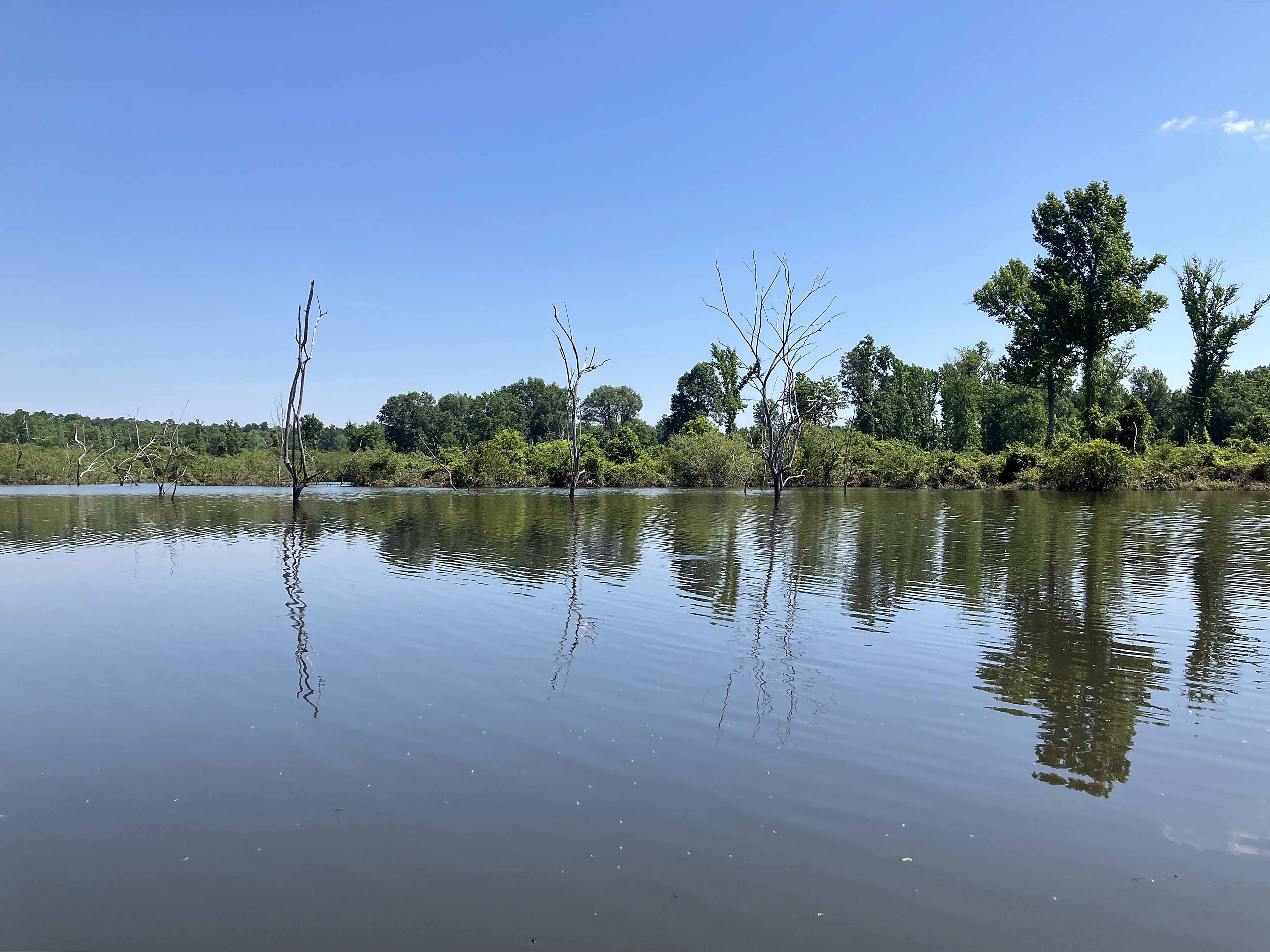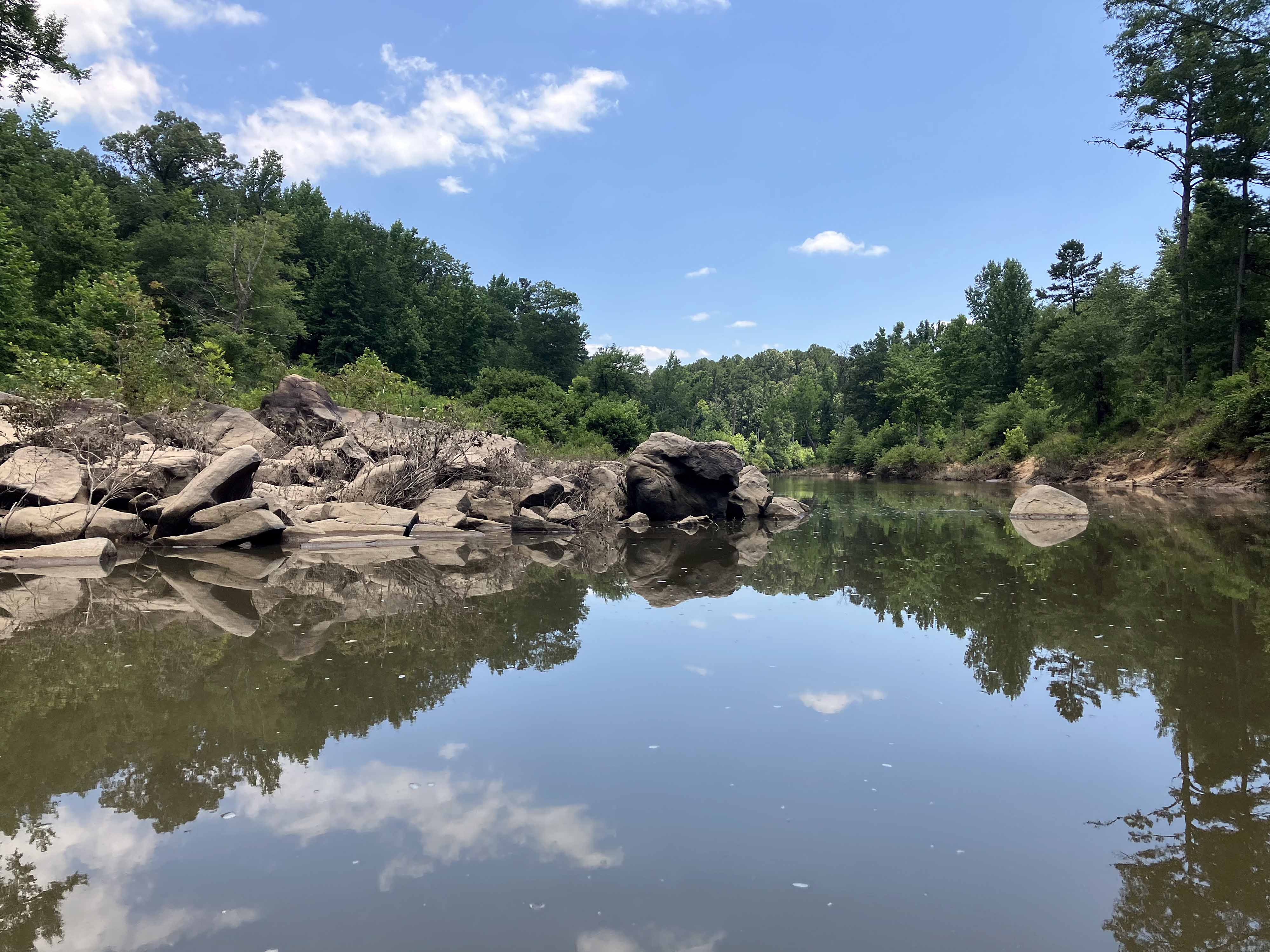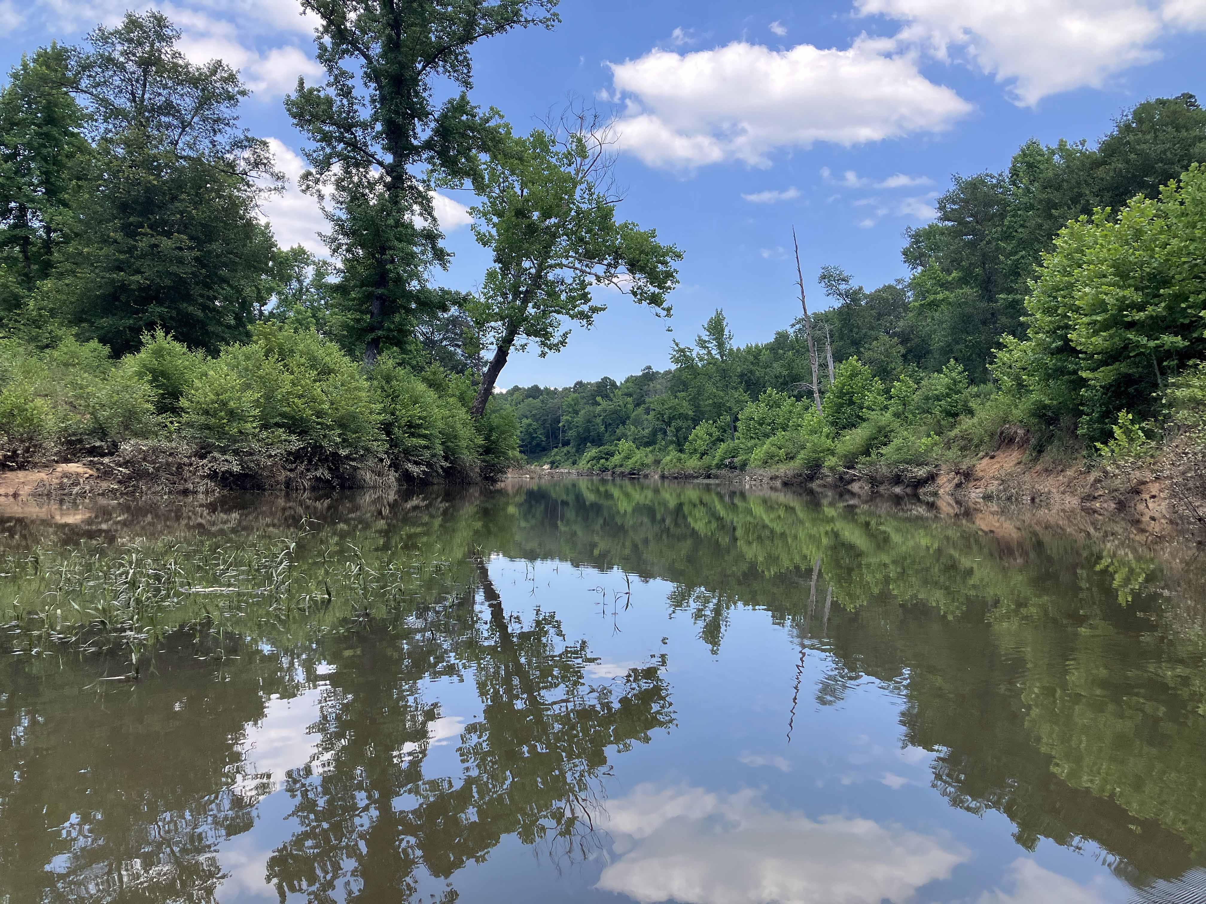 A kayak route in the Hugo WMA area of Oklahoma. This one starts at the Frazier Creek Recreation Area off of Highway 93. The ramp at the launch site is long and steep (see picture). For this trip I stayed in a tent at the COE Rattan Landing campsite. The route first goes north along the Kiamichi, then splits to go up into Rock Creek. After returning it goes up Frazier Creek and back. The turnaround points are when the creeks start to get narrow, shallow, and rocky. Beautiful day for sure. Idyllic.