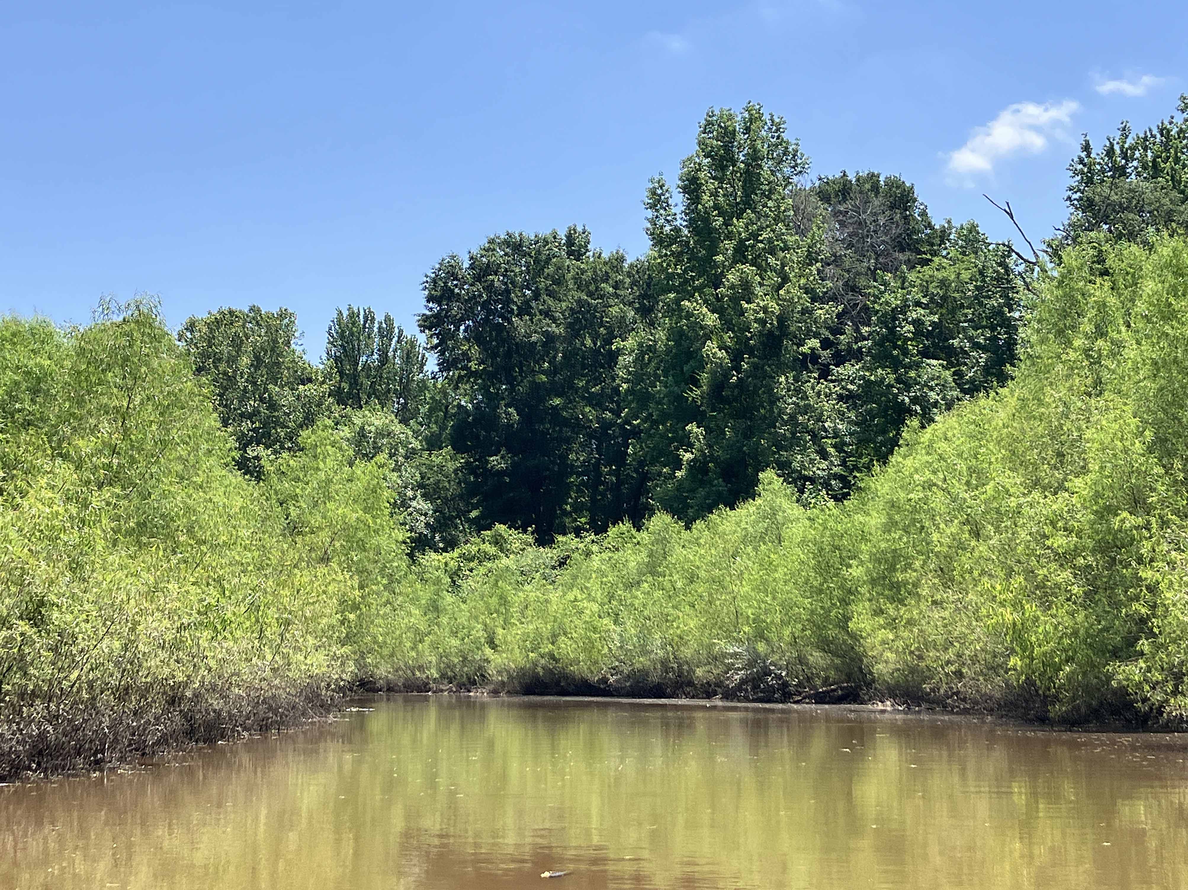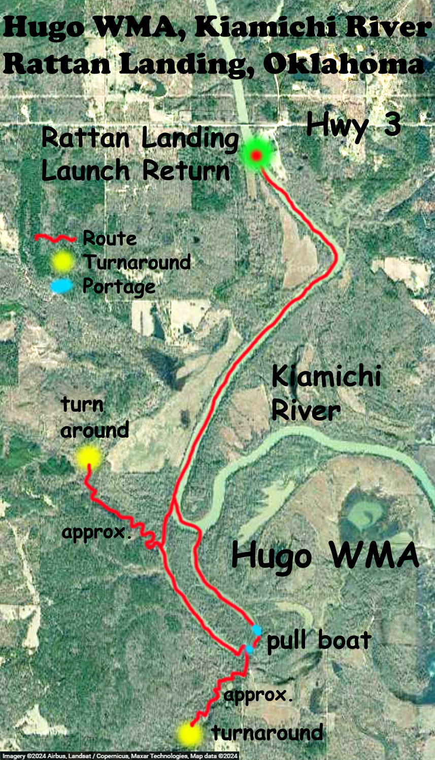 Another route into the Hugo WMA starting from Rattan Landing off Highway 3. This one goes up some streams that flow into the old river, and ultimately makes a loop that comes back around to the Kiamichi itself. Completing the loop required pulling the boat over a section of logs and brush (see picture). The yellow turnaround dots were points at which things became too shallow. Great place!