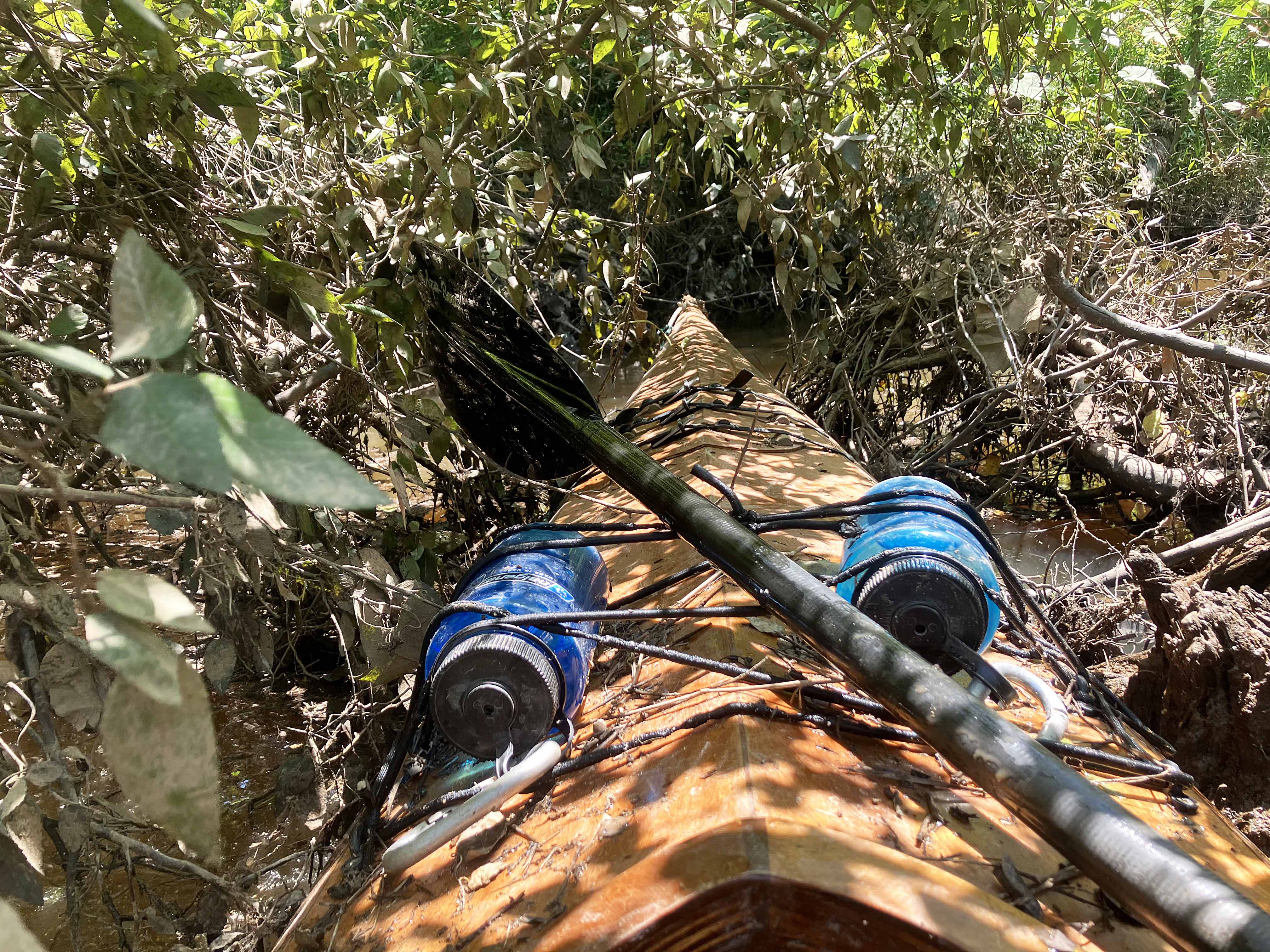 Above: Pulling the boat across a dried up field of brush and branches to complete the route loop.