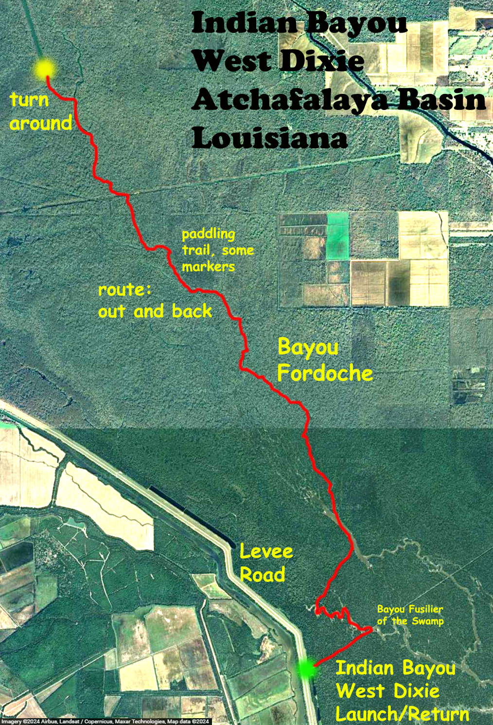This route starts at the West Dixie / Indian Bayou launch north of I10 on Henderson Levee Road. The route follows a Corp of Engineers Indian Bayou trail up to Lake Fordoche and then further up Bayou Fordoche. I did an out and back, turning around at a point where the bayou widened into a long linear canal. It was pretty clear through the entire route where to go, no confusing this-way/that-way options. And at a few points there are paddle trail markers so you know you are in the right place. This is a spectacular trail, deep in the swamp, many alligators, fantastic scenery, and could be done at various water levels and different seasons for a unique experience each time. A return trip here is on the list.