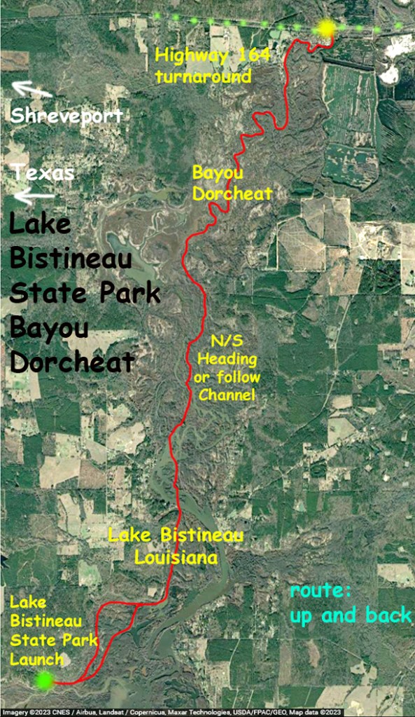 Paddling Lake Bistineau, east of Shrevepoint. Above is a paddle map that does the Bistineau/Dorcheat channel from the state park up to the Highway 164 turnaround. Although this was the goal, you realize there is a lot of area that can be paddled and explored on either side of the channel. And because the whole area runs more or less north-south, going east or west will always get you back to the central channel so that you can reorient yourself. Below the park Bistineau is standard open lake so it’s really this north end that is the best for paddling. Wonderful spot.