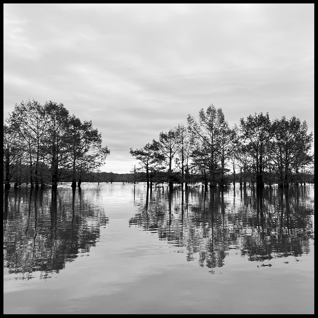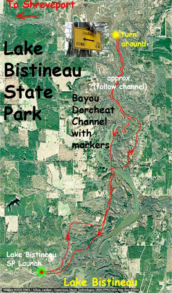 A paddle trail in Lake Bistineau east of Shreveport. This paddle leaves from the state park launch and is just a test excursion on the lake with no particular point other than to explore the woods and shore to the north. The main channel is well marked with signs, shown in the inset in the map above. Lake Bistineau is highly recommended as a paddle spot. I have not seen an alligator here yet though.