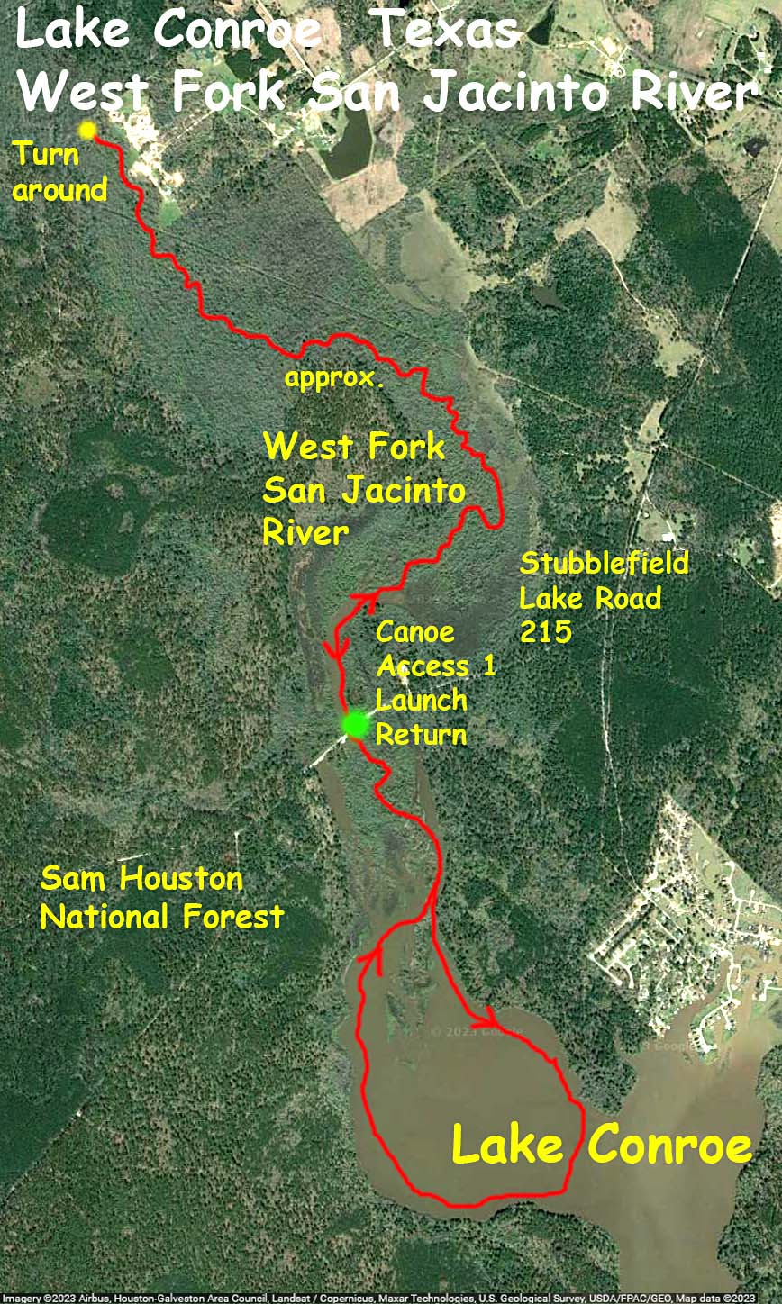 This trip launches at the designated “Canoe Access 1” on Stubblefield Lake Road 215 at the north end of Lake Conroe. Lake Conroe is about 10 miles west of I-45 between Huntsville and Conroe Texas, and 50 miles or so north of Houston. The route goes up into the West Fork of the San Jacinto River and does a loop down at the lake as well. Parking at the launch was a bit limited the time I went, a lot of people were out fishing. Also, upstream, the amount of duckweed and/or watermeal on the river was astonishing, a tub of green. This is a pretty nice little paddle especially if you live in the area, and I saw a couple other guys paddling. I saw no alligators however, and a guy at the launch site who I chatted with said he fished there a lot and had also never seen one (…he had heard of one though).