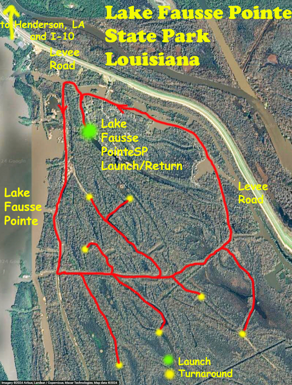 Lake Fausse Pointe State Park is located a bit east of Lafayette LA, and about 20 miles south down Levee Road which hugs the west side of Bayou Chene. This was the first time I had been here; I camped two nights. Food options are limited near the park so (next time) bring something to eat. The route above is basically a circle that follows a suggested park trail, but includes as many possible out and back side channels. Those all dead-ended at some point and the pinned turnaround points are shown as yellow dots on the map. Some of the channels that looked good by satellite were, on-site, not doable. There are gators, gators, and more gators here, which makes it quite a bit of fun. Their presence is routine, especially in comparison to northern TX/LA/AR where populations aren’t as dense. This is after all part of the enormous Atchafalaya basin and real Louisiana swamp. The channels around the park were pretty active with motorboats but so it goes, there is plenty of space. There is also a large lake to the West, Lake Fausse Pointe, for which the park is named, and other access points to the swamps to the east, but those will be for another time.