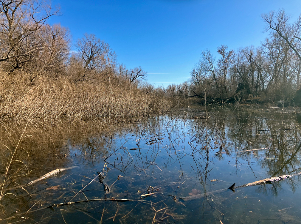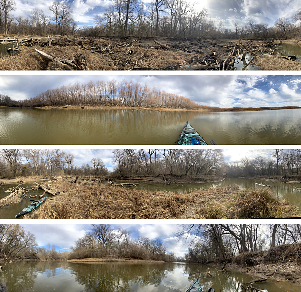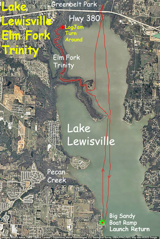 This kayak route launches at the Shady Shores/Big Sandy Boat Ramp on the west side of Lake Lewisville and goes north to the Highway 380 bridge and into the Elm Fork of the Trinity. It may be necessary to use google maps for directions to the launch, driving there is a bit confusing. The paddle route was aiming to find where the Elm Fork of the Trinity flowed in to Lewisville Lake and to go up the river as far as possible. Unfortunately there is a big log jam upstream so you can only go so far before you have to turn around. The region where 380 crosses the lake at the north side had a lot of beaver activity, lots of gnawed trees. This paddle crosses some open regions of the lake, not my favorite thing, and requires care and judgement. One of the links, Center for Cold Water Safety, has a lot of information about open water and cold water safety, extremely important. Nice paddle but too bad about the semi-permanent log jams on the Elm Fork.