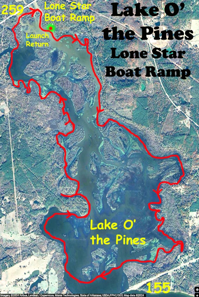 This kayak paddle route map circumnavigates the Lake of the Pines in east Texas (down to the 155 bridge), going around the shore in a clockwise direction. The put-in, and return, are at the Lone Star boat ramp at the lake’s north side. The pictures tell the story. Nice paddle, the only thing to add is that there were a LOT of turtles, their heads were in the water everywhere.