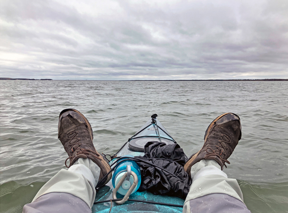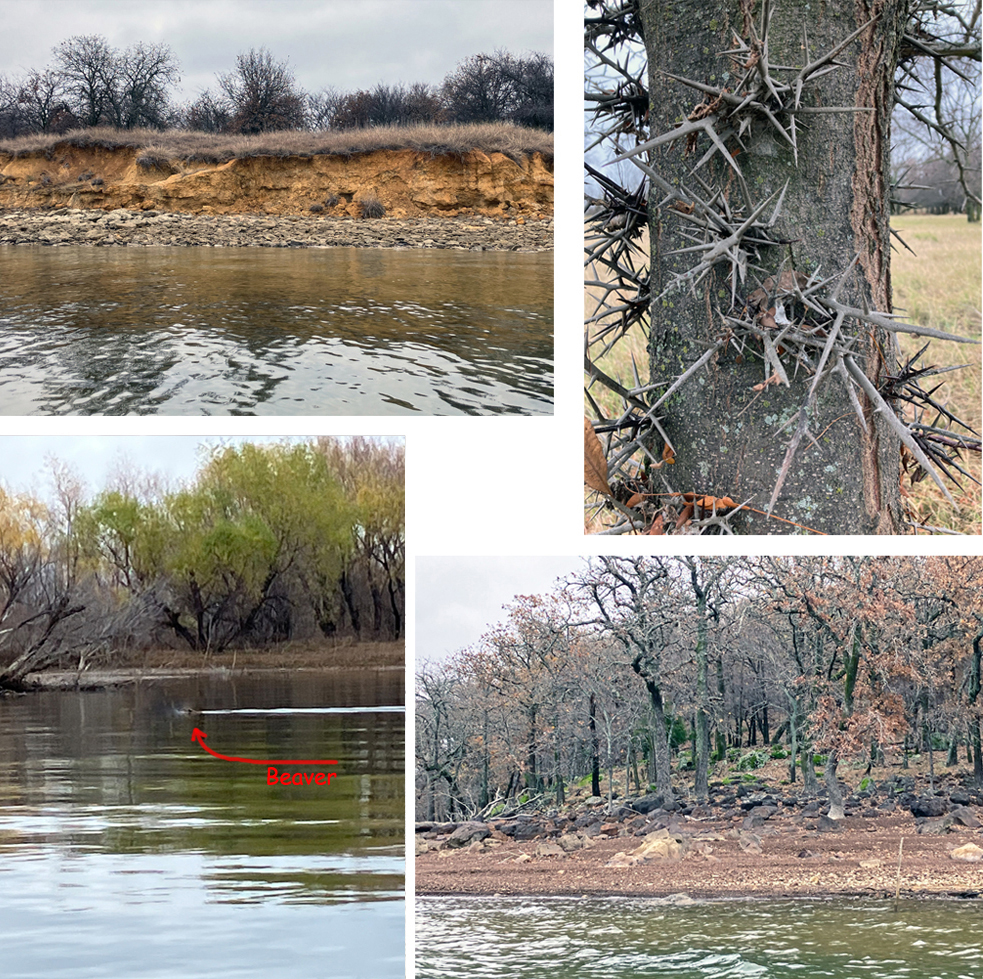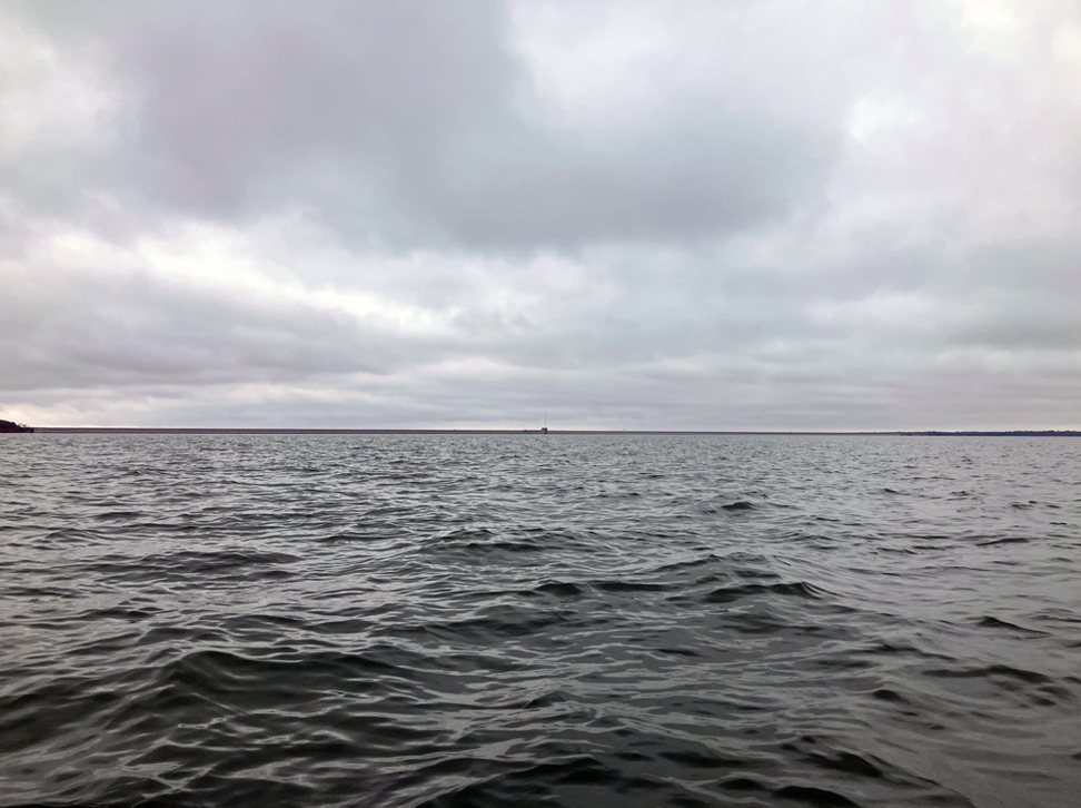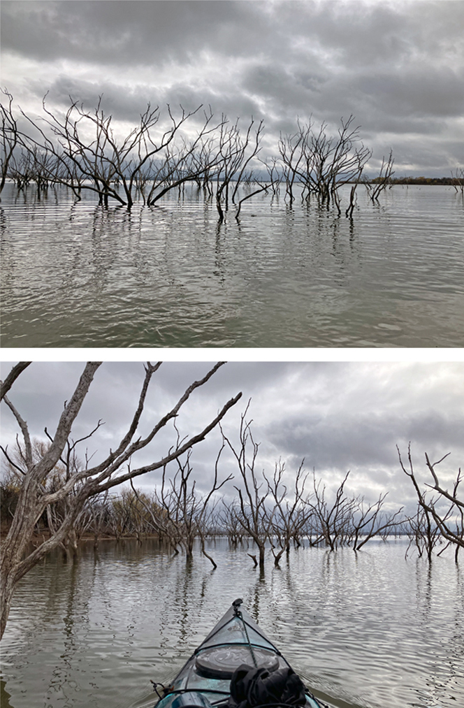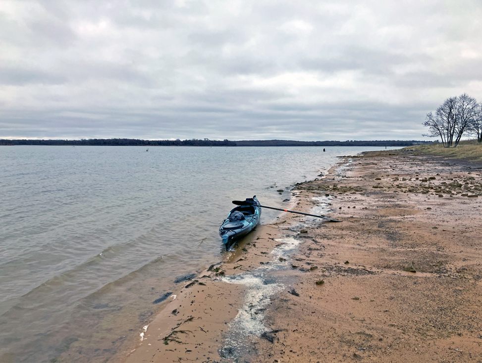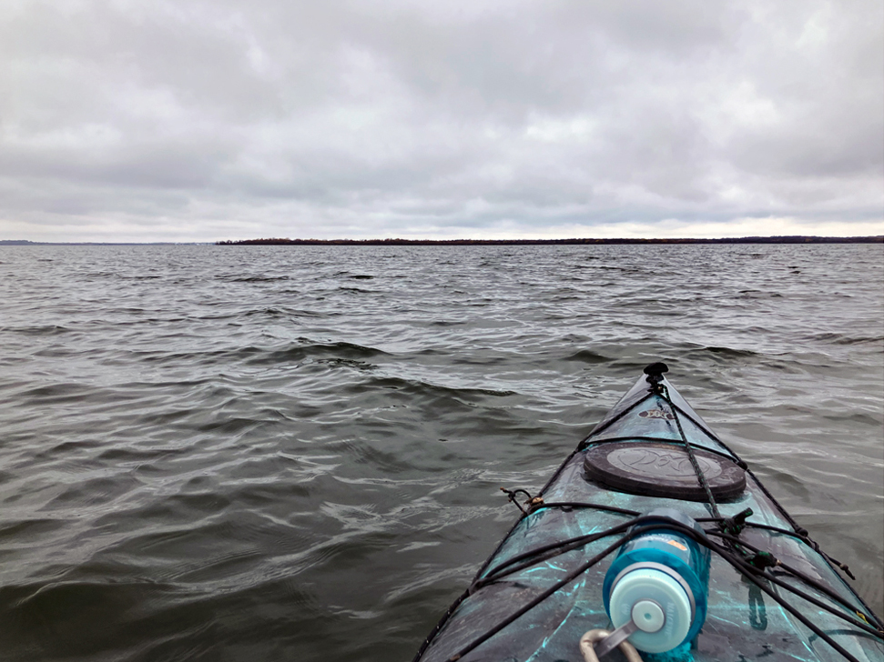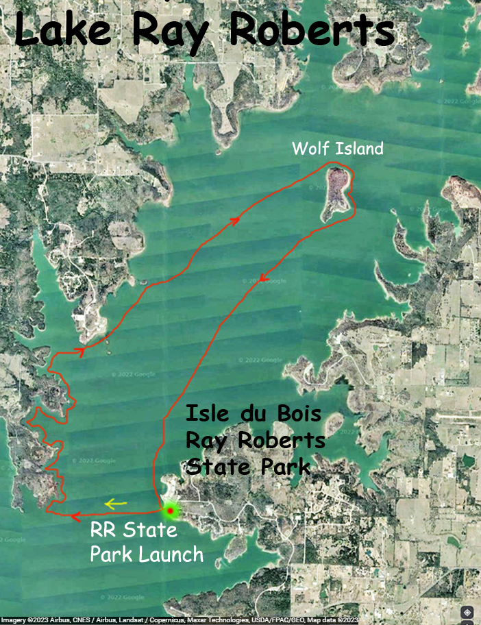 Lake Ray Roberts is one of the big reservoirs in the DFW area and can be accessed using public launch sites within Ray Roberts State Park. The kayak map trail route here is a kind of an arbitrary go across, go up, go down, beginning at the Isle du Bois Unit. This is one of several park units dispersed about the lake, each with different names. The Elm Fork of the Trinity flows out from Ray Roberts and eventually runs into Lake Lewisville. As the pictures show, the open water and sky are fantastic, and the horizon on this lake is a long ways away. Open water crossings, no matter the conditions but especially in the cold, require common sense, judgement, and experience. I tend to avoid them, and one of the links, Center for Cold Water Safety, has all sorts of useful information about cold water and kayak safety. For this particular paddle I am in a dry suit. The route for this paddle went up the west side to Wolf Island, around, and back south down the east side to the launch. Very nice.