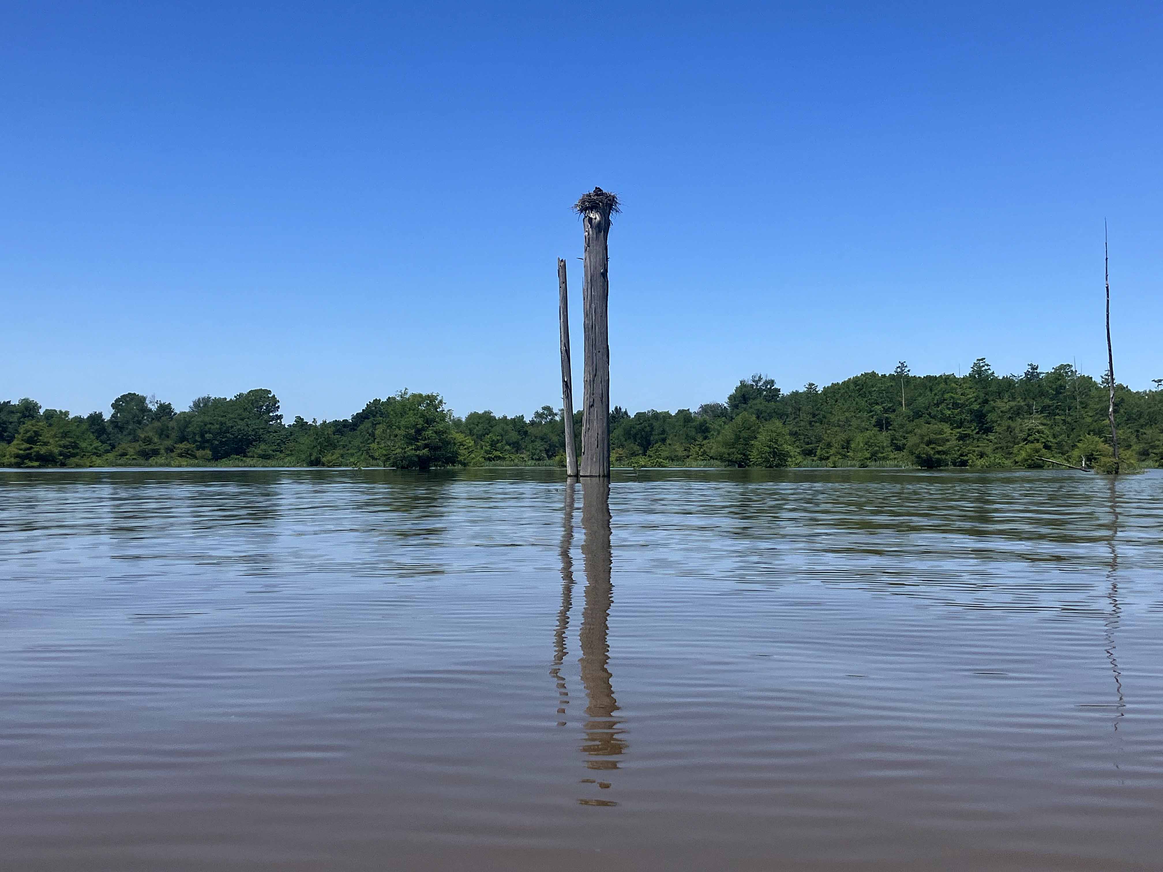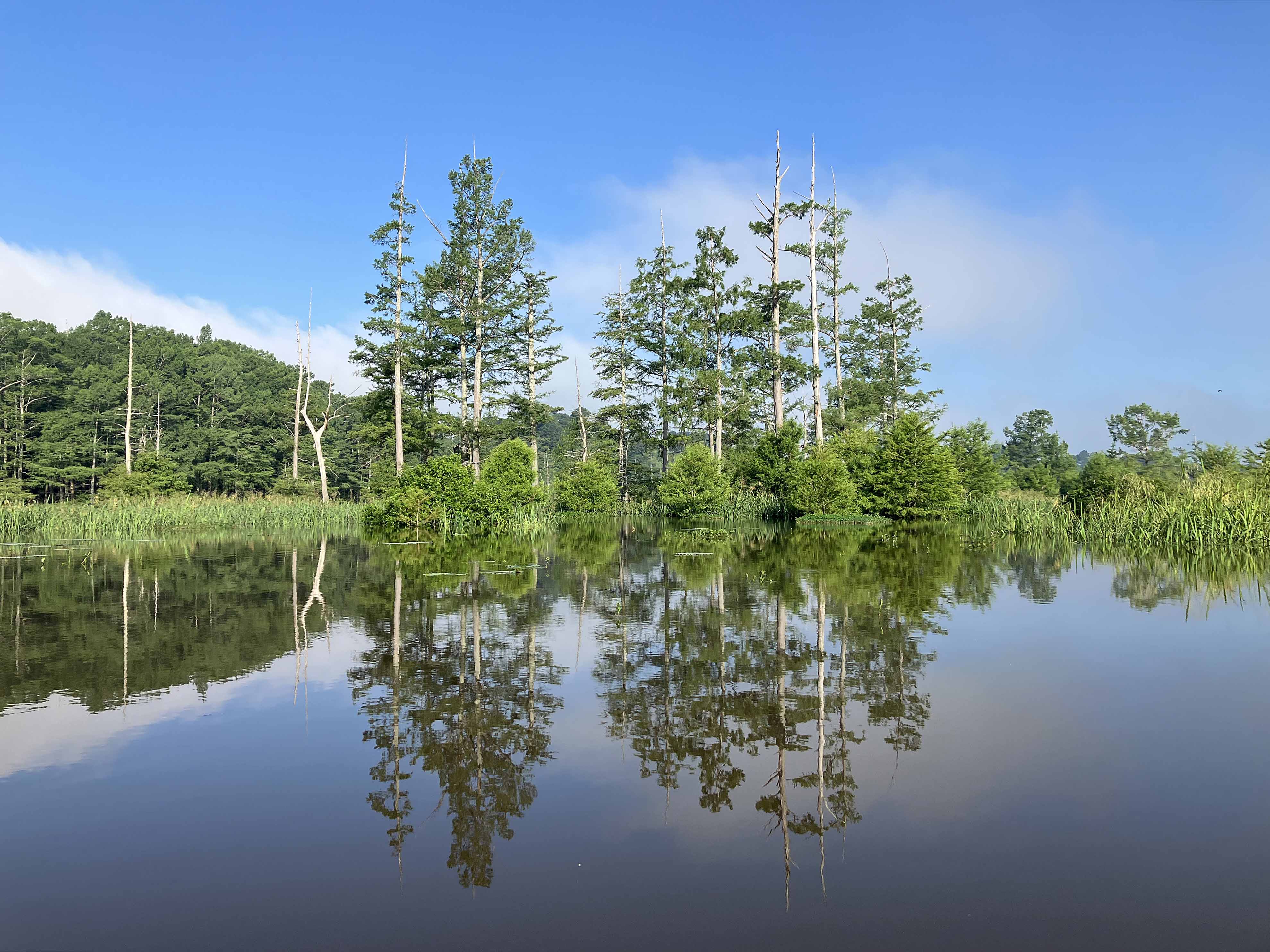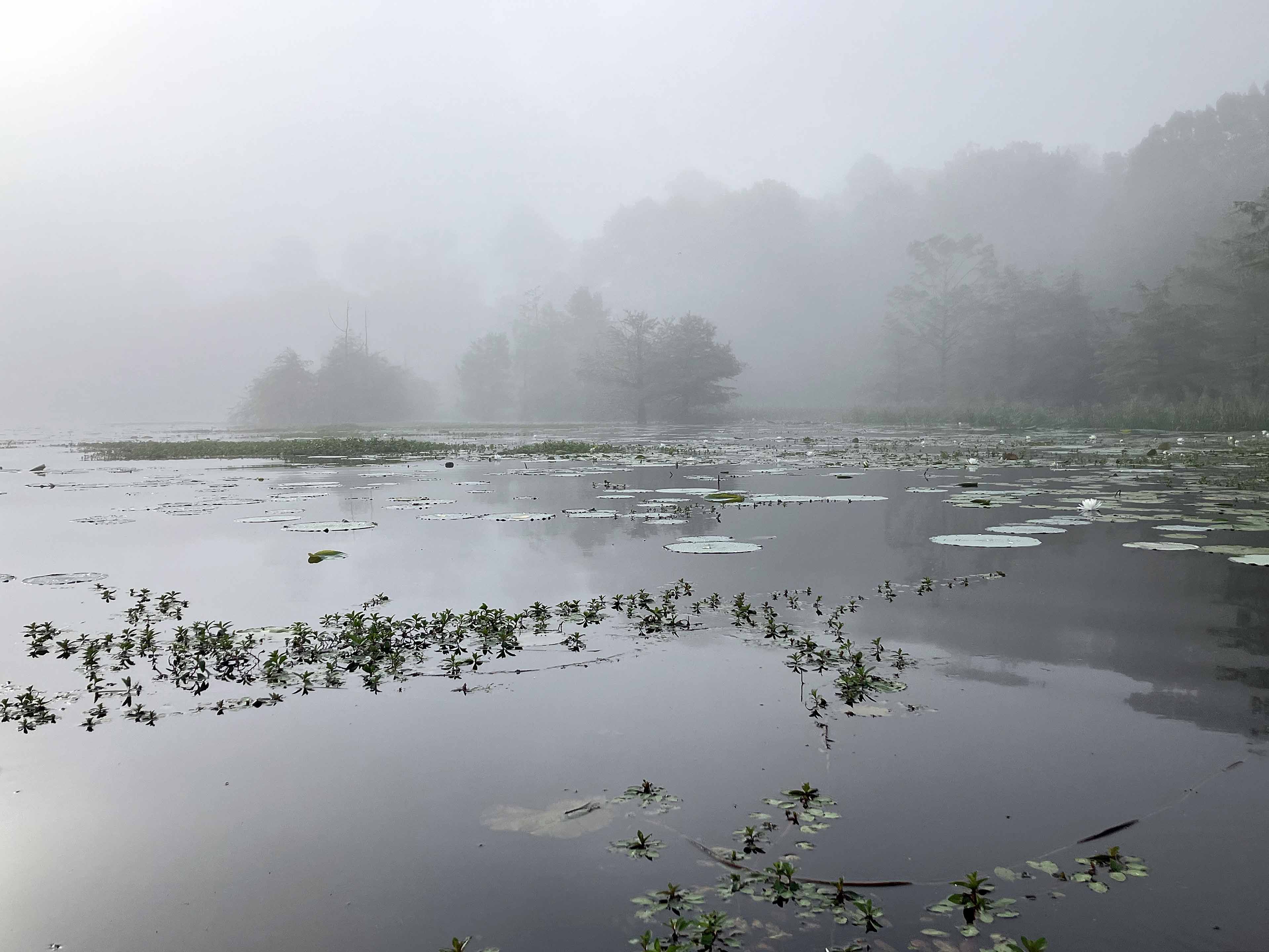 Another paddle trail in the fantastic Little River/Millwood Lake area of southern Arkansas, again starting at Yarborough Landing. I launched early in dense fog, visibility only 75 feet or so, and held close to the shore early on so as not to be hit by a powerboat. Things cleared up later, just beautiful. Some of the small lakes in the northern part of the route are spectacular, although surface vegetation does overrun some areas. A picture below also shows a night paddle excursion into Pond Creek near the primitive campsite where I stayed. Earlier that evening a big gator slowly drifted from one end of this pond to the other, moving N to S and carefully watching the campsite area. But later, in the dark, on the water, I saw no reflective eyes, and I am here to tell of it, so he had evidently moved on. Another picture below shows one of weirdest things ever,…a snake way way up on a dead cypress tree trunk, climbing (squishing?) higher and higher, looking hole by hole for eggs or hatchlings, I suppose. The body convolutions are crazy, and it almost fell off several times. Super trip.