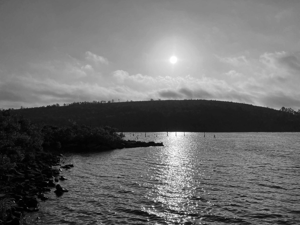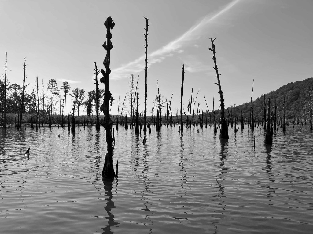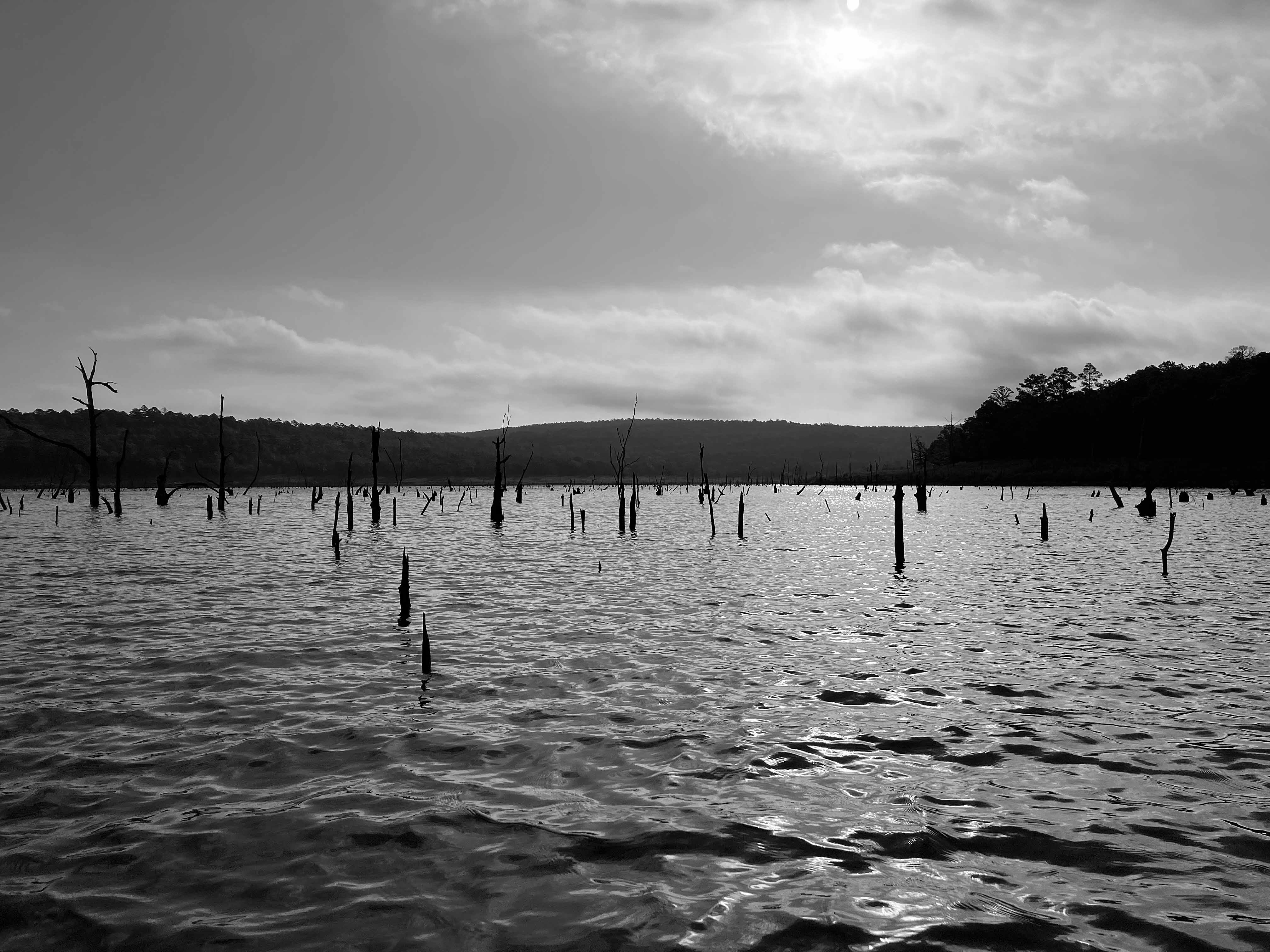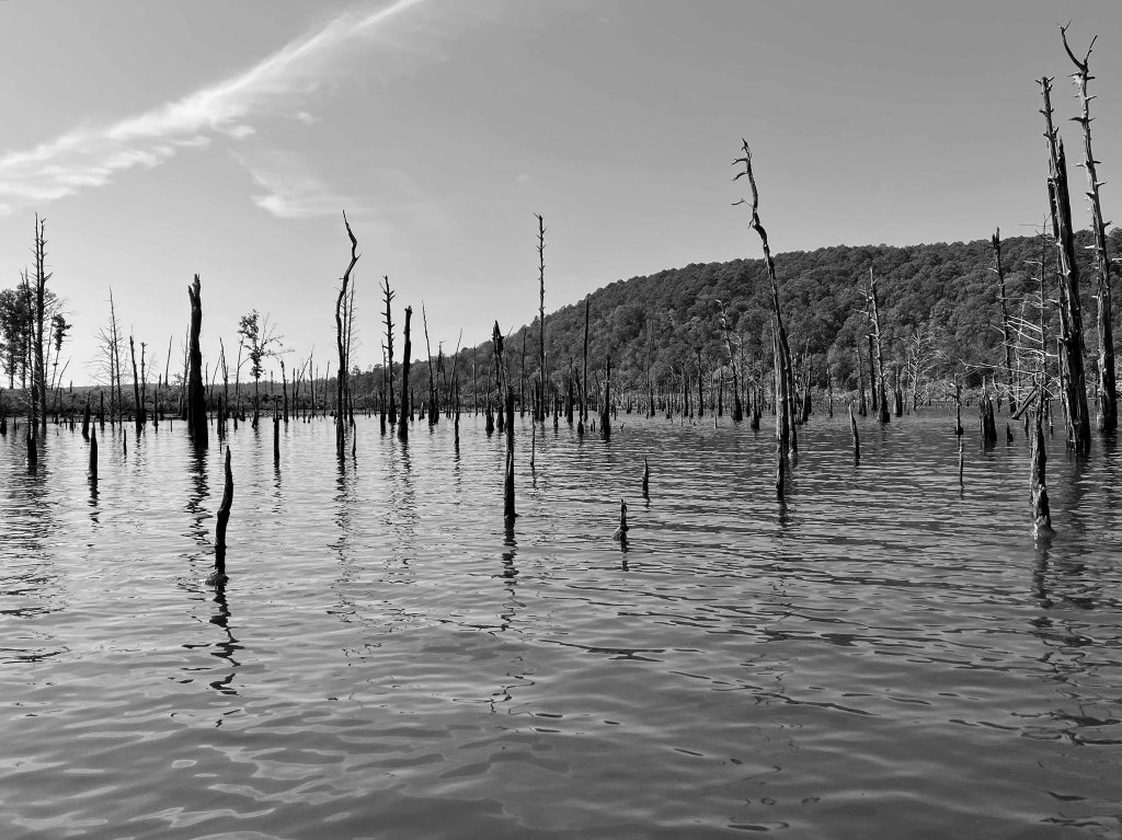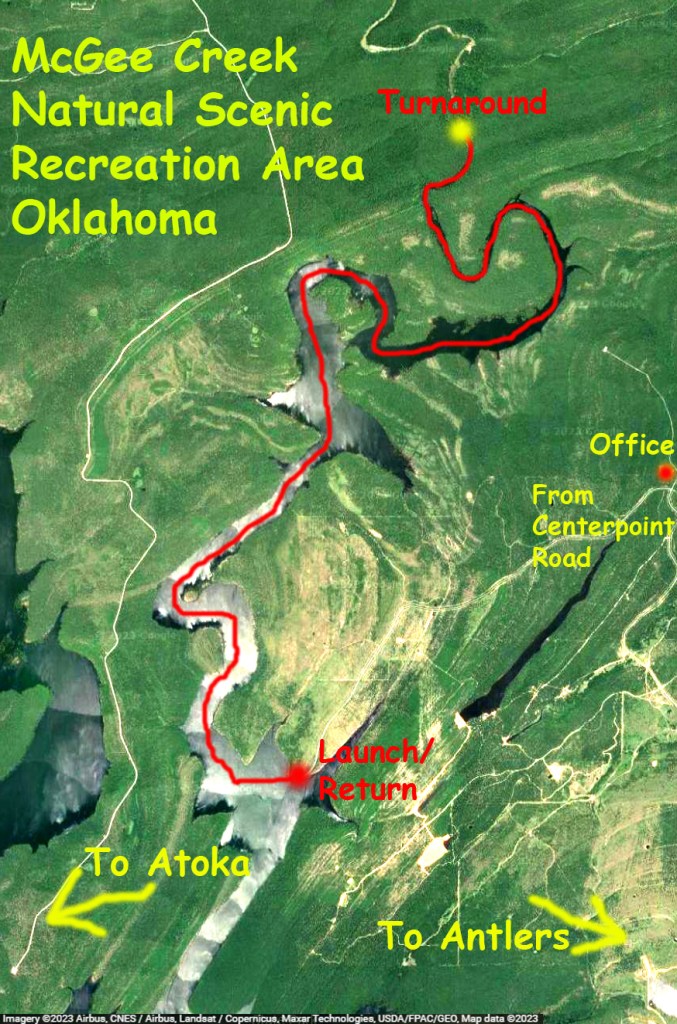 McGee Creek Lake, or Reservoir, in Oklahoma, is between Atoka and Antlers. It is divided into two halves, east and west, by a southward projecting peninsula. The above map shows a kayak trip on the east side of the lake, in the McGee Creek Natural (not National) Scenic Recreation Area (NRSA). The launch is found by taking Centerpoint Road off of Highway 3, which runs between Atoka and Antlers. Centerpoint Road goes north about 10 miles to a park station with restrooms, but slightly before that there is a junction going west which actually leads to the launch site. This place is remote and lonely, do not make a mistake here. You can paddle up McGee Creek Lake to the turnaround point shown on the map above, but you can’t go further. Its all flatwater paddling, isolated, and the lake is filled with old trees that can hang you up without notice. Which can be interesting once you get used to it. The pictures below give a pretty good idea of how it is. There are also some primitive hiking trails here which are rather nice. Beautiful place, and remote.