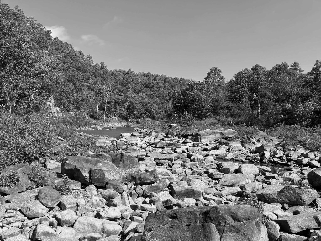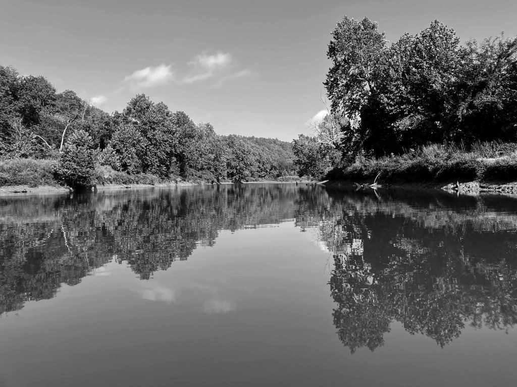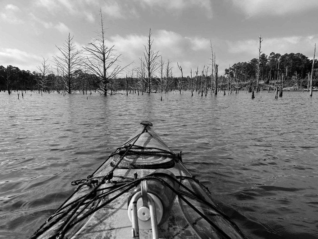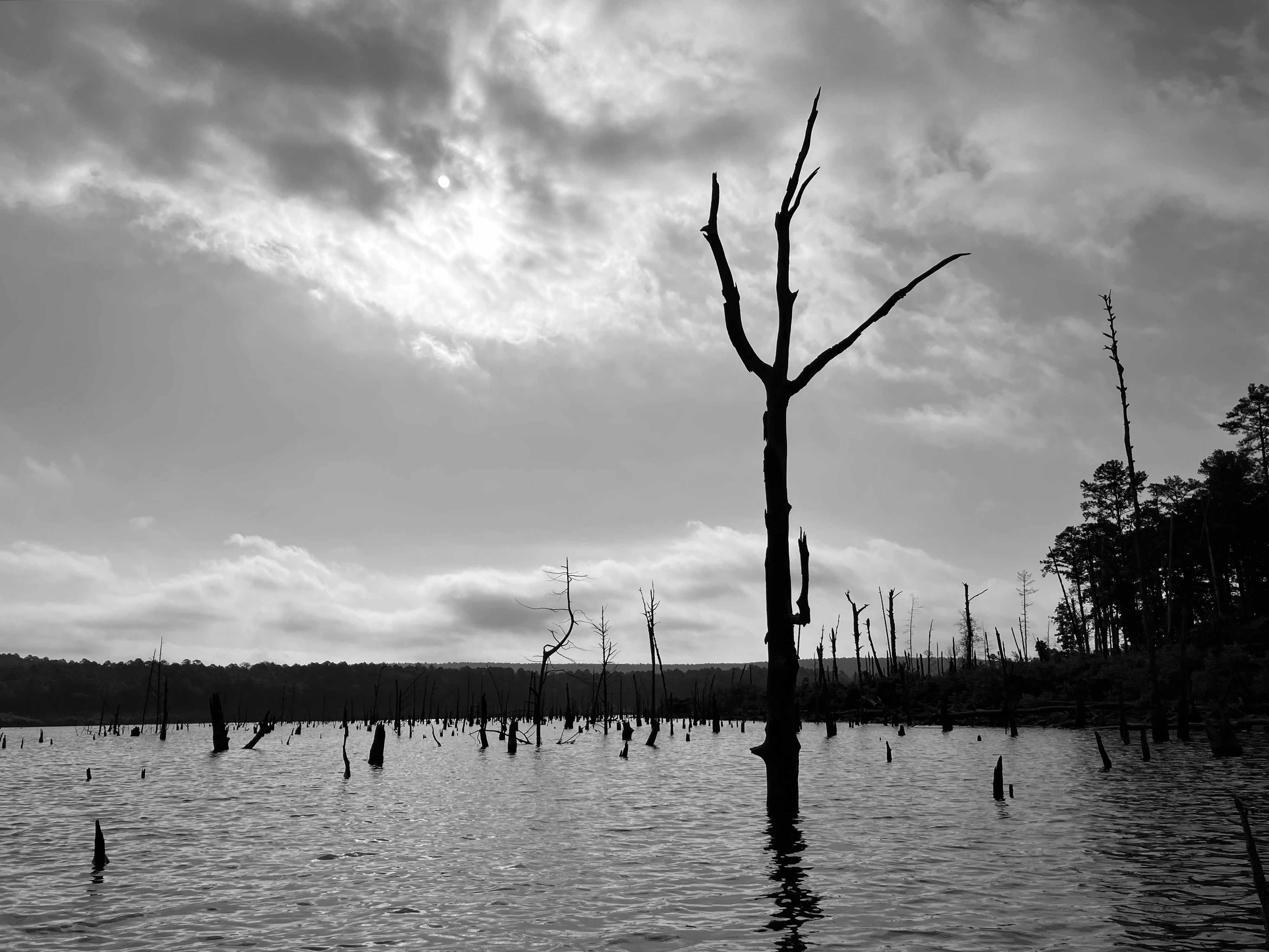McGee Creek Lake, or Reservoir, in Oklahoma, is between Atoka and Antlers. It is divided into two halves, east and west, by a southward projecting peninsula. The above map shows a kayak trip on the east side of the lake, in the McGee Creek Natural (not National) Scenic Recreation Area (NRSA). The launch is found by taking Centerpoint Road off of Highway 3, which runs between Atoka and Antlers. Centerpoint Road goes north about 10 miles to a park station with restrooms, but slightly before that there is a junction going west which actually leads to the launch site. This place is remote and lonely, do not make a mistake here. You can paddle up McGee Creek Lake to the turnaround point shown on the map above, but you can’t go further. Its all flatwater paddling, isolated, and the lake is filled with old trees that can hang you up without notice. Which can be interesting once you get used to it. The pictures below give a pretty good idea of how it is. There are also some primitive hiking trails here which are rather nice. Beautiful place, and remote.