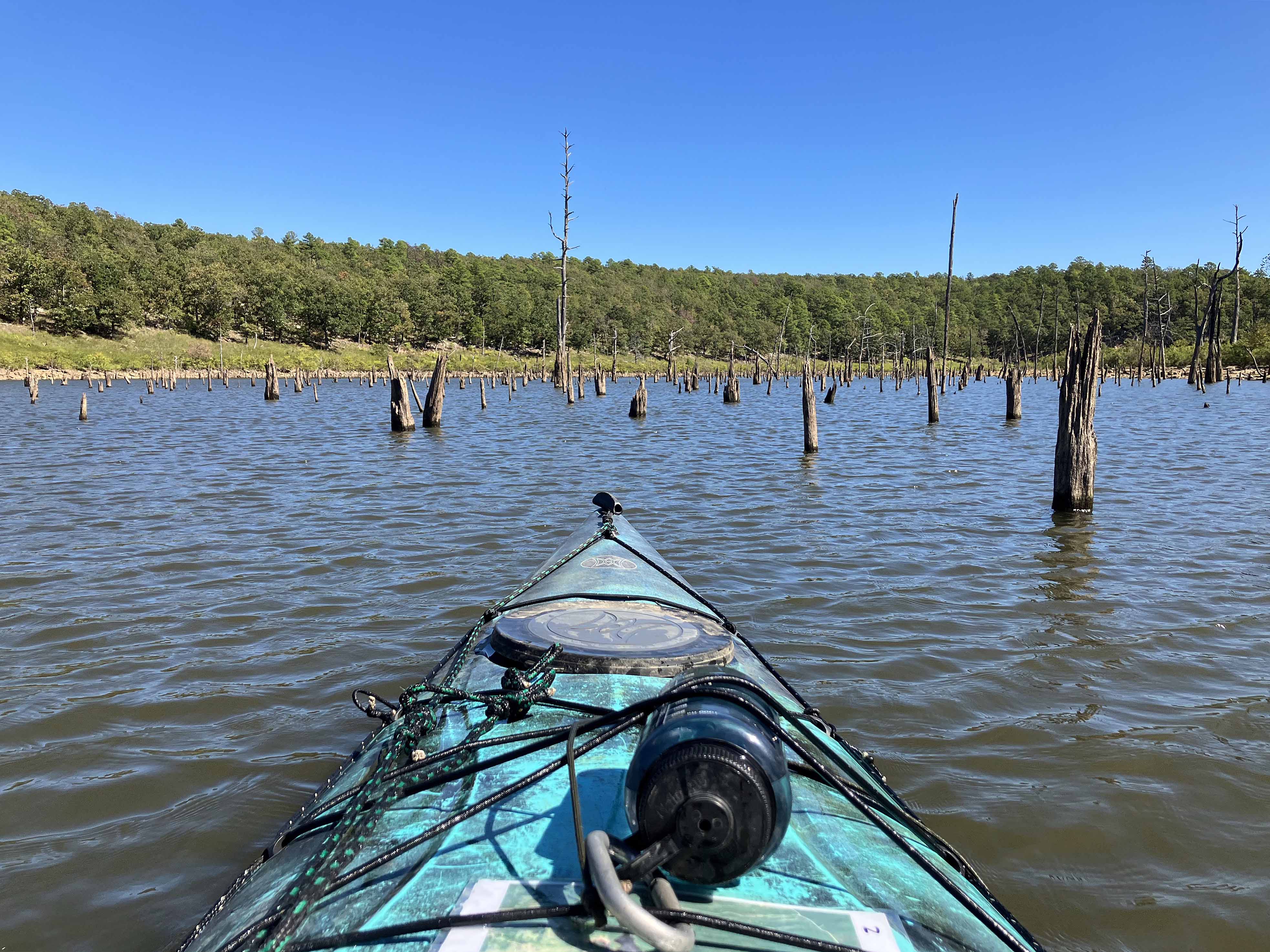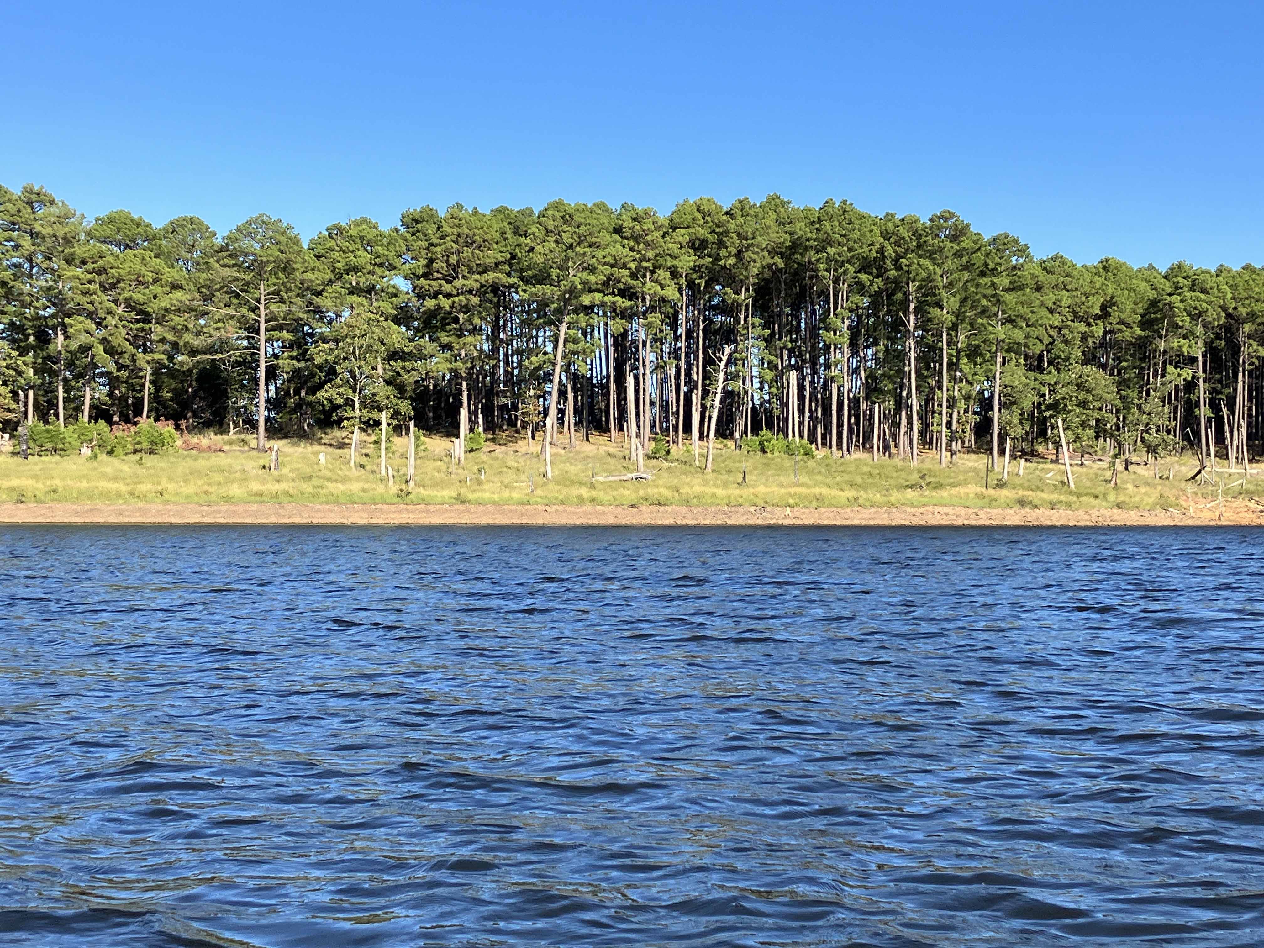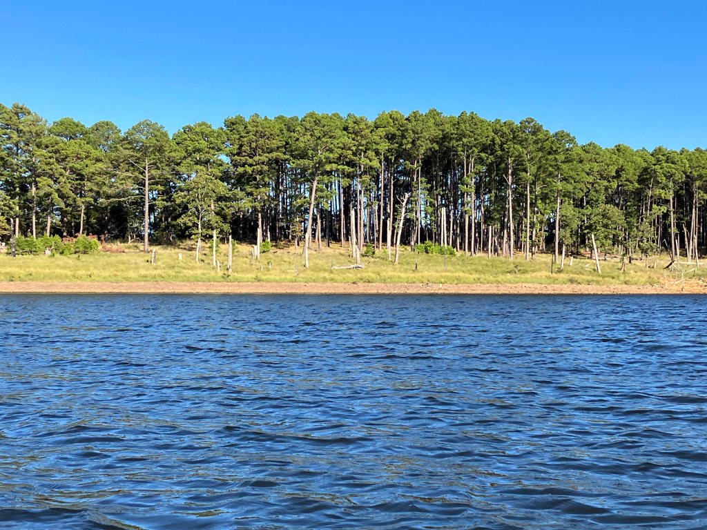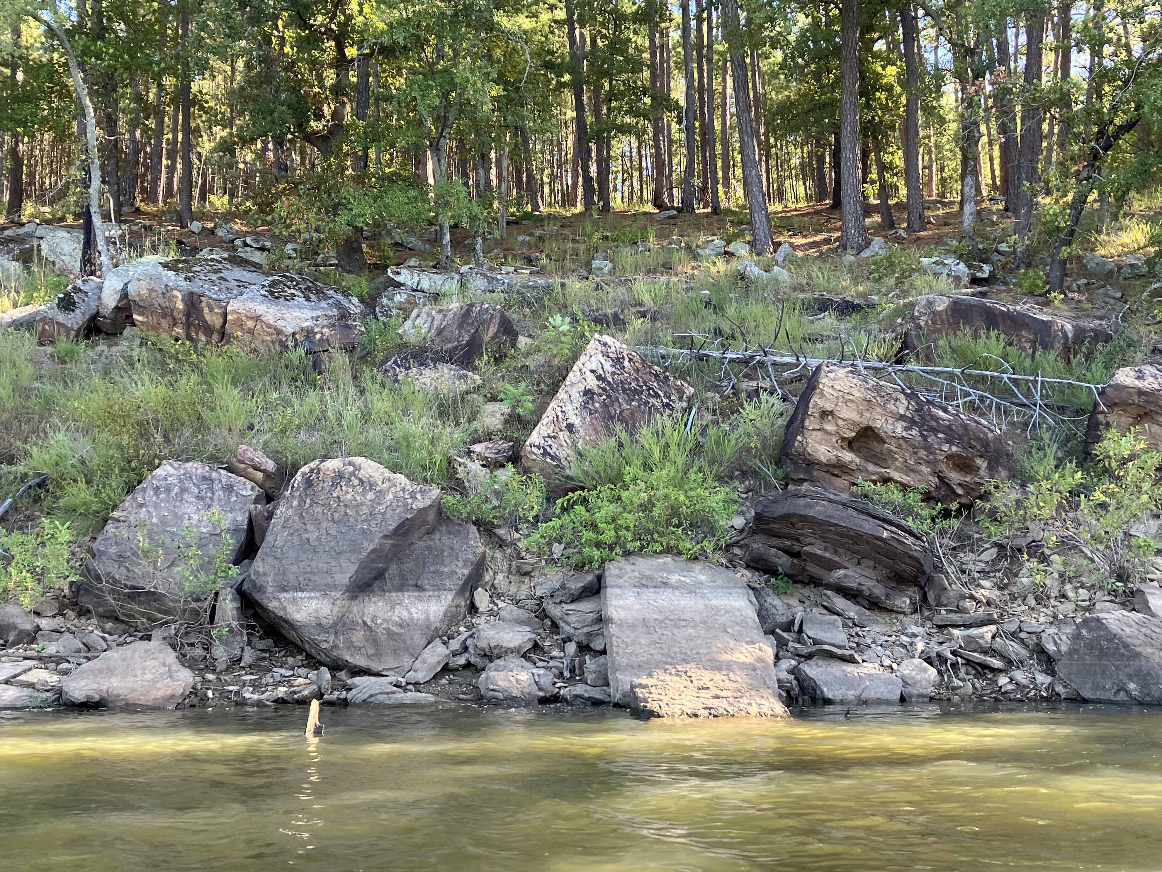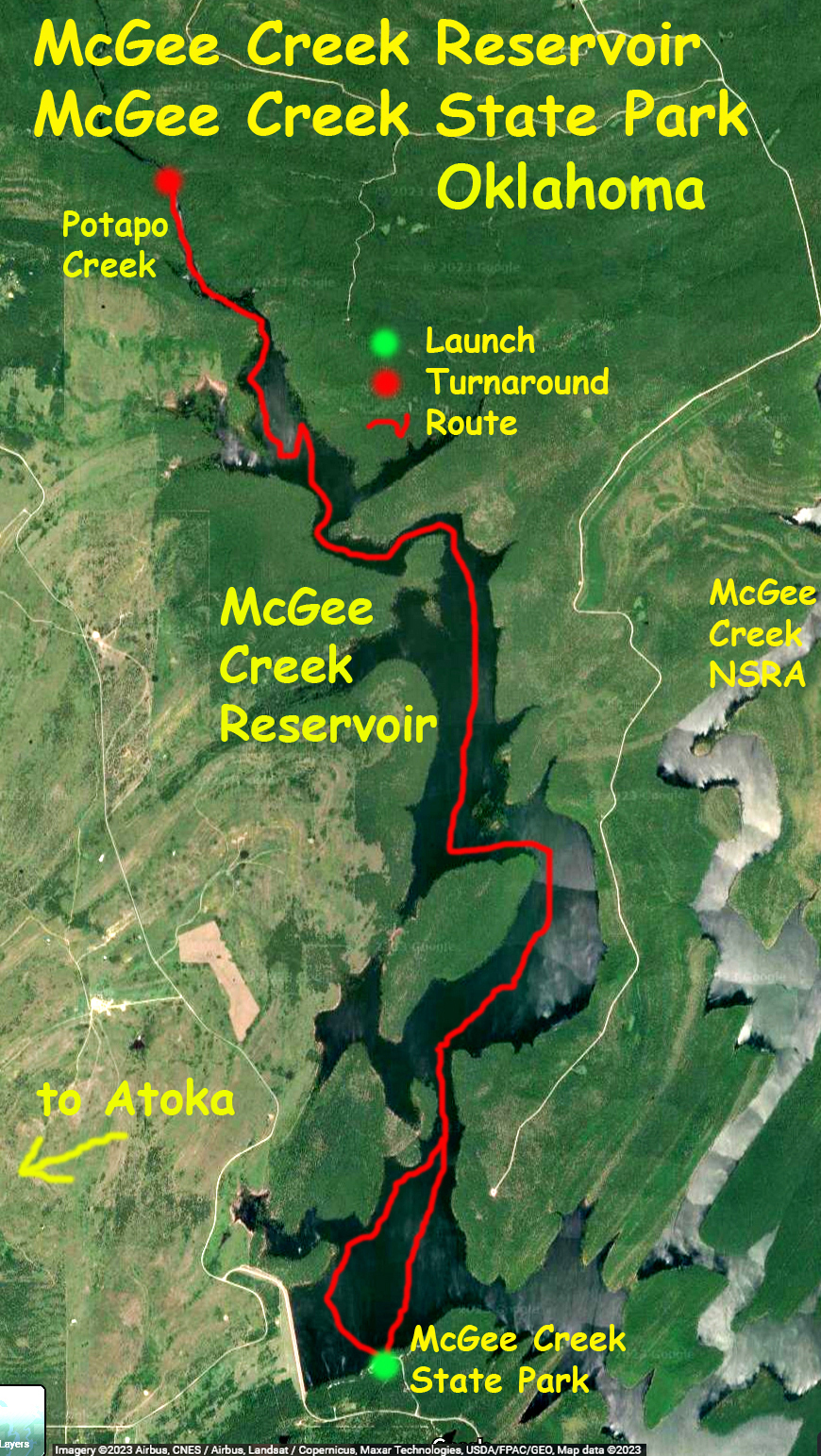 Kayak route taken on the west side of McGee Creek Lake/Reservoir in Oklahoma. The launch is in McGee Creek State Park, there is a nice big boat ramp there. You can paddle up to where Potapo (not Potato) Creek comes into the lake. Like the east side, the turnaround point here is all the sudden, very rocky, and you can’t go any further. The place is beautiful, very remote, and you don’t want to get into trouble out here. There are lots of trees in the water that can hang you up and high center on, and while this can be startling at first, it’s kind of interesting once you know what to expect. Cane Break Road leads down the central peninsula from the North (the white line going north to south in the above map). The road is very pretty but there is no lake access that I could find. It took me a five hours drive up and back from Dallas one day just to realize that, ugh.