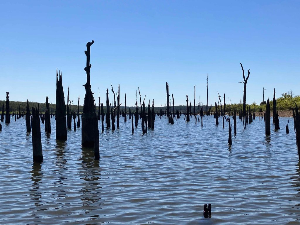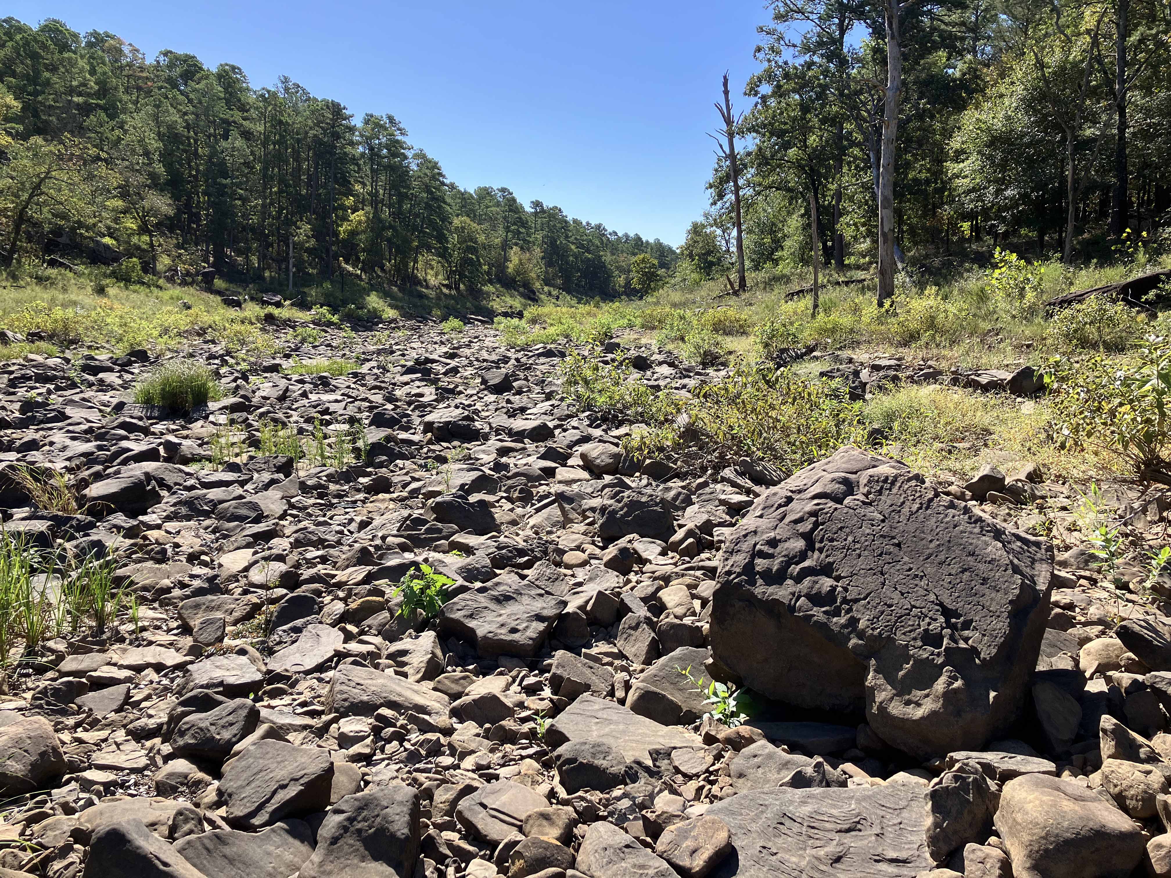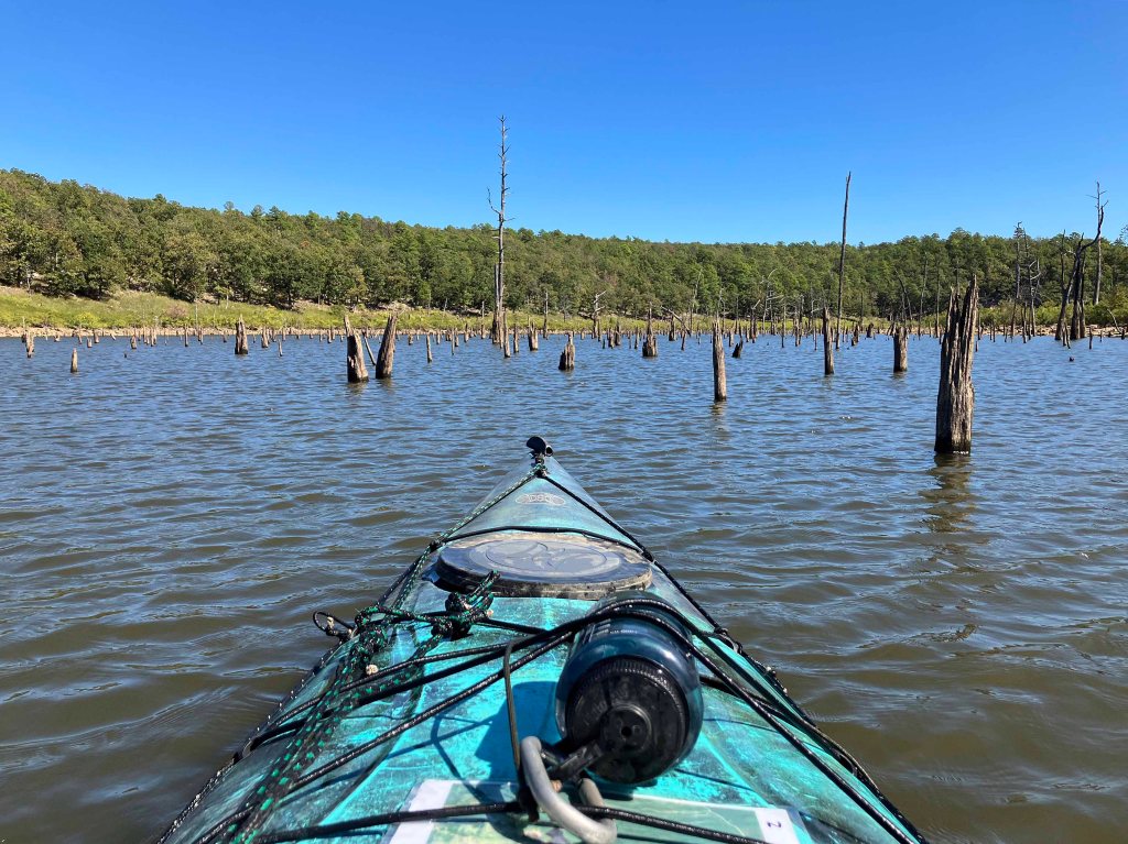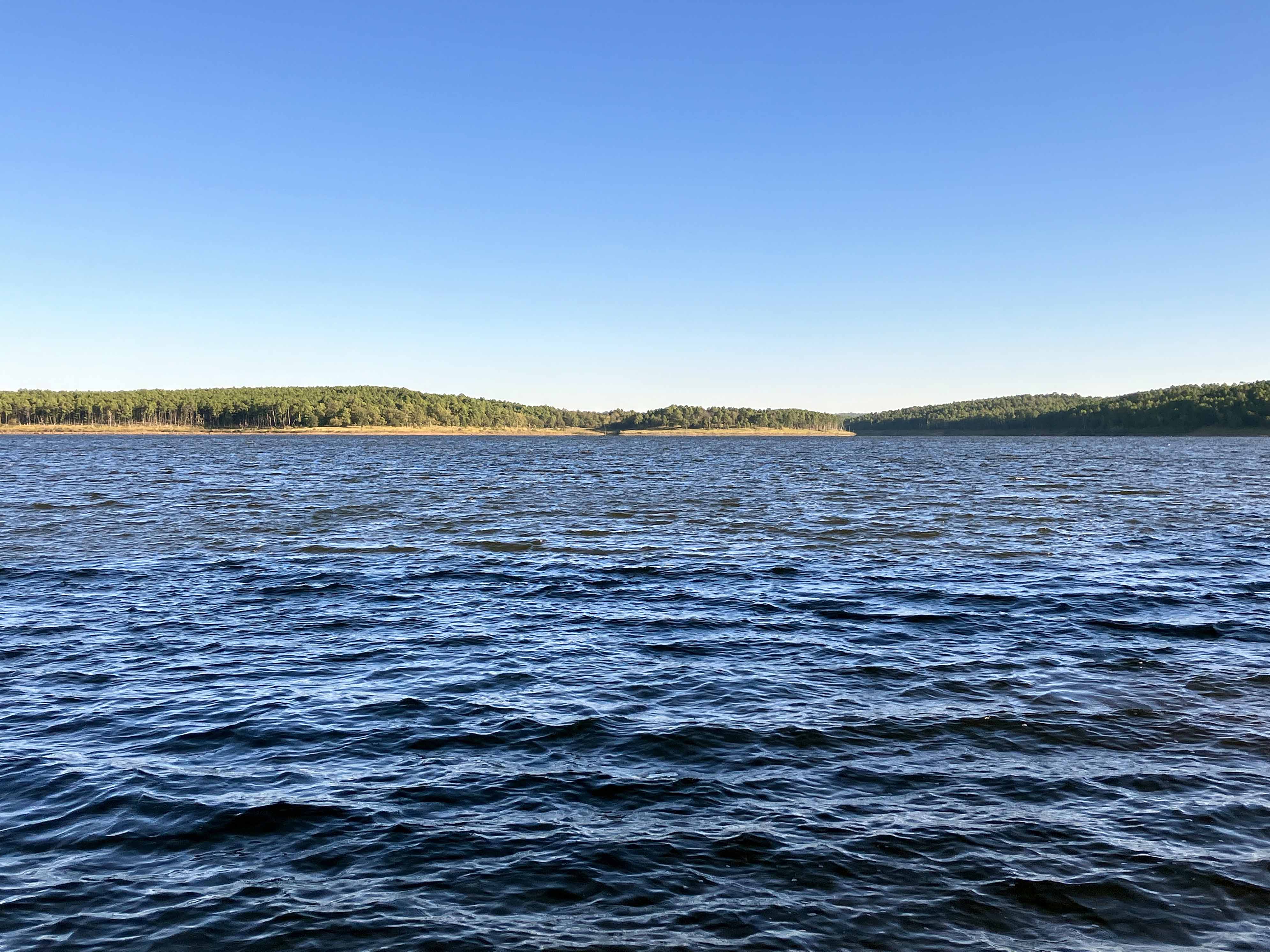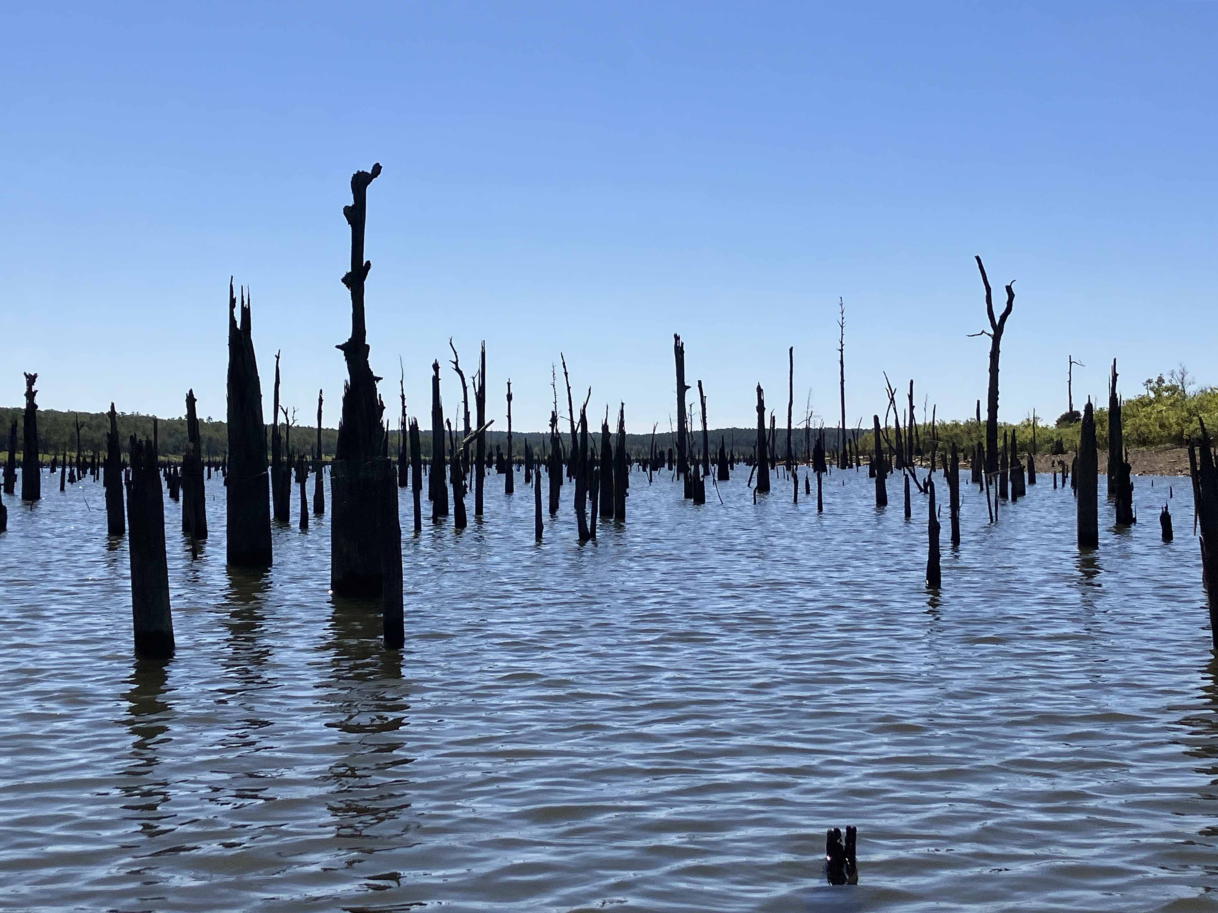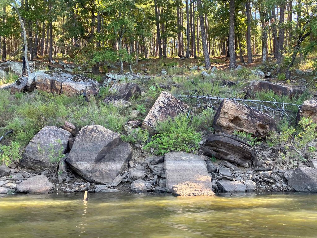 Kayak route taken on the west side of McGee Creek Lake/Reservoir in Oklahoma. The launch is in McGee Creek State Park, there is a nice big boat ramp there. You can paddle up to where Potapo (not Potato) Creek comes into the lake. Like the east side, the turnaround point here is all the sudden, very rocky, and you can’t go any further. The place is beautiful, very remote, and you don’t want to get into trouble out here. There are lots of trees in the water that can hang you up and high center on, and while this can be startling at first, it’s kind of interesting once you know what to expect. Cane Break Road leads down the central peninsula from the North (the white line going north to south in the above map). The road is very pretty but there is no lake access that I could find. It took me a five hours drive up and back from Dallas one day just to realize that, ugh.
