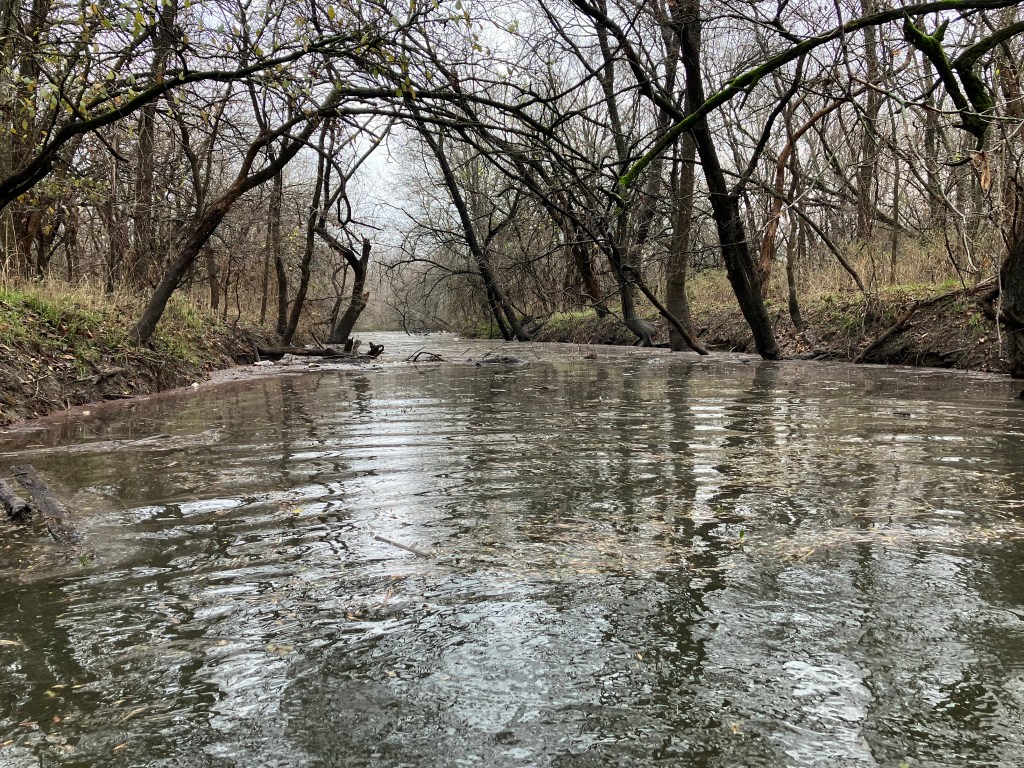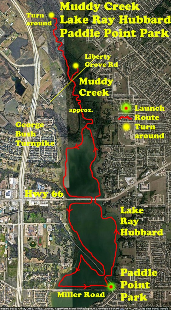 Paddle Point Park is a popular kayak and canoe and paddleboard launch site off of Miller Road in Rowlett. There is almost always someone else paddling here, and there is a kayak rental place nearby. The park launches into a small inlet of Lake Ray Hubbard which is pretty well wind protected. You can go north under the tracks and explore the lake and Muddy Creek, or south into the lake. The route in the above map goes up pretty far into Muddy Creek to the north, then circles the west shore of the lake back around to the put-in. The area where Muddy Creek flows into the lake is sometimes too shallow to paddle, but when water is high enough the brushy areas here can be fun to explore. The entrance to Muddy Creek is one of the prettiest places around. How far up the creek you can go will vary with flow rate and water level, but usually you can make it at least to Liberty Grove Road if you don’t mind going around a log or two. At Liberty Grove there is a pond to the right but that direction ends pretty quickly. If you go north here you can explore more of the Creek.