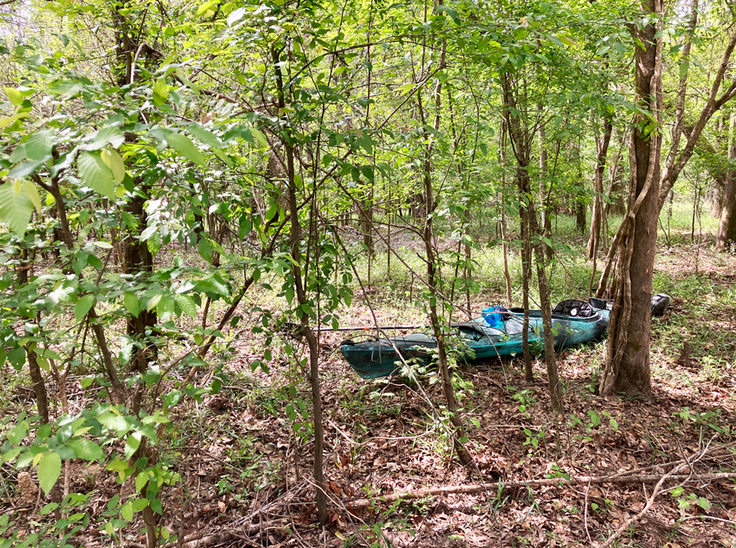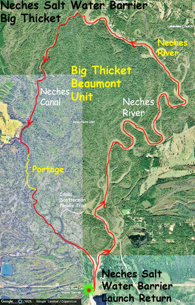 This kayak paddle trail starts at the Salt Water Barrier on the Neches River near Beaumont Texas. There is a short TPWD trail here, Cooks/Scatterman (which connects via the white line in map above). However, the route here is longer and goes around the Beaumont Unit of the Big Thicket National Preserve, first up the Neches River, then down the Neches Canal which connects at the top. Midway down the canal the route takes an inlet going east and when that ends there the route portages across to the other side of the island before continuing south. The location of the portage was chosen because the map showed a couple interior channels sat kind of head to head which might shorten the haul (the alternative, no portage, go all the way around, which was a longer paddle). I got kind of disoriented during the portage however and that took a bit to get resituated. And at one point two very large dogs showed up, angry and barking. There was a gully between us and they didn’t cross, thankfully, but how how did two dogs get on the island, doing what, is there someone else here? A bit disturbing. And when I got back to parking lot at the Salt Water Barrier one of the tires on my car was flat. Well.